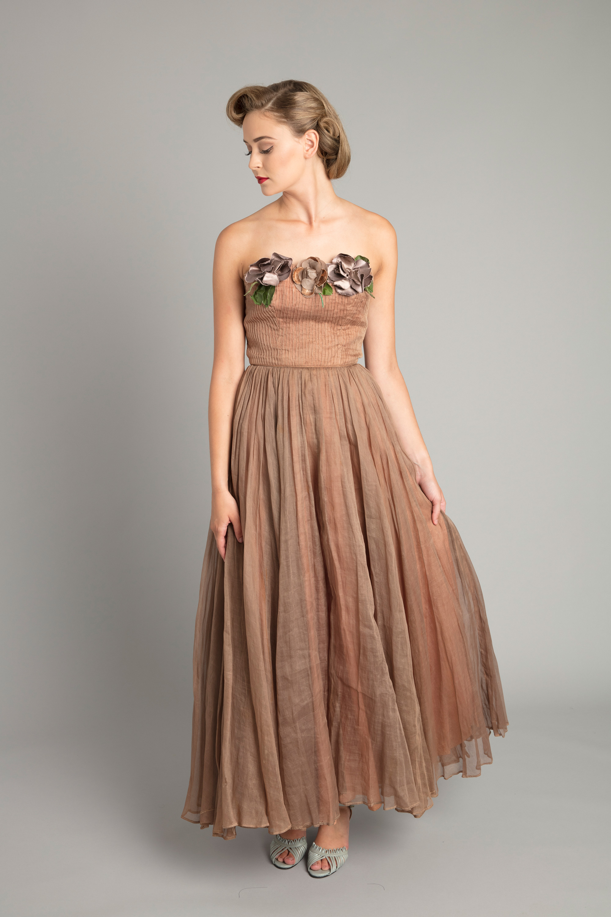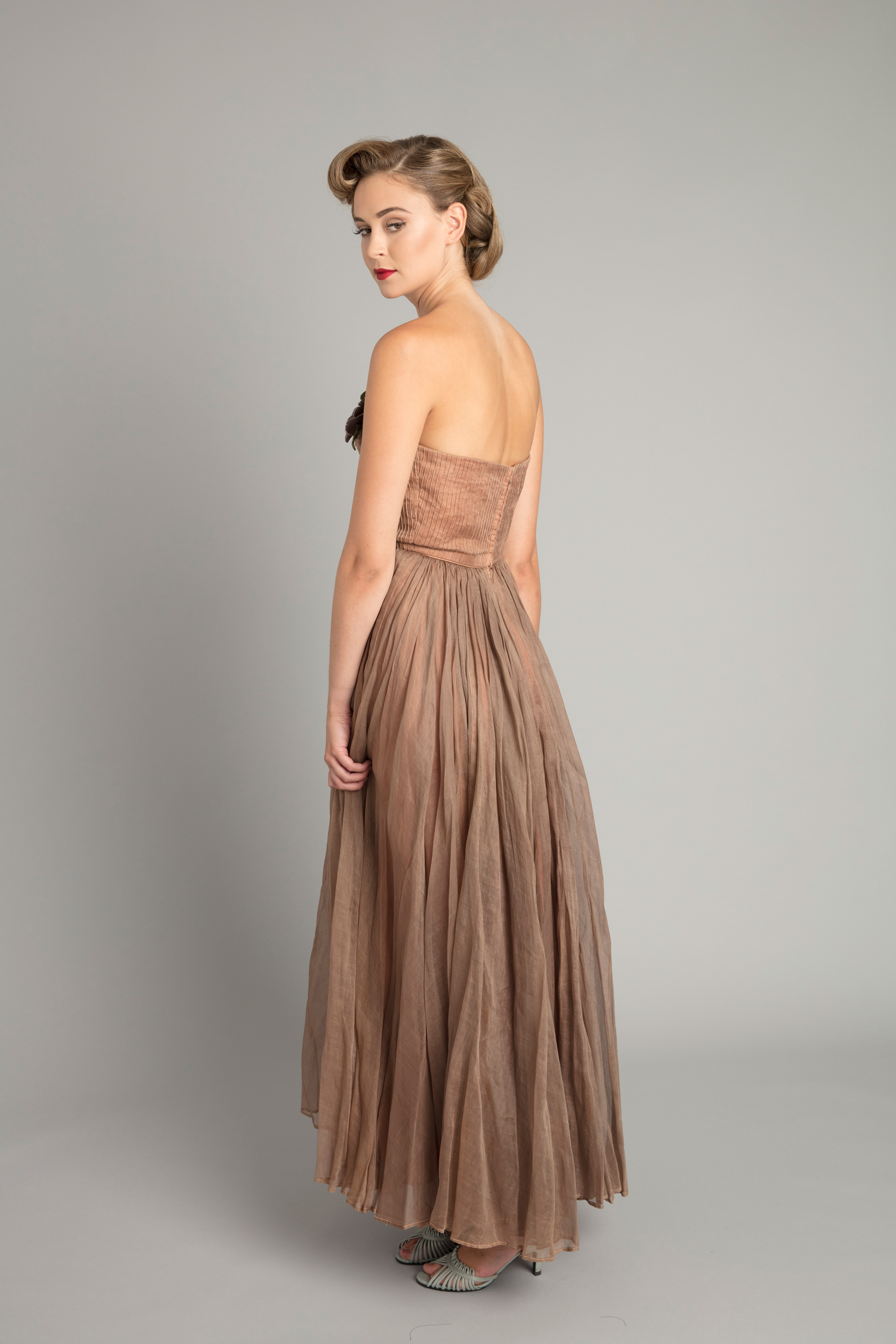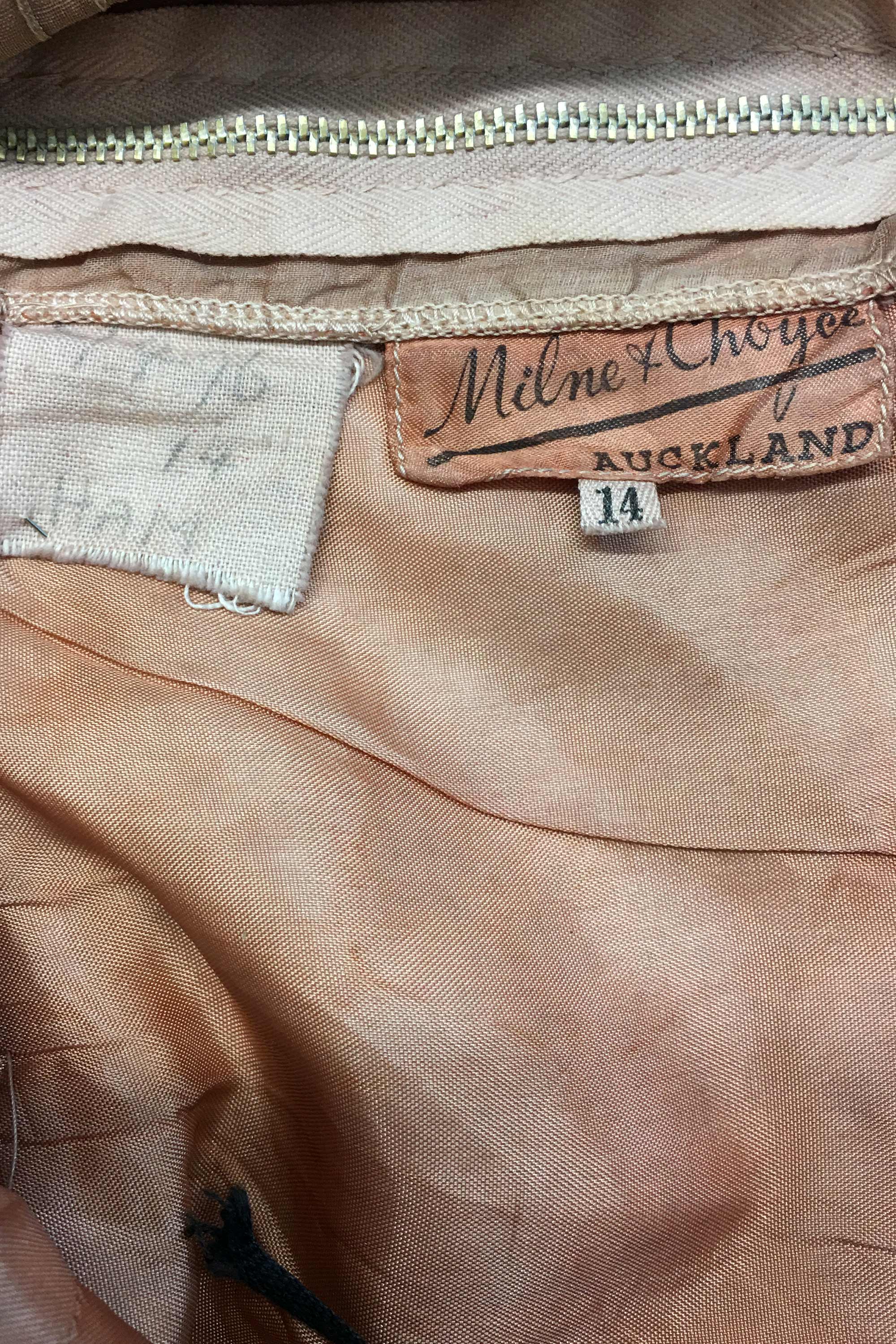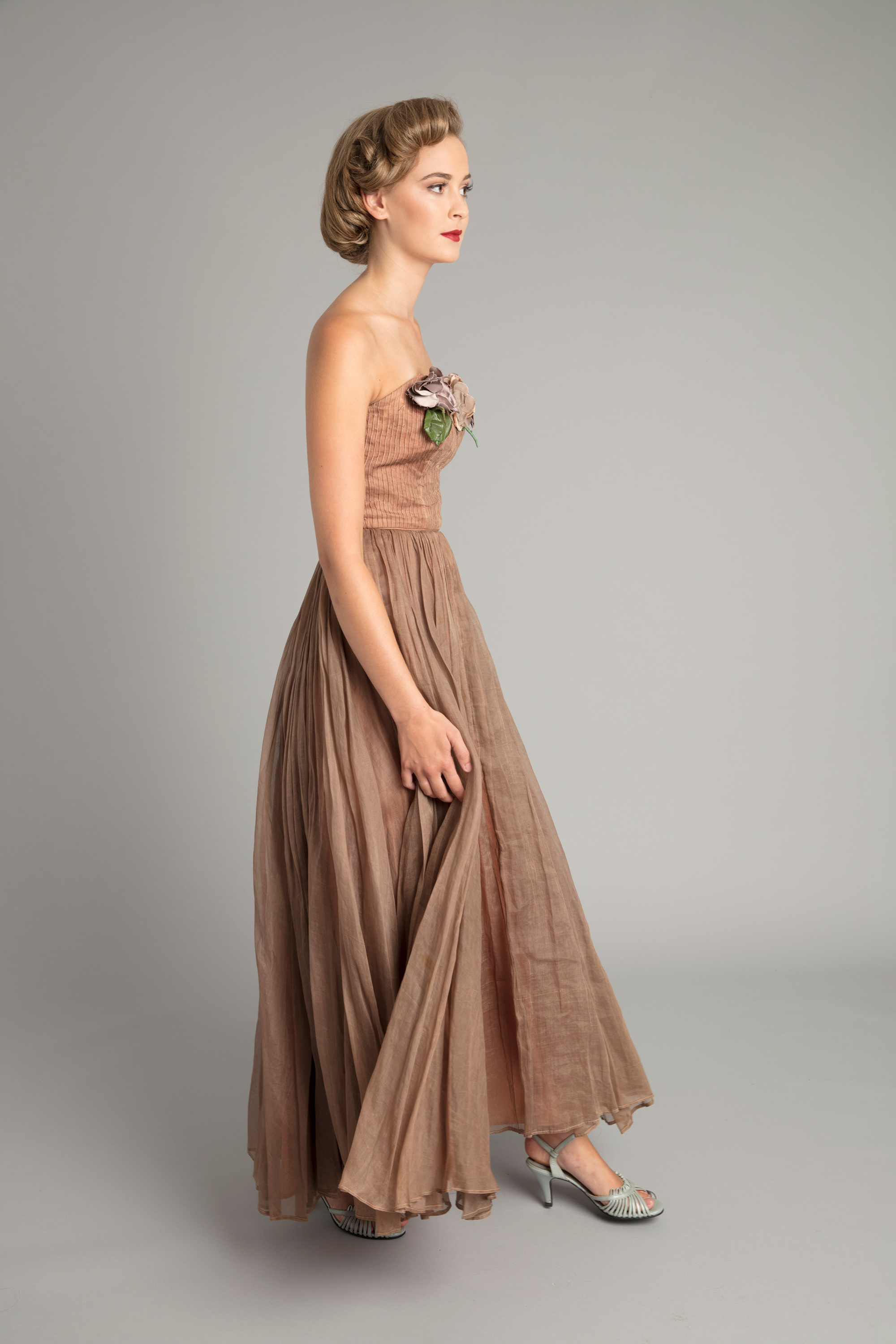 This 1950s evening dress in silk organza was made in the Milne & Choyce workroom at 131 Queen Street, Auckland.