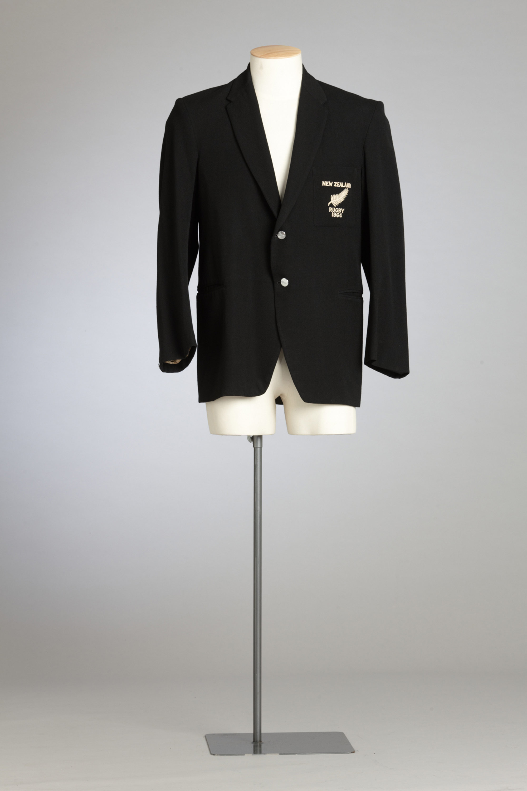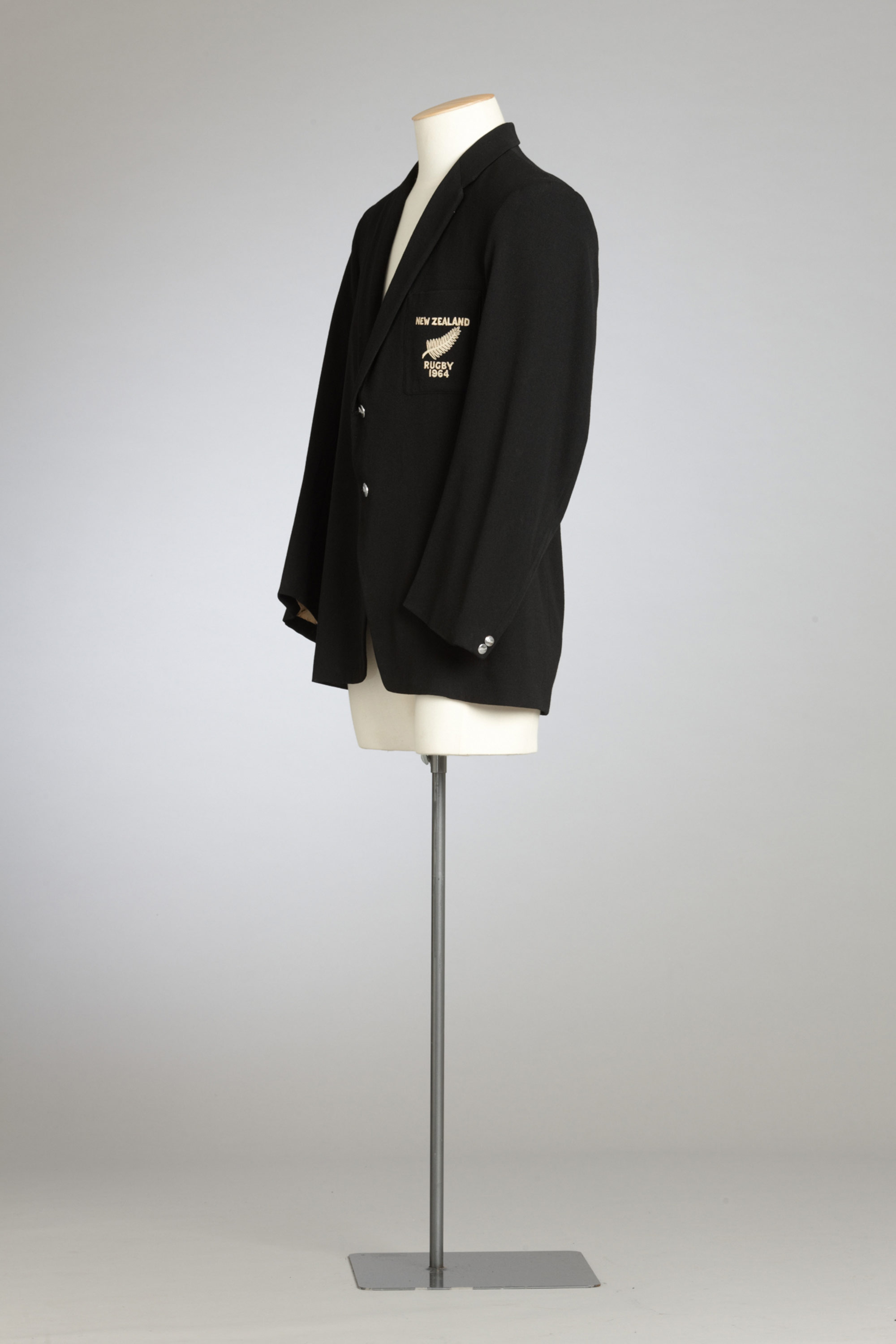 Bruce McLeod wore this black woollen blazer to his debut All Black test match against the Wallabies in 1964. This fully tailored jacket was made to encompass Bruce’s burly frame, which stood at just under 6 feet and weighed in at 14 1⁄2 stone. The blazer is a very simple cut and the only embellishments are the embroidery on the breast pocket and the New Zealand fern embossed silver buttons. A similar style of jacket can be seen in the Olympic blazer worn 12 years earlier by Yvette Williams, which also has the embroidered pocket and the same silver fern embossed buttons.