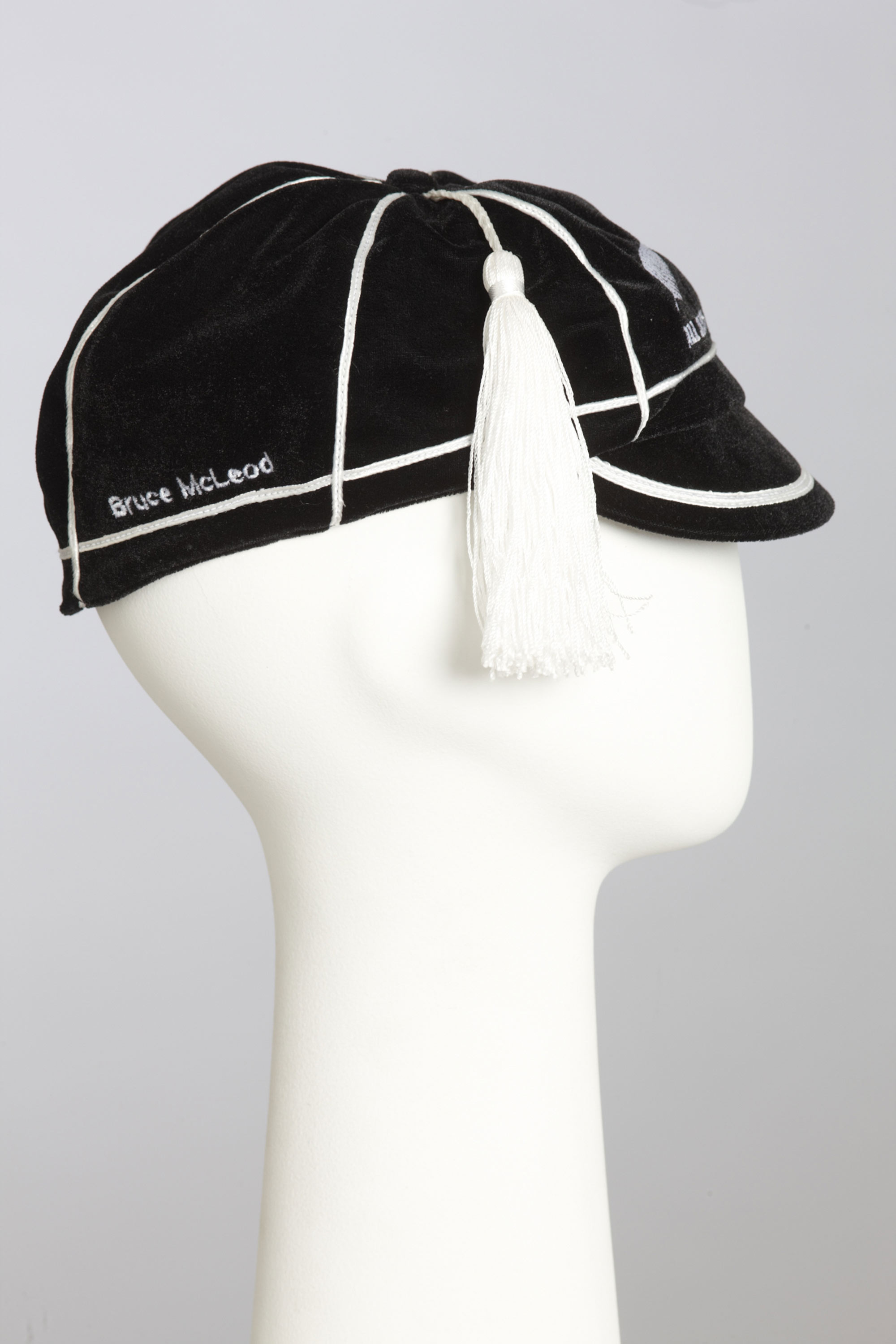 Bruce McLeod earned his cap by being an All Black hooker from 1964 until 1970, but he never received the real thing. Capping was a practice initiated by the New Zealand Amateur Athletics Association in 1887 and adopted by other sports. While the term ‘being capped’ persevered the awarding of actual caps went into abeyance. Recently the New Zealand Rugby Union has revived the practice and are presenting real caps retrospectively. Bruce McLeod died in 1996 at the age of 56 so this cap was received by his family.