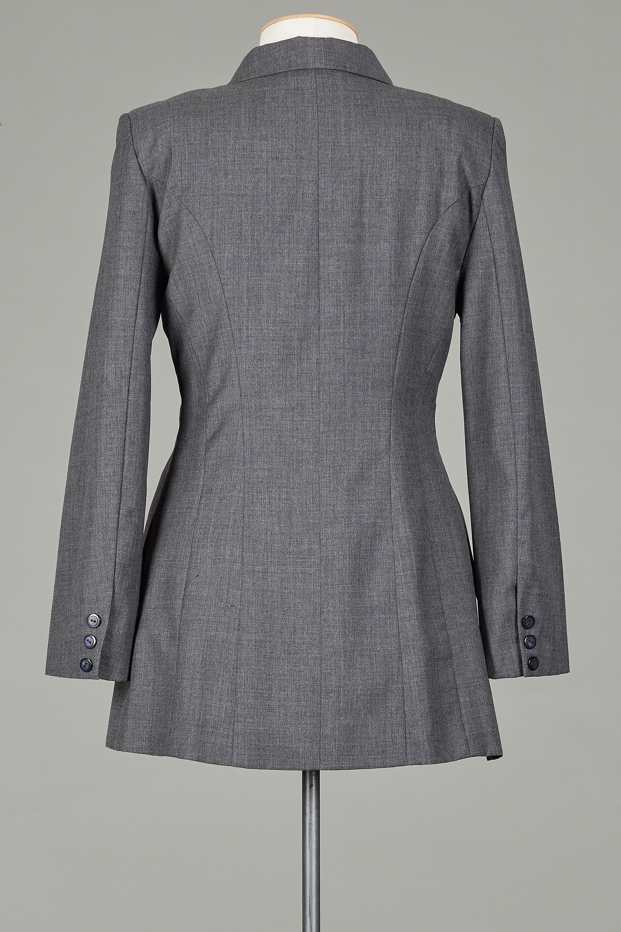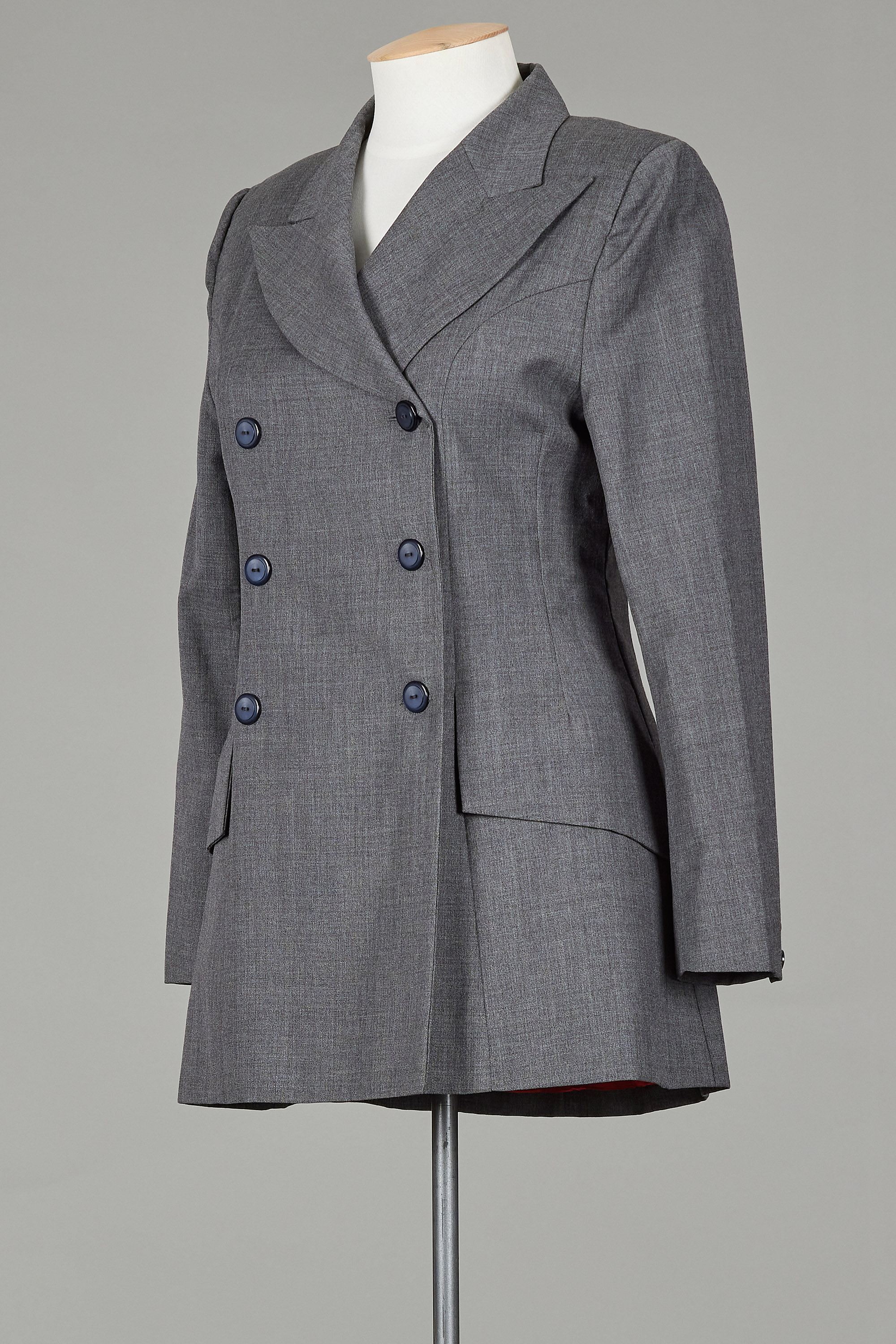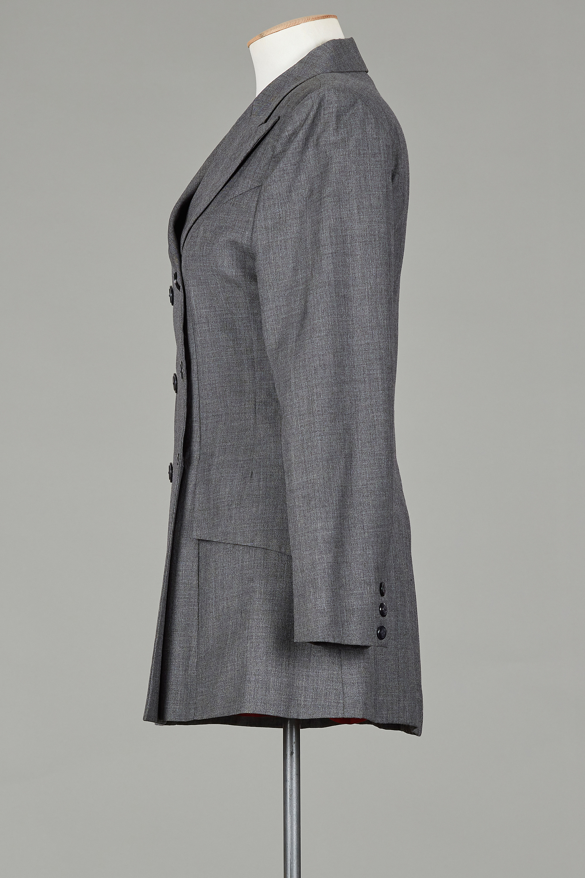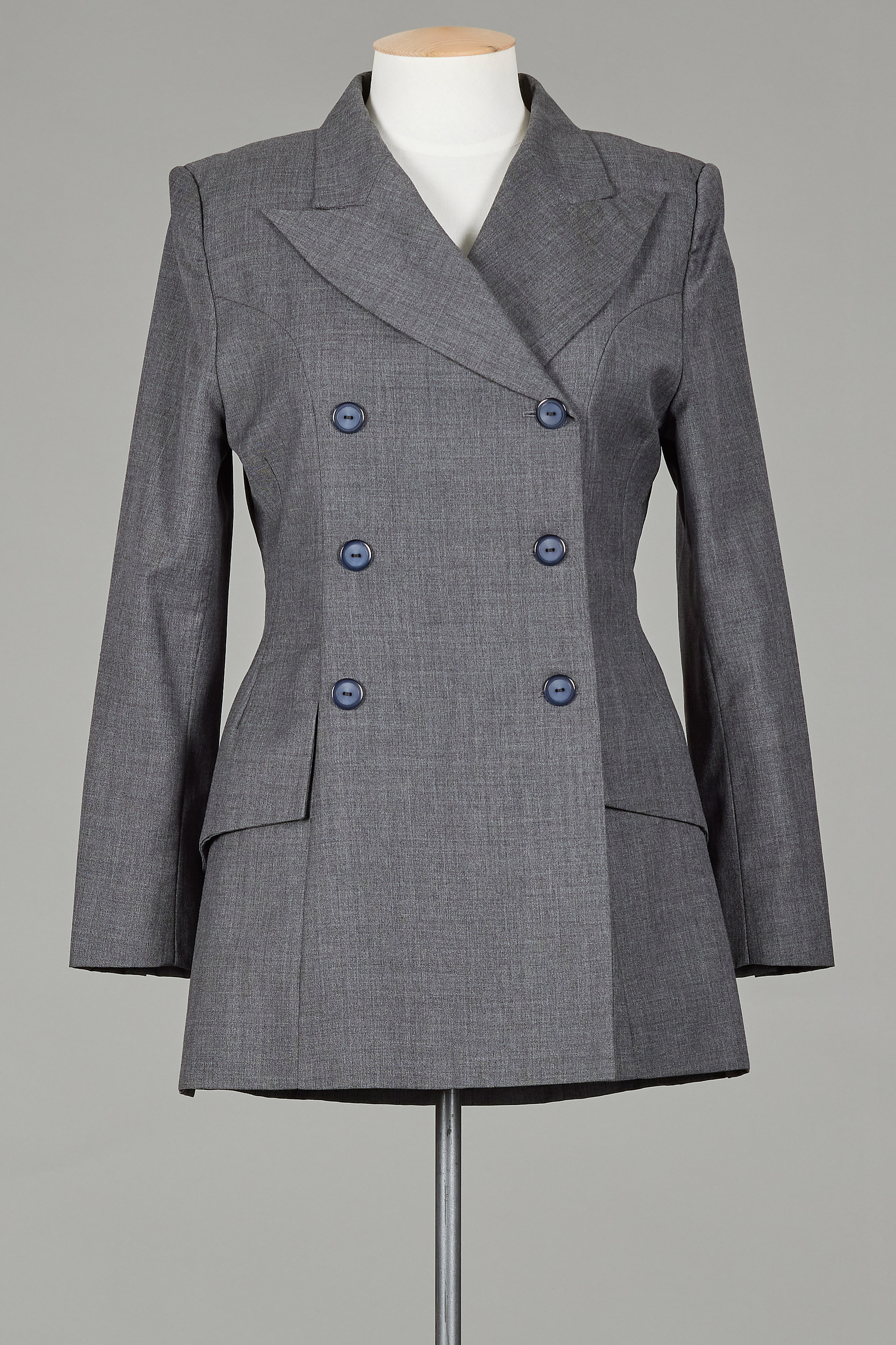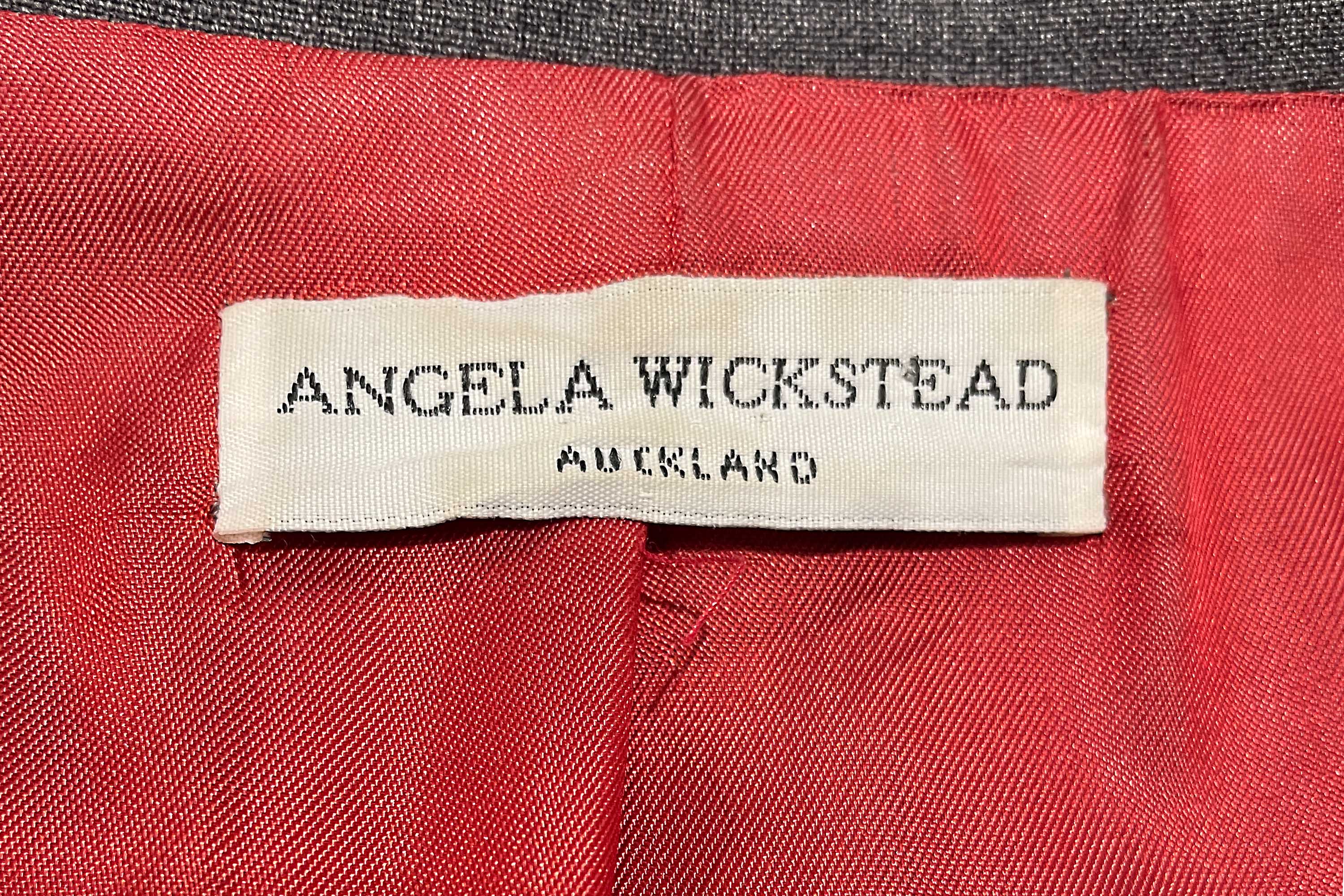 This fitted double breasted blazer was made in Auckland, which suggests being made prior to Angela's final move to Italy. It is made from a fine grey wool suiting, and references classic tailored details that might be found on mens suiting from a much earlier period; the strong shoulders, large lapels and double breasted button stance echoes 1940s suit styling.