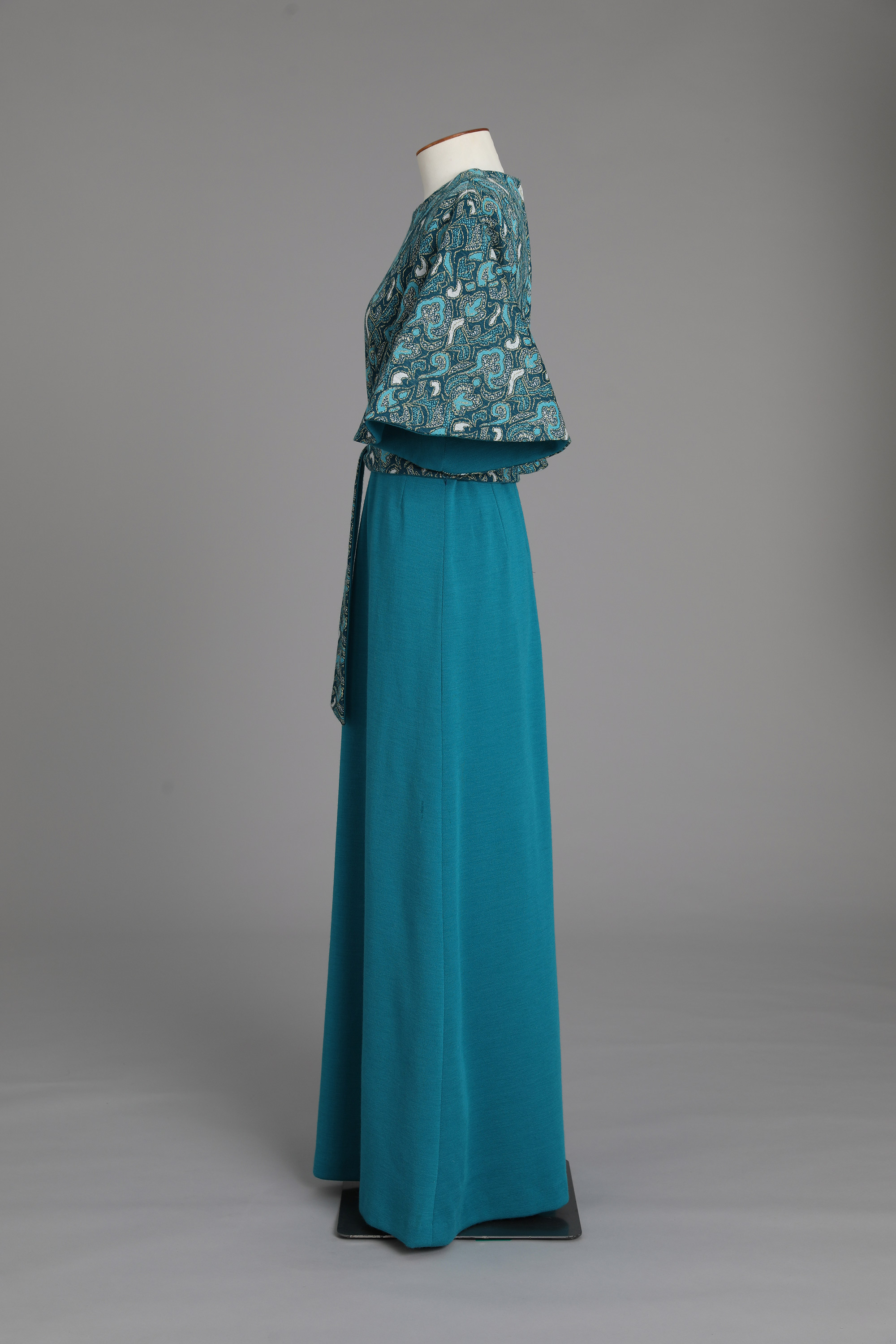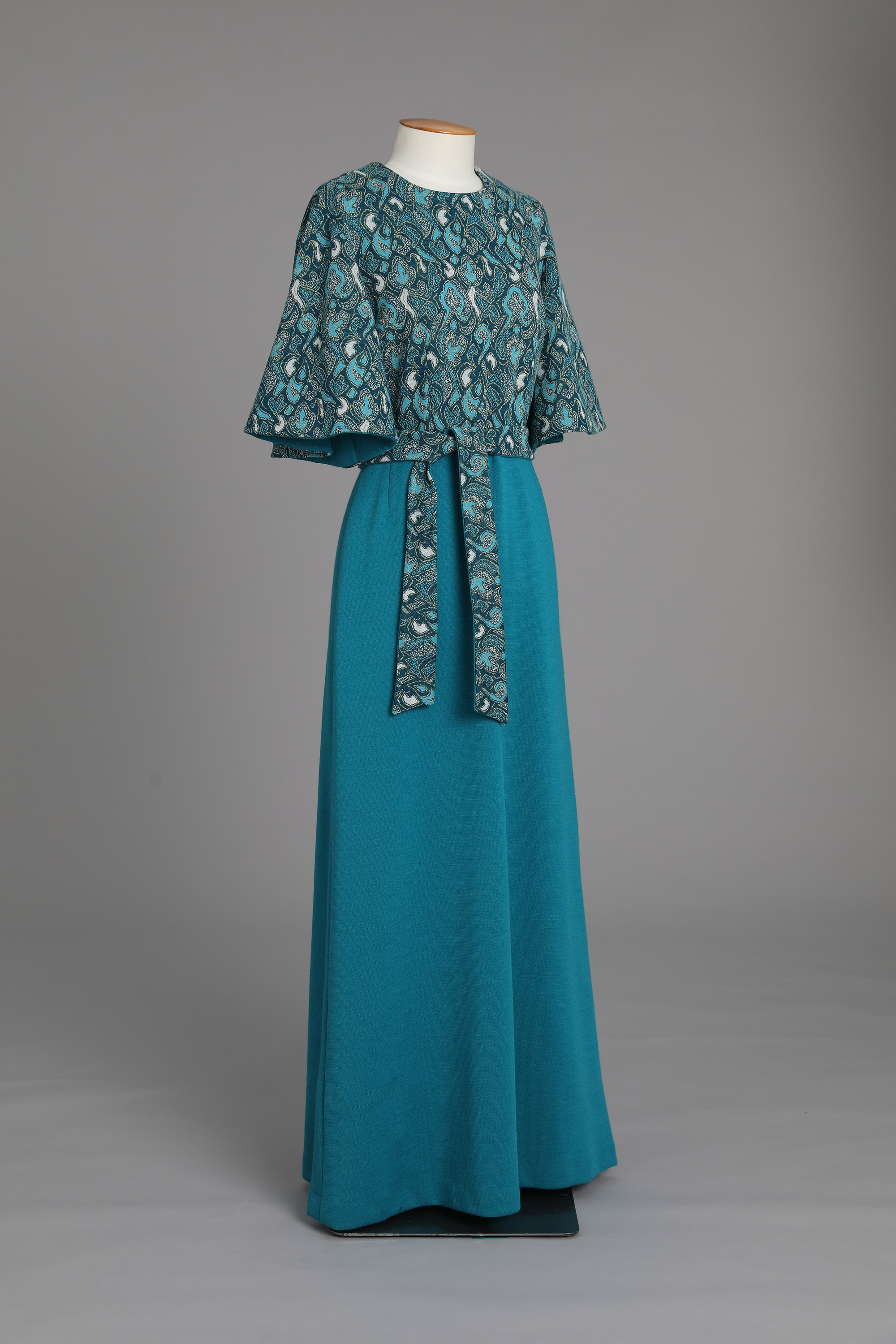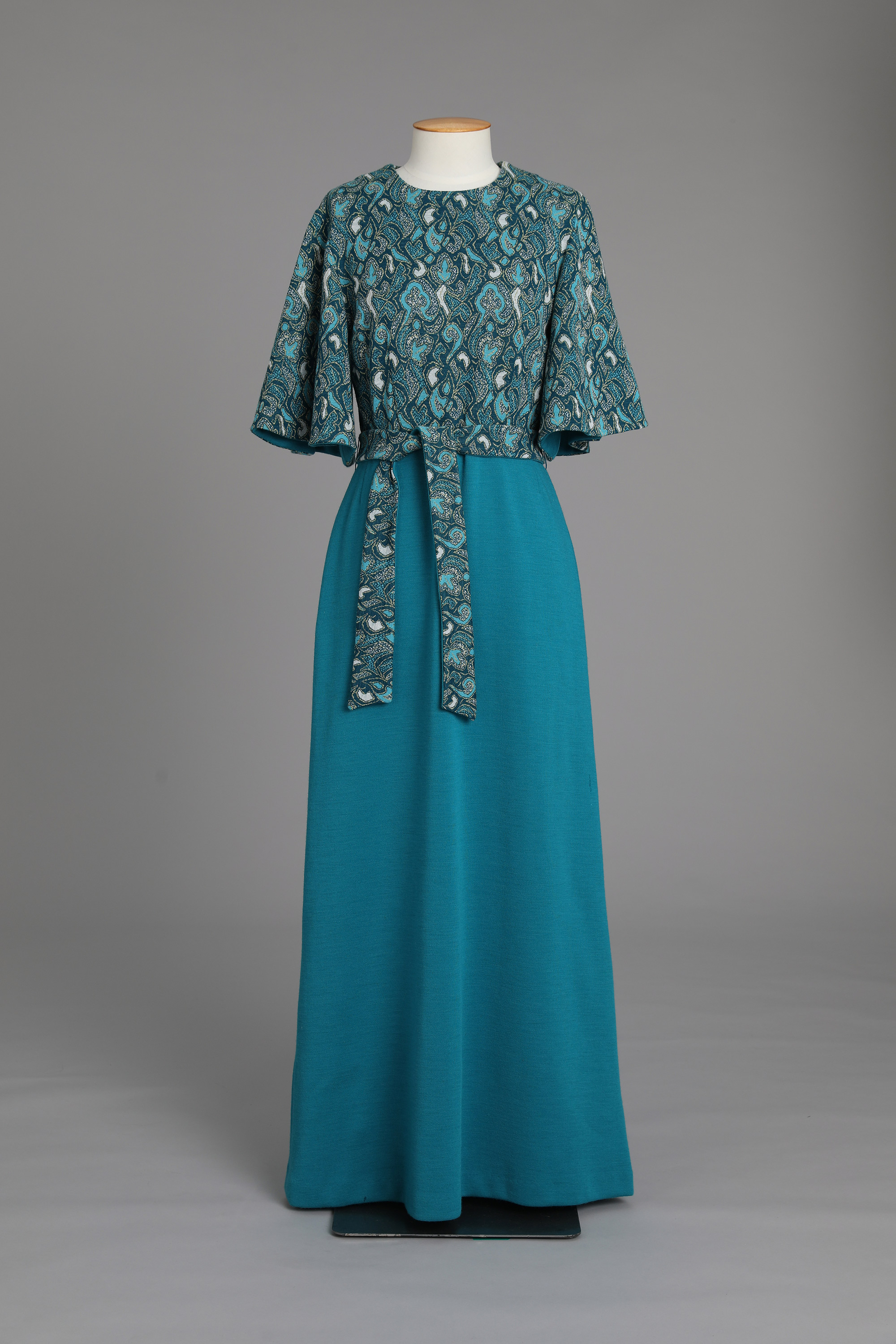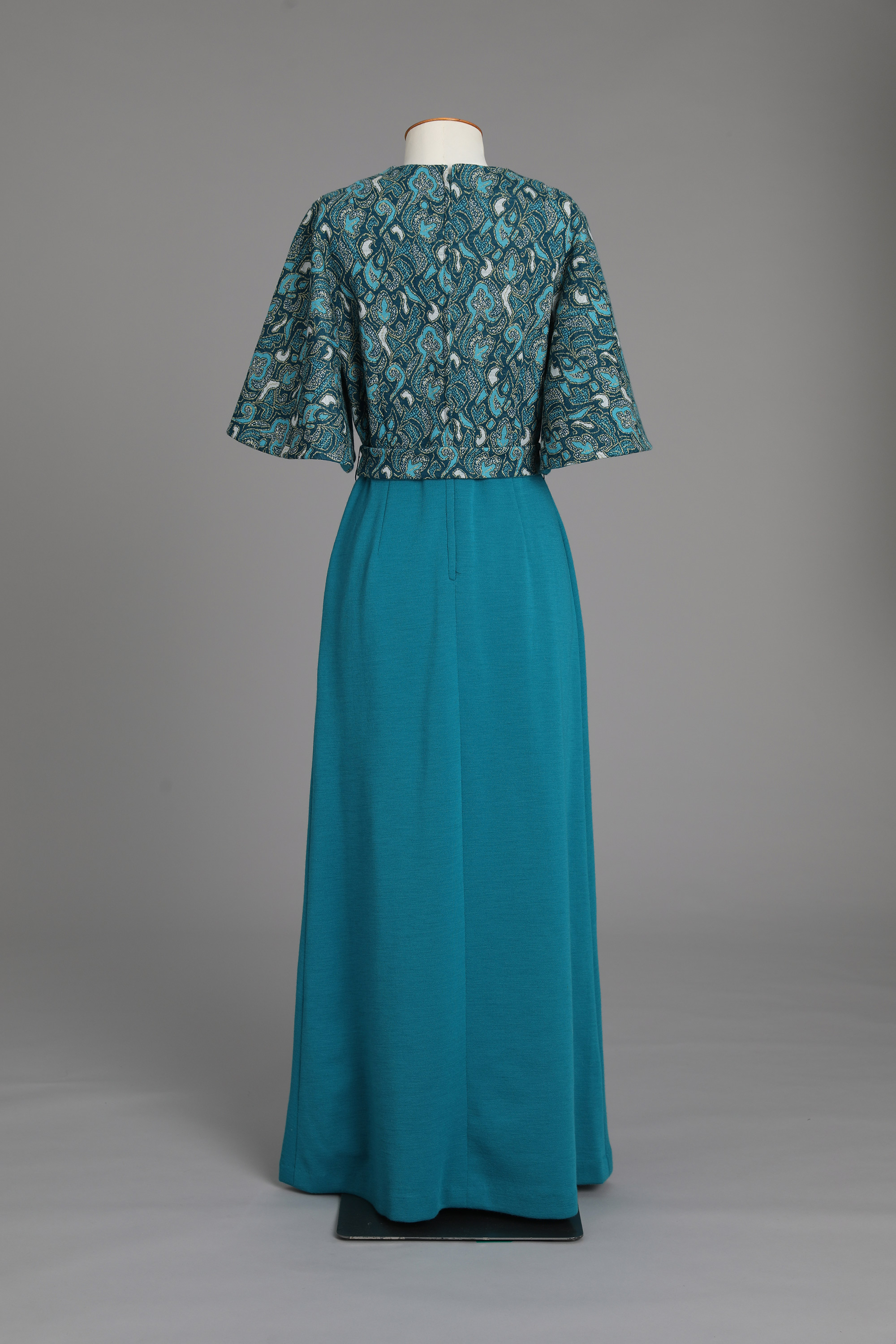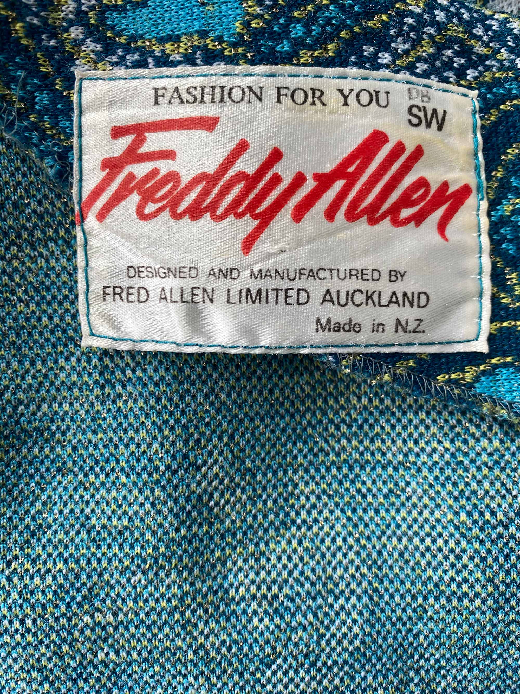 This dress is labelled Freddy Allen, named after the owner of the business Fred Allen. Fred was captain and later coach of the All Blacks before rugby was a professional sport. Players - even All Blacks - had to earn an income elsewhere and Fred juggled his sporting career with ownership of a women's clothing label.Â