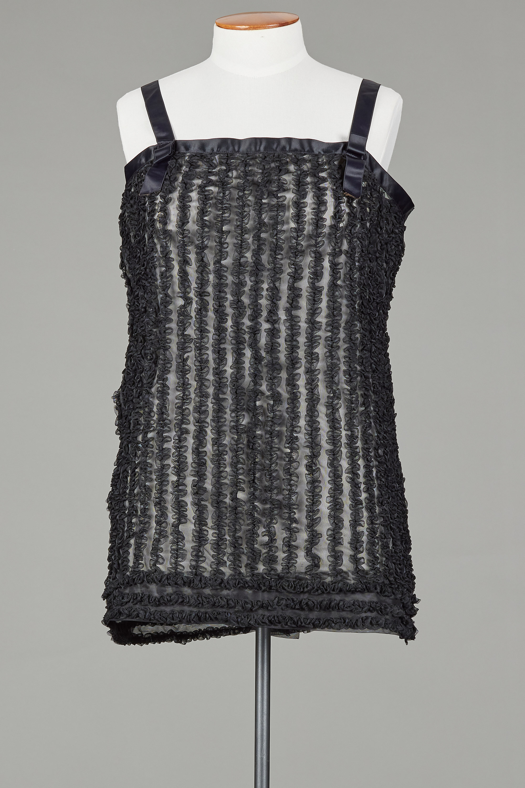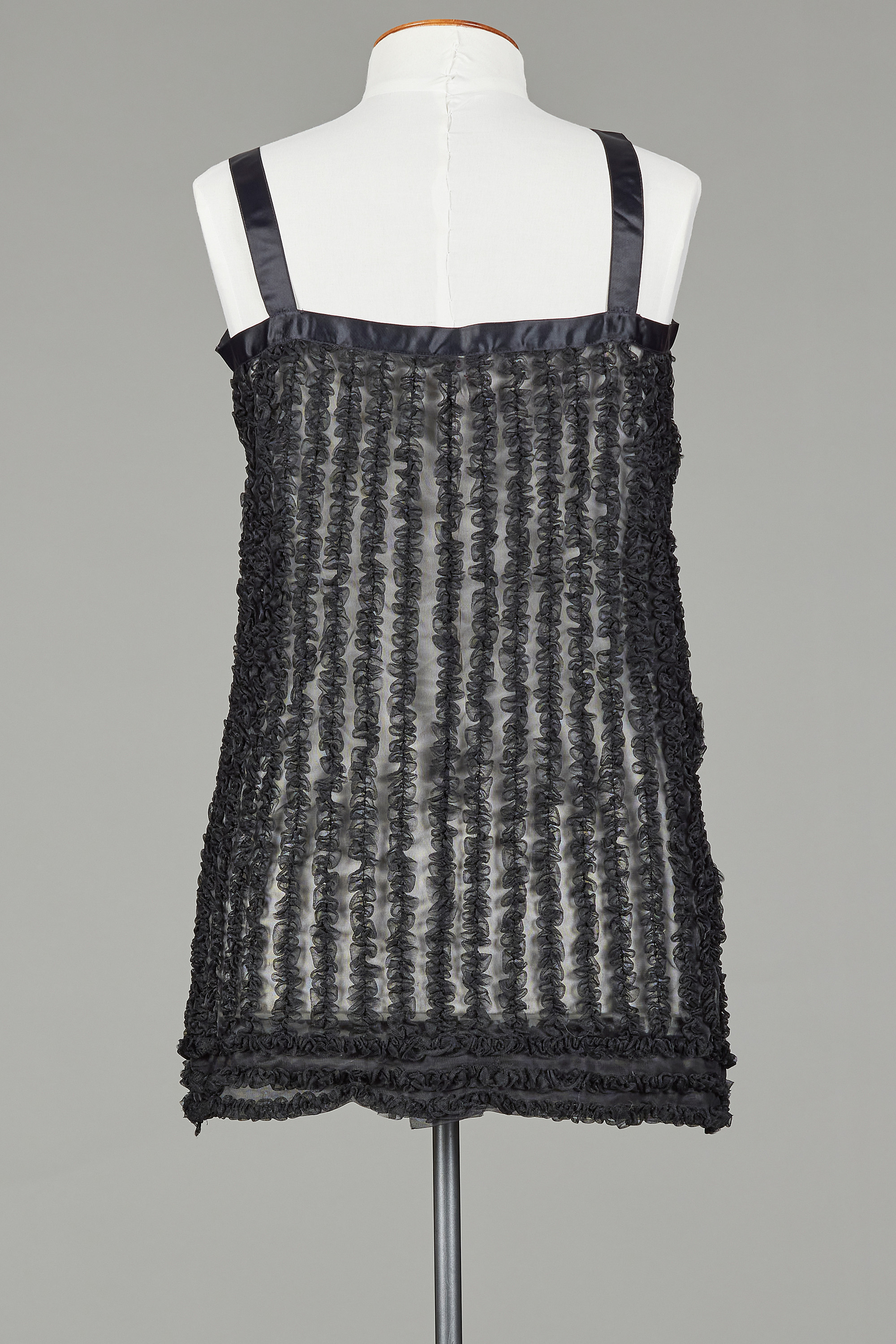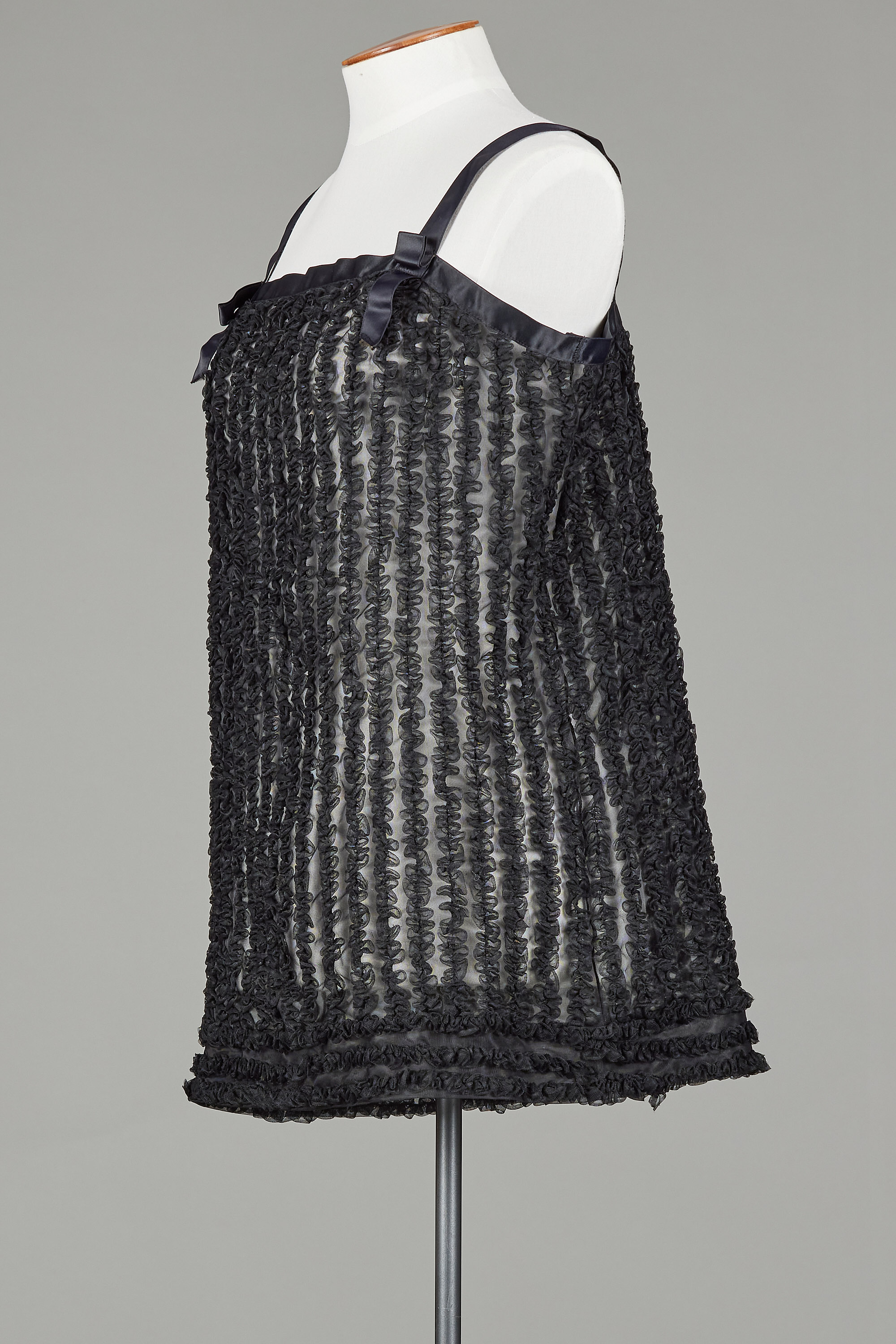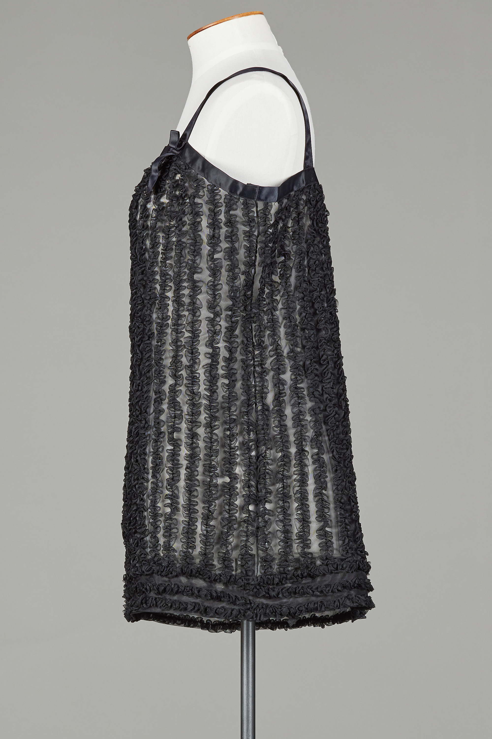 Made of a sheer knitted Bri-Nylon, this mini-length slip features vertically sewn gathered frills all over out of the self fabric as a fun and flirty detail which also helps to create a layering that offsets the sheer nature of the fabric in its flat form. Horizontal rows of this frill detail also line the hem. This suggests that this would be worn as sleepwear as opposed to an undergarment, and the A-line silhouette mirrors more the more voluminous babydoll pyjamas popular in the 1950s and early 1960s.