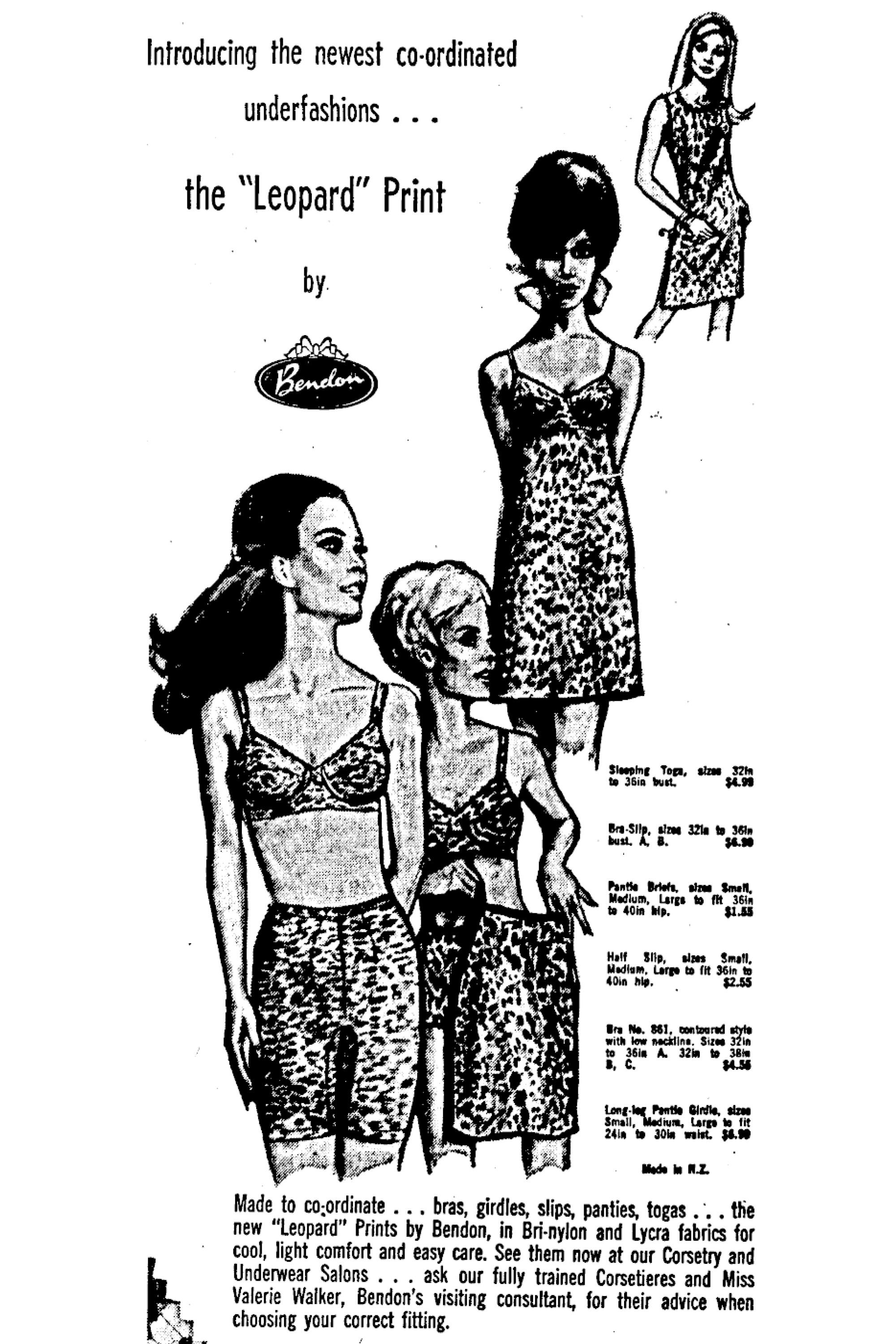 In the original advertisement, the top garment is described as a "sleeping toga", and the following description of this range is also included: "Made to co-ordinate... bras, girdles, slips, panties, togas... the new “Leopard” Prints by Bendon, in Bri-nylon and Lycra fabrics for cool, light comfort and easy care."