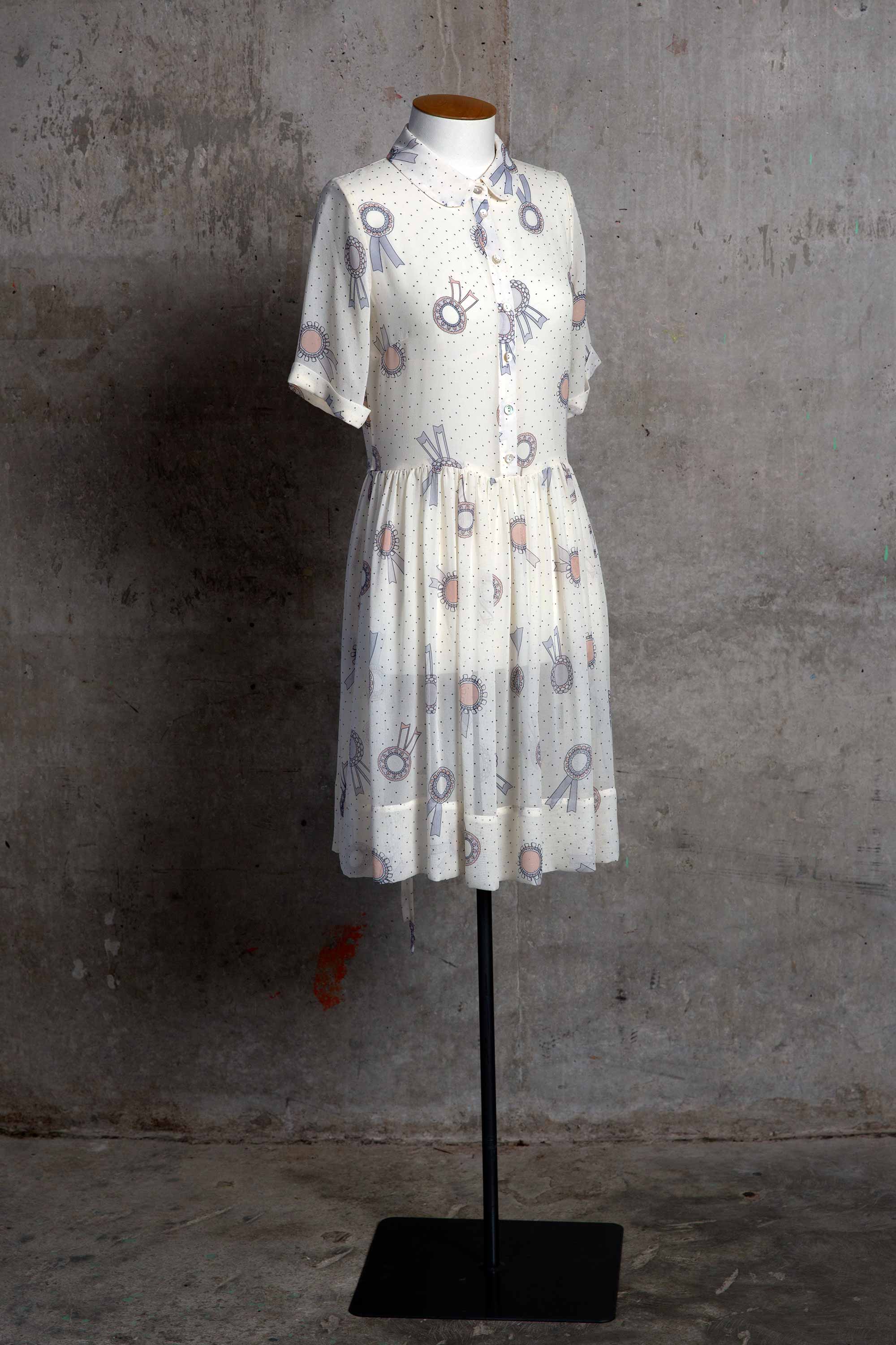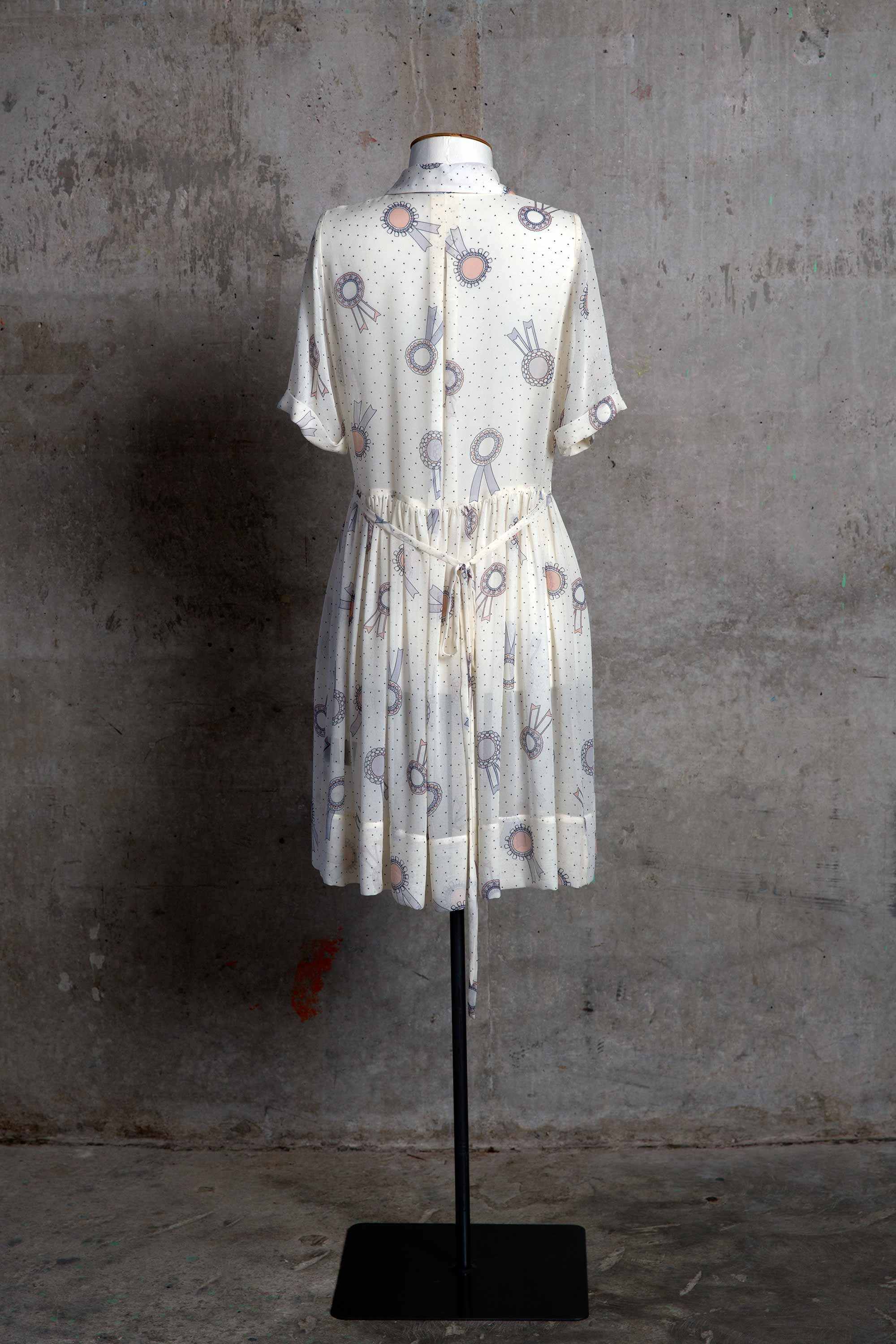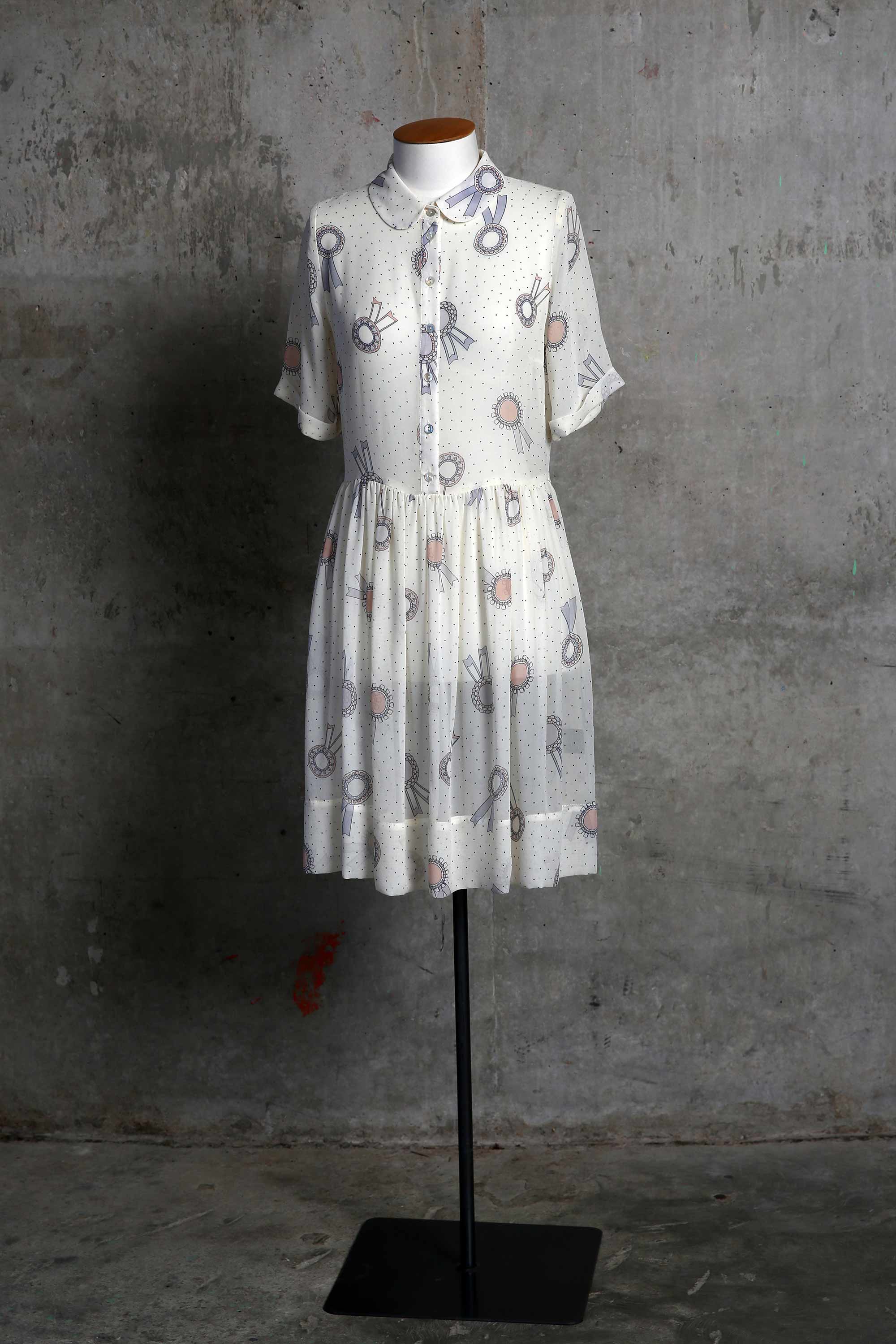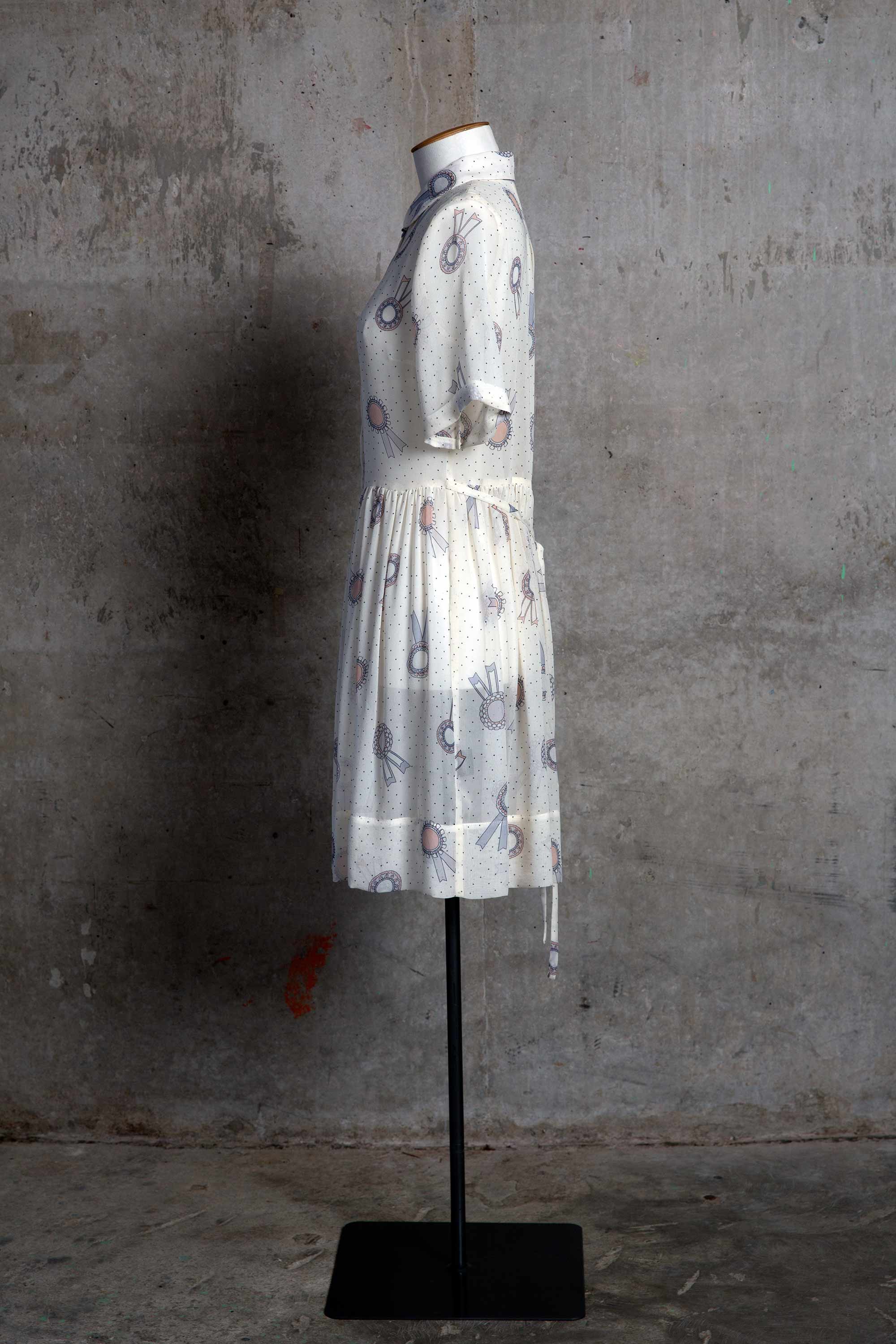 The dress is screen printed in a custom rosette print that was designed for the Rutshire Forever collection.