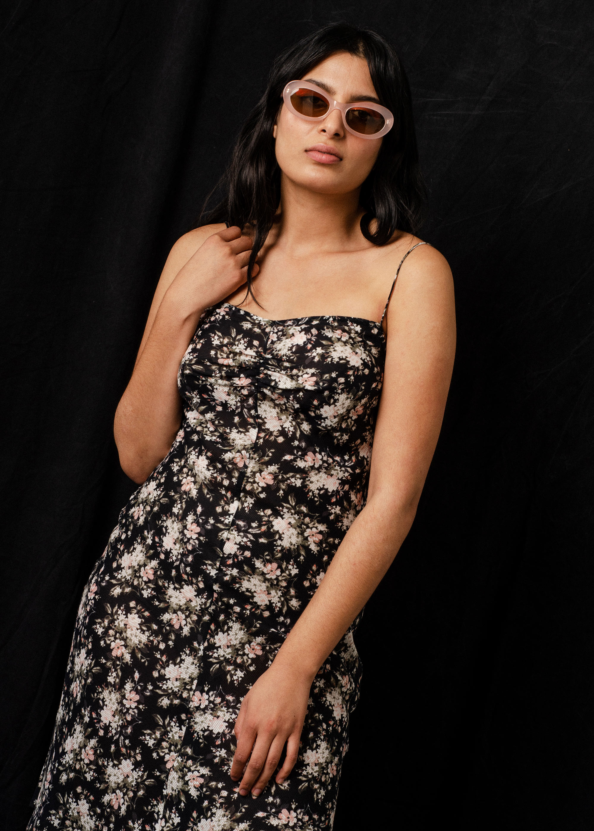 The dress has gathered front detailing at bust and thin rouleau straps.