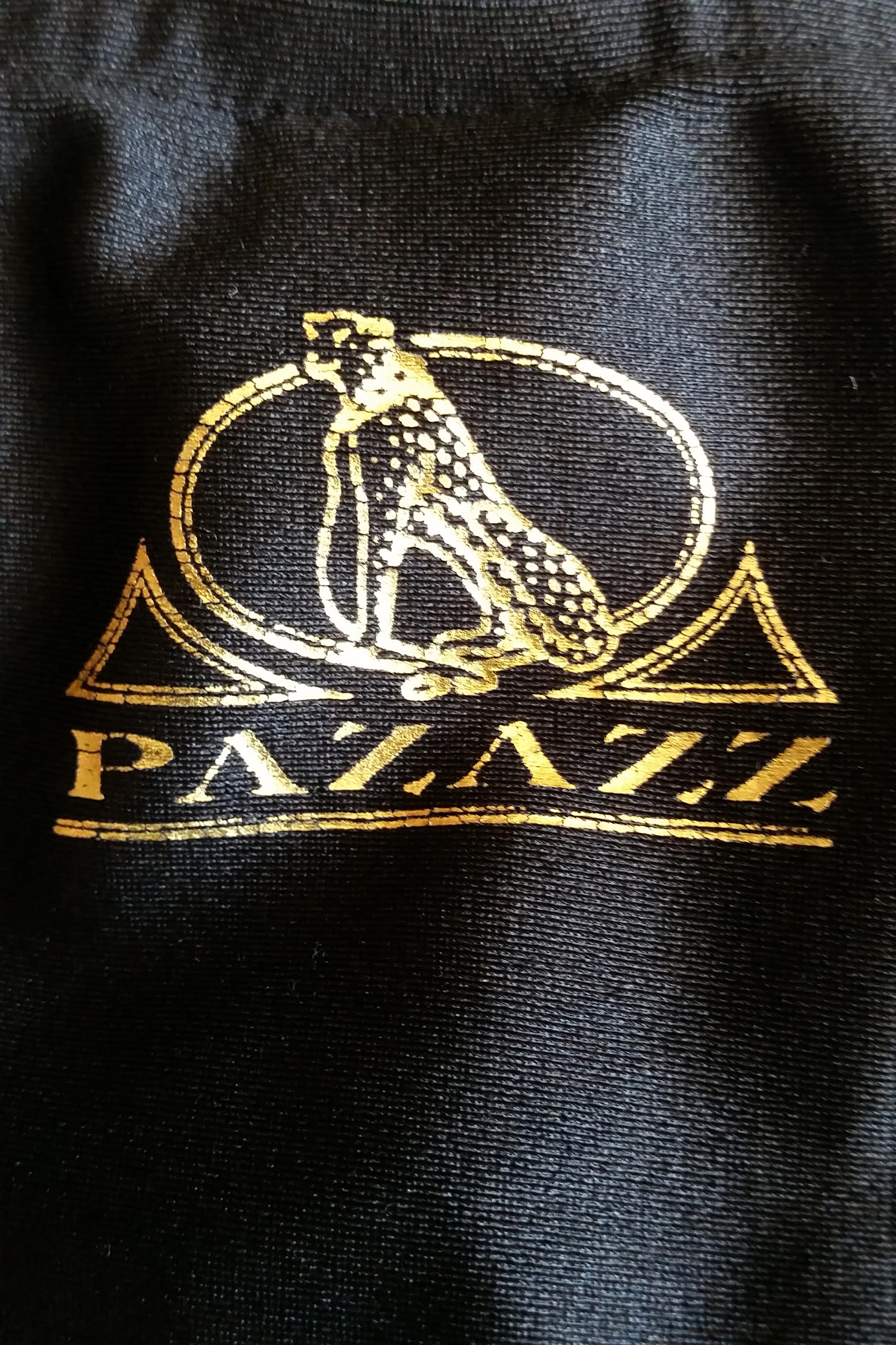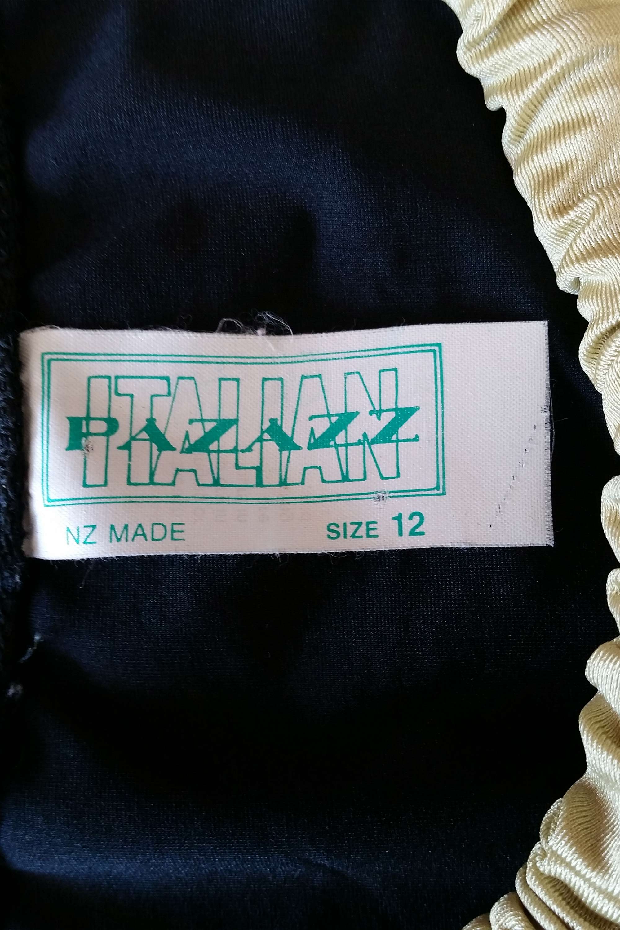 This Pazazz bikini has a twist top bandeau top made of two contrasting colours - a feature of design in the mid 1980s. As fashions for the legline crept higher, the waist also rose and became a focus for decoration, in this case it has a gathering almost like a loin cloth.