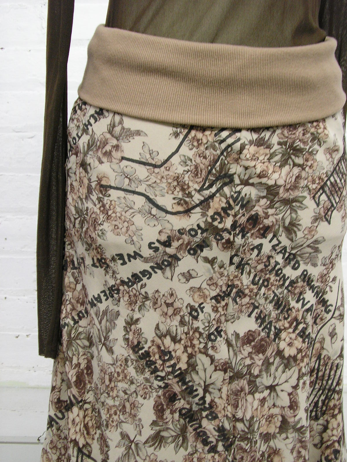 Doris de Pont collaborated with poet Gregory O'Brien for her 2006 collection, Beausoleil. The Gin 338 skirt features words from one of his poems. Befitting a love of words, the collection has a tongue-in-cheek librarian feel – "perhaps a very stylish Japanese librarian". Each garment has been named using a mock Dewey Decimal Classification. Shapes may favour a "bookish shirt and tie" line, colourful fabrics in clashing combinations make it far from stuffy.