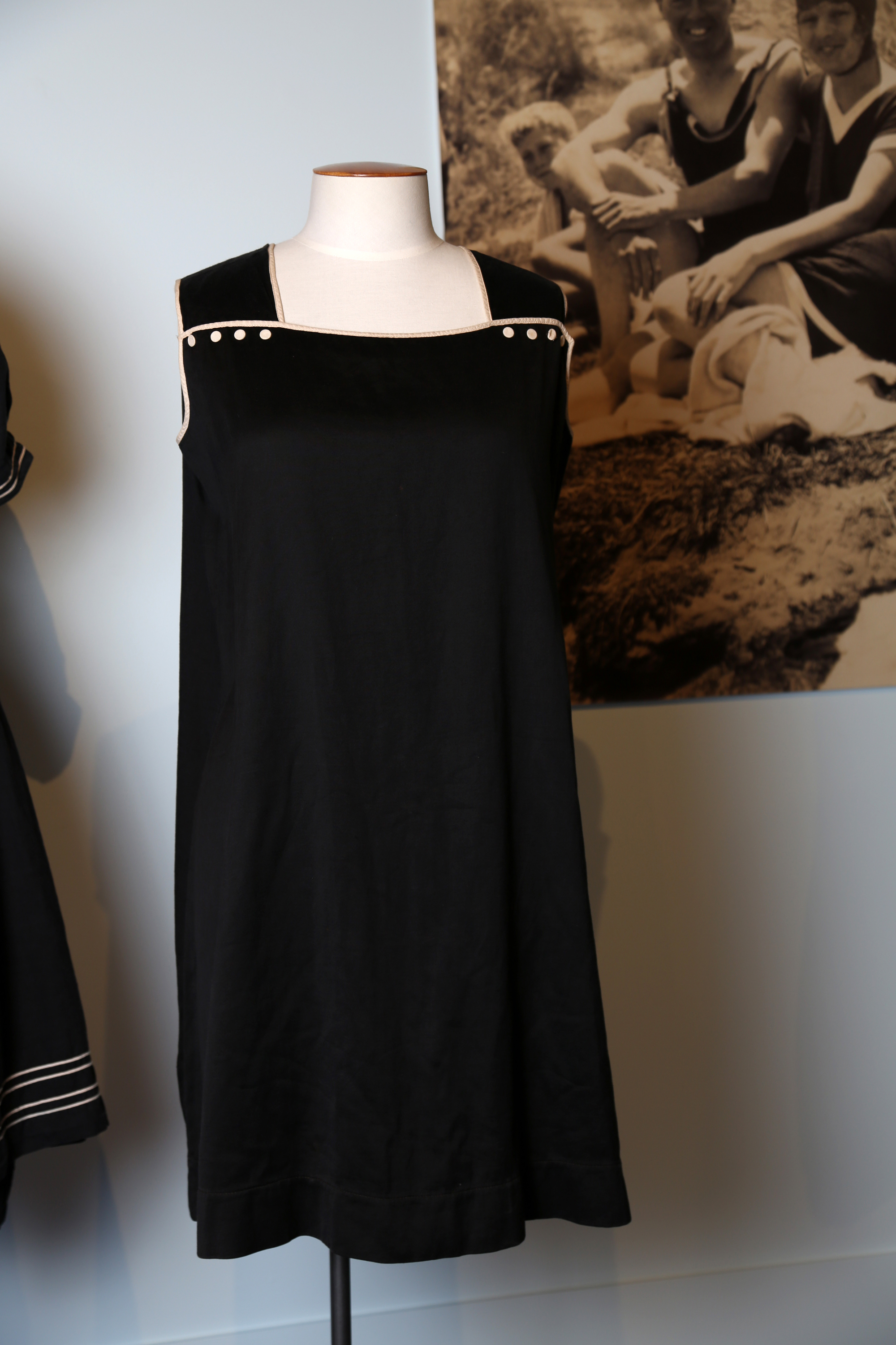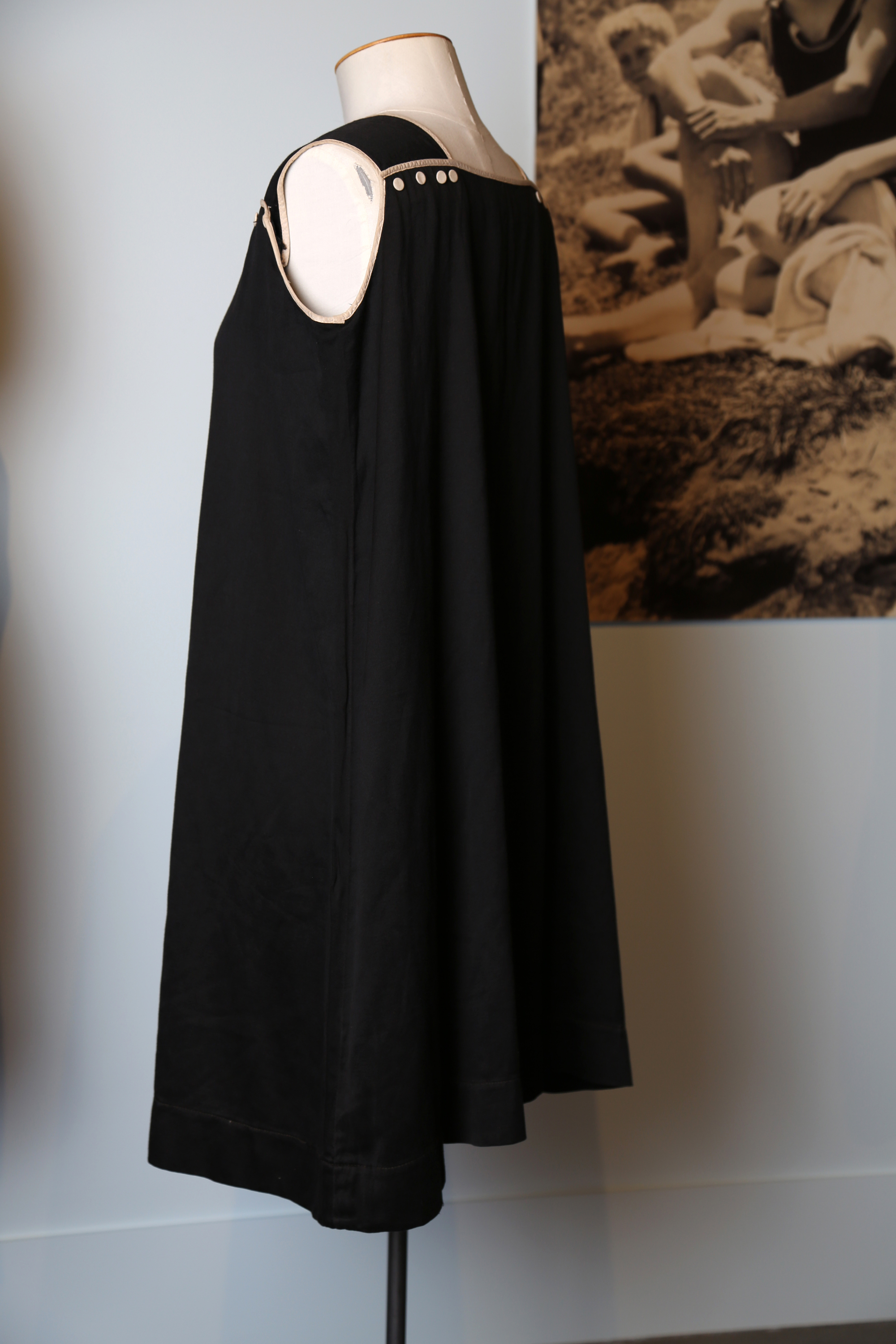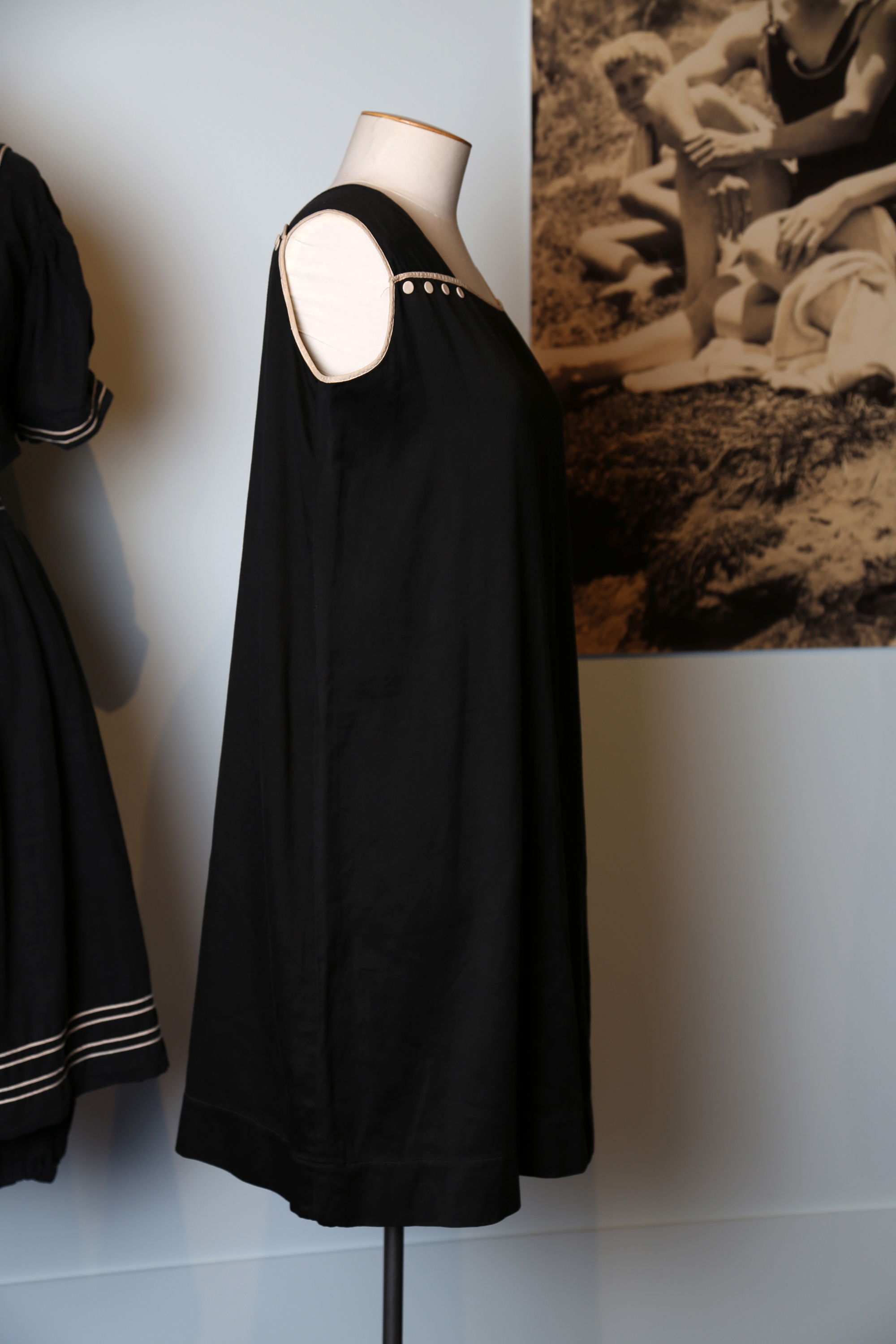 In the late 1800s it was modesty and the beauty ideal of pale skin that dictated the appropriate fashion for swimming. This bathing dress is made from dark coloured fabric thick enough not to become see-through when wet. Once in the water these became heavy and not at all conducive to swimming.