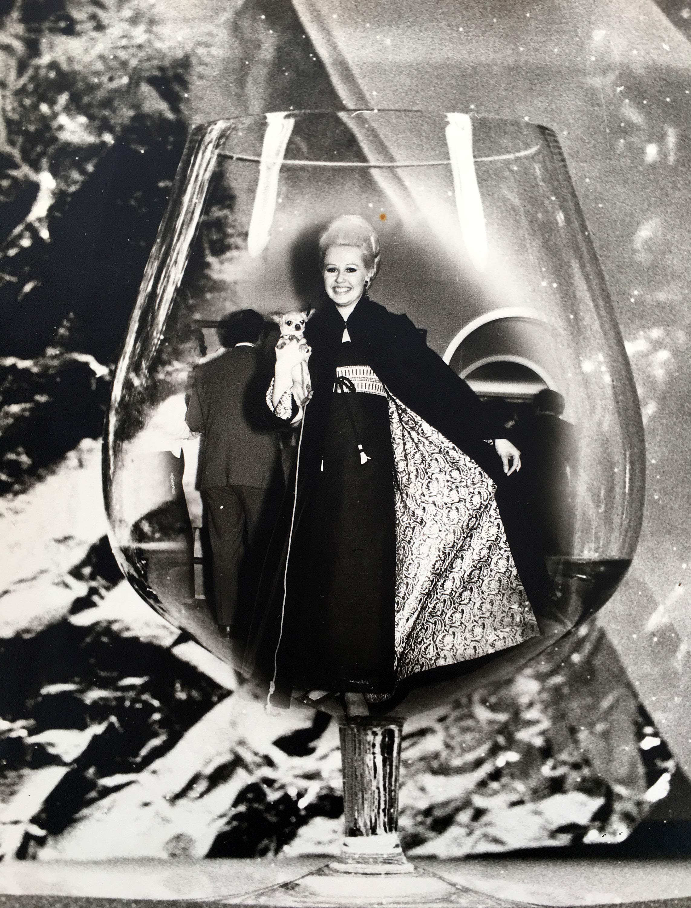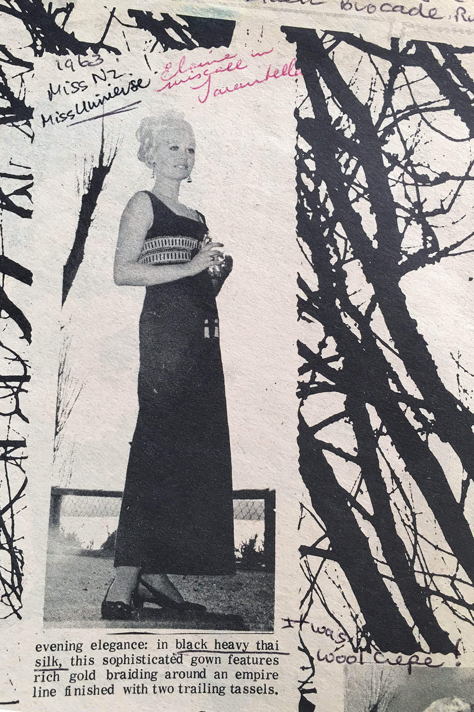 Miss New Zealand 1963, Elaine Miscall, was runner up in the Miss World contest later this year. Joan Talbot of Tarantella designed gowns for many of the era's Miss New Zealand contestants, including this thai silk gown and cape.