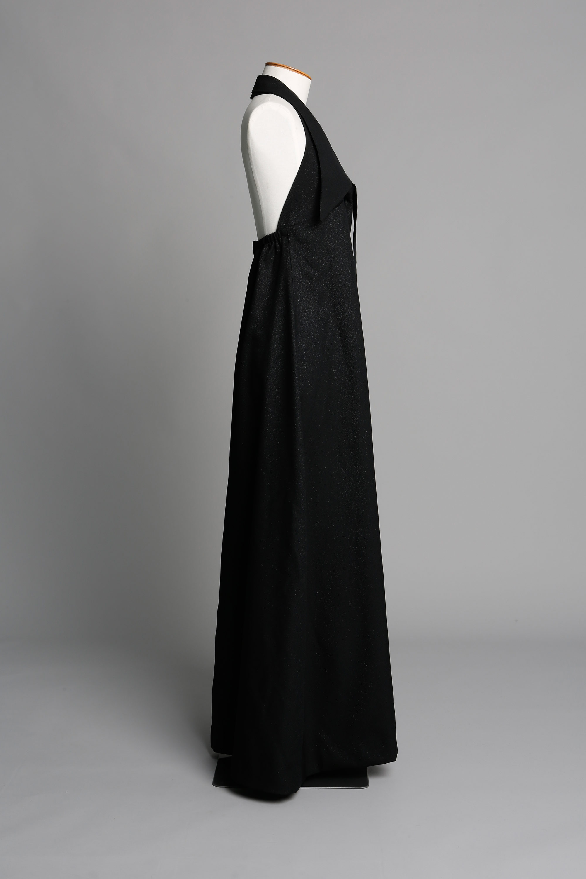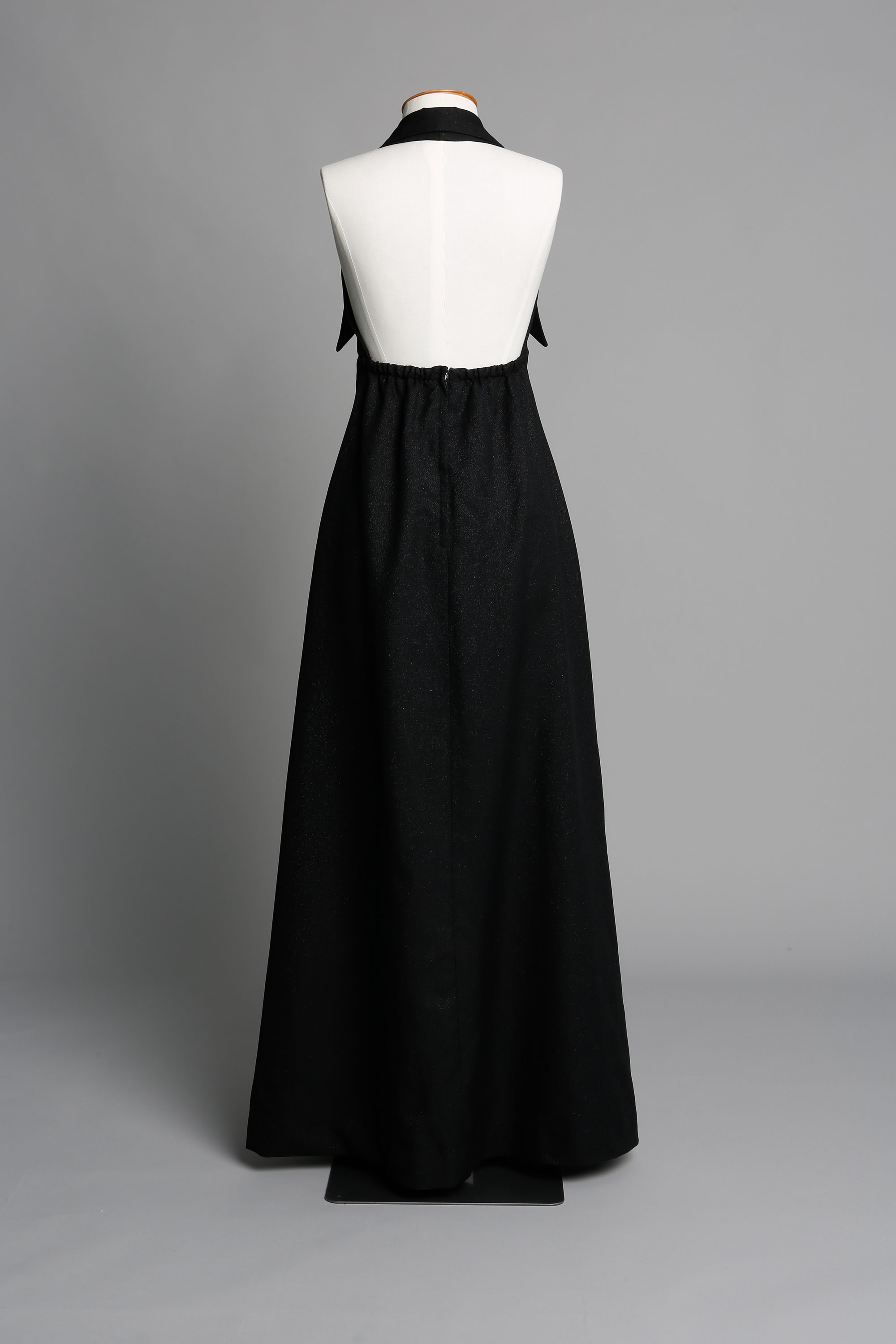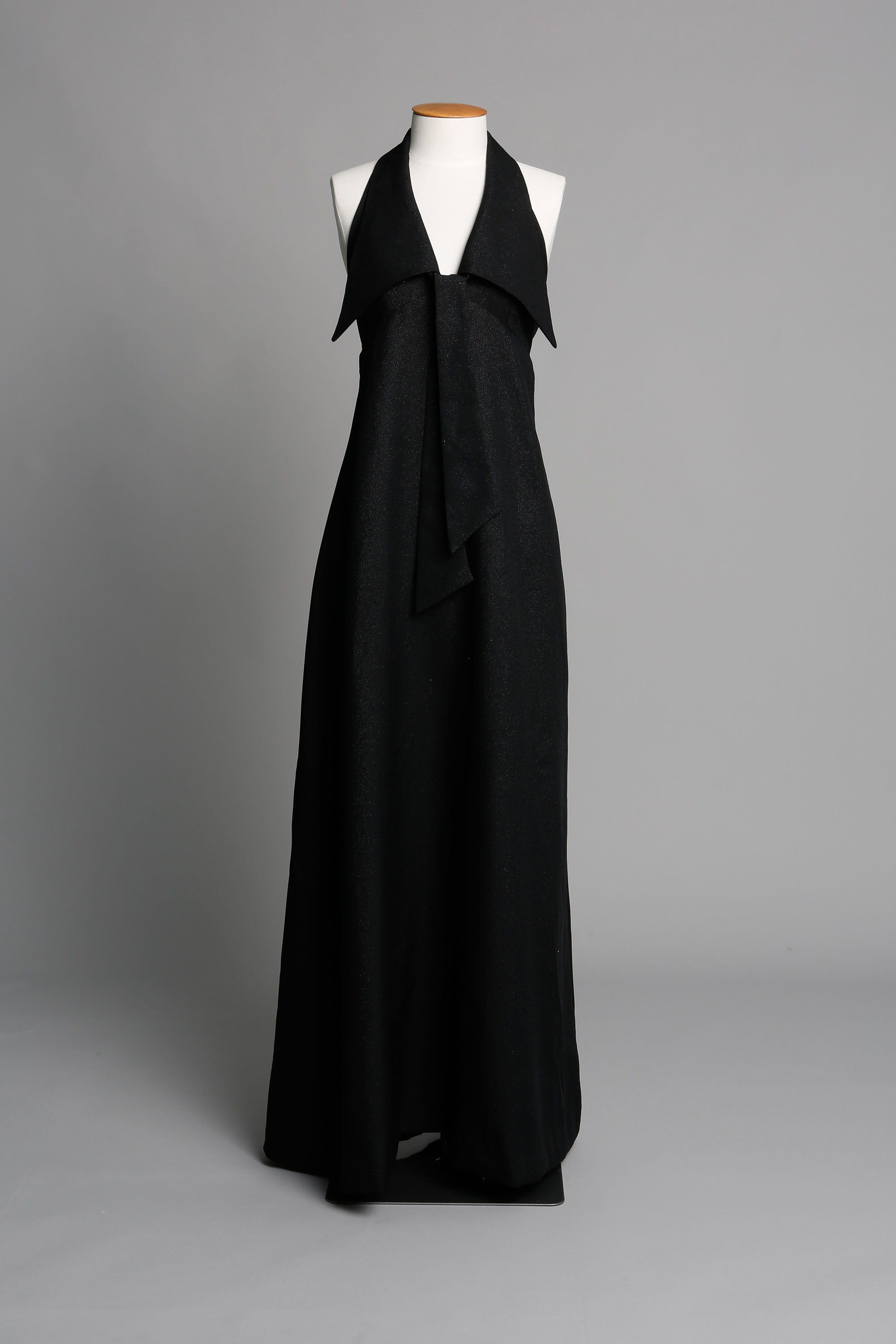 This evening dress has very large pointed collar with a faux tie.