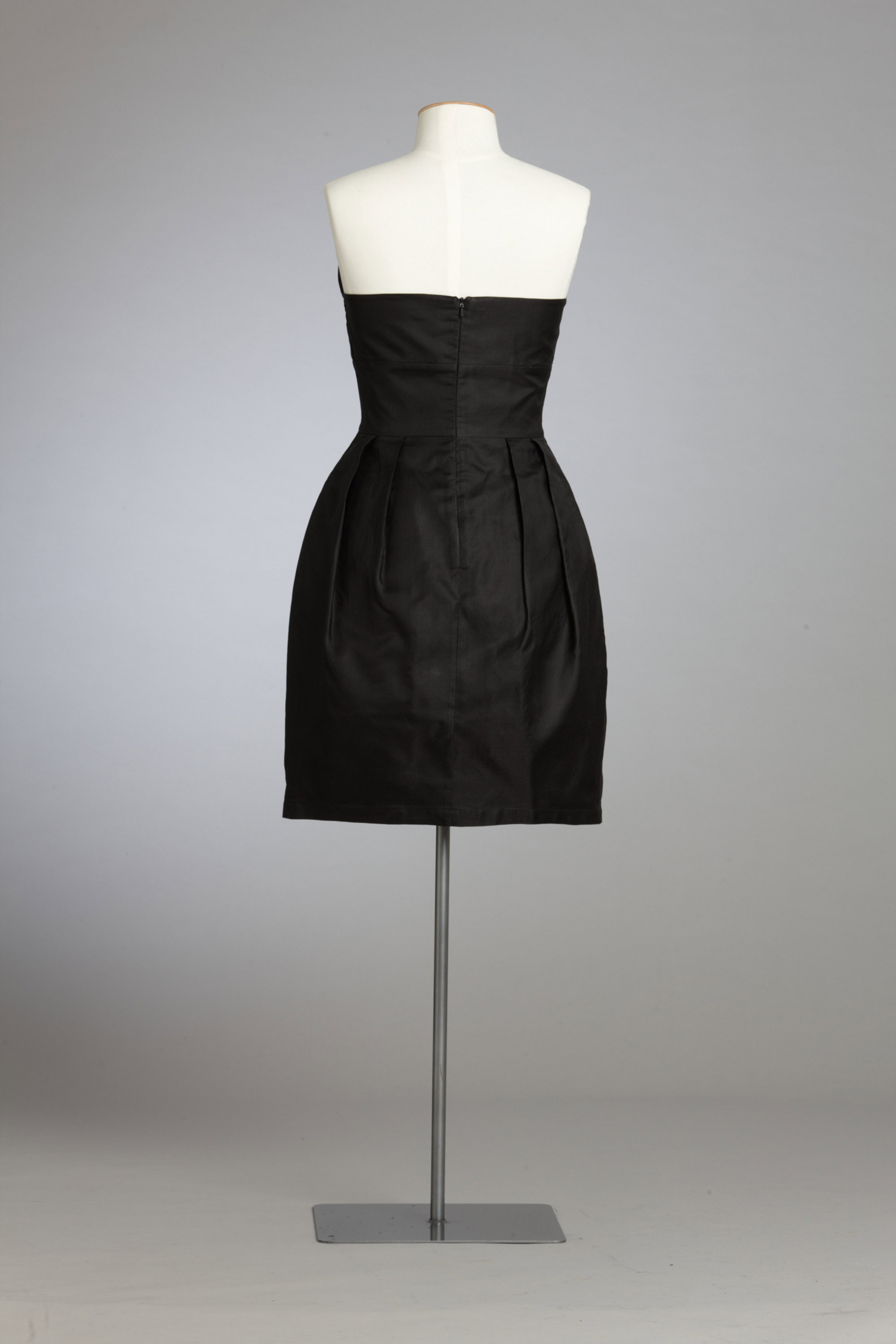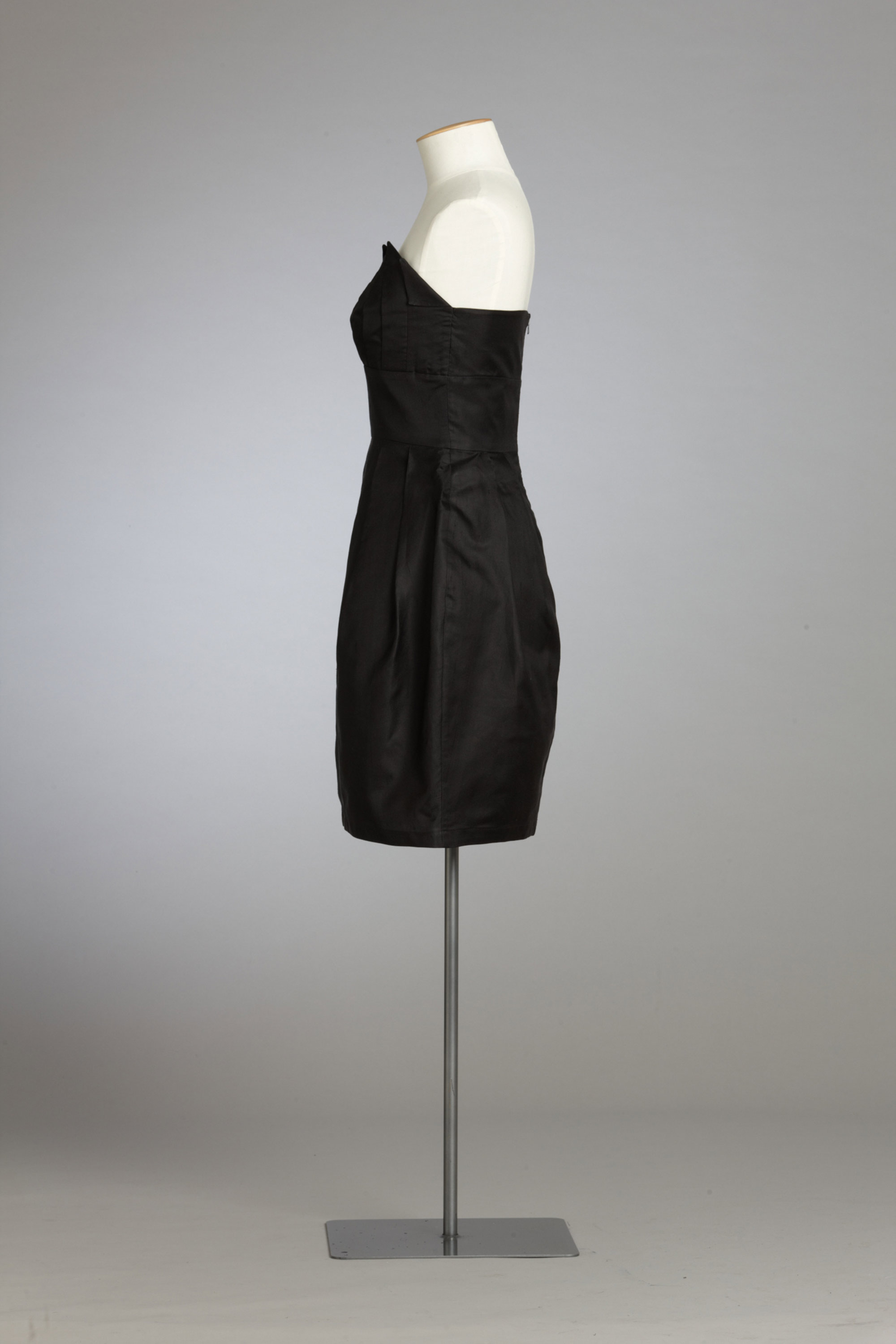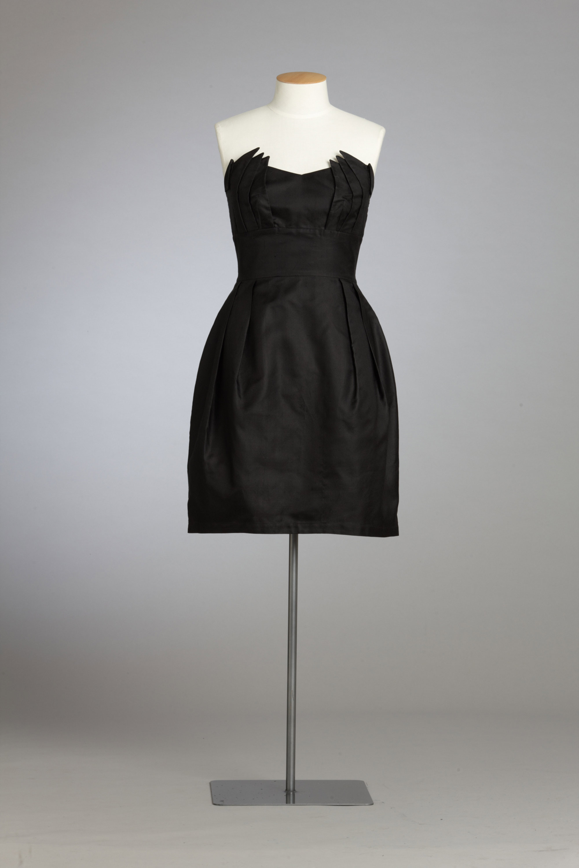 Black is not a colour synonymous with the Cybèle label or with the halcyon or kingfisher bird of mythology, which inspired her Autumn/Winter 2009 collection, but this particular dress has become a fashion icon. The black strapless dress with wing-inspired detailing at the bust line moved from its high fashion home to the Westie bogan heartland when it was chosen to be the wedding dress for the character of Loretta West in TV3’s hit television series Outrageous Fortune. It has demonstrated its iconic credentials by being able to cross social boundaries. Read more about wearing the colour black in the New Zealand Fashion Museum publication Black: The history of black in fashion, society and culture in New Zealand.