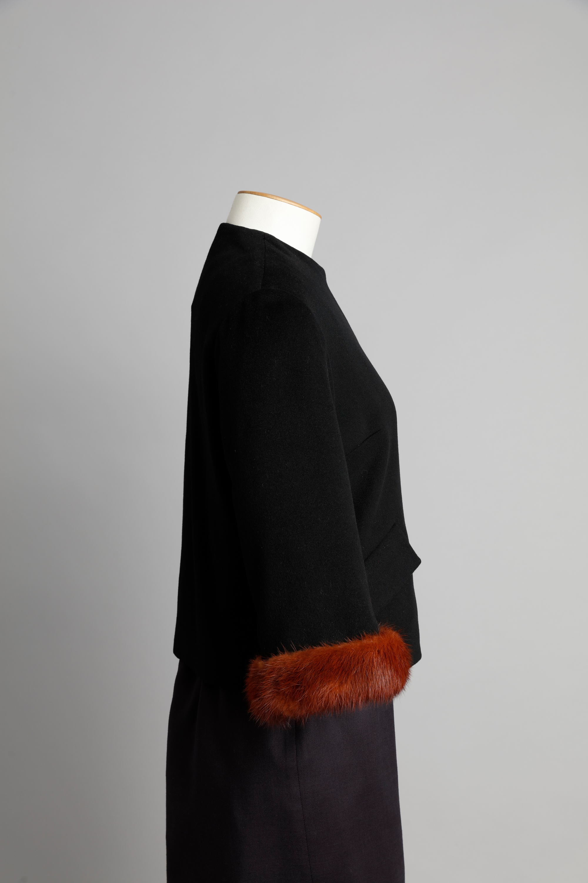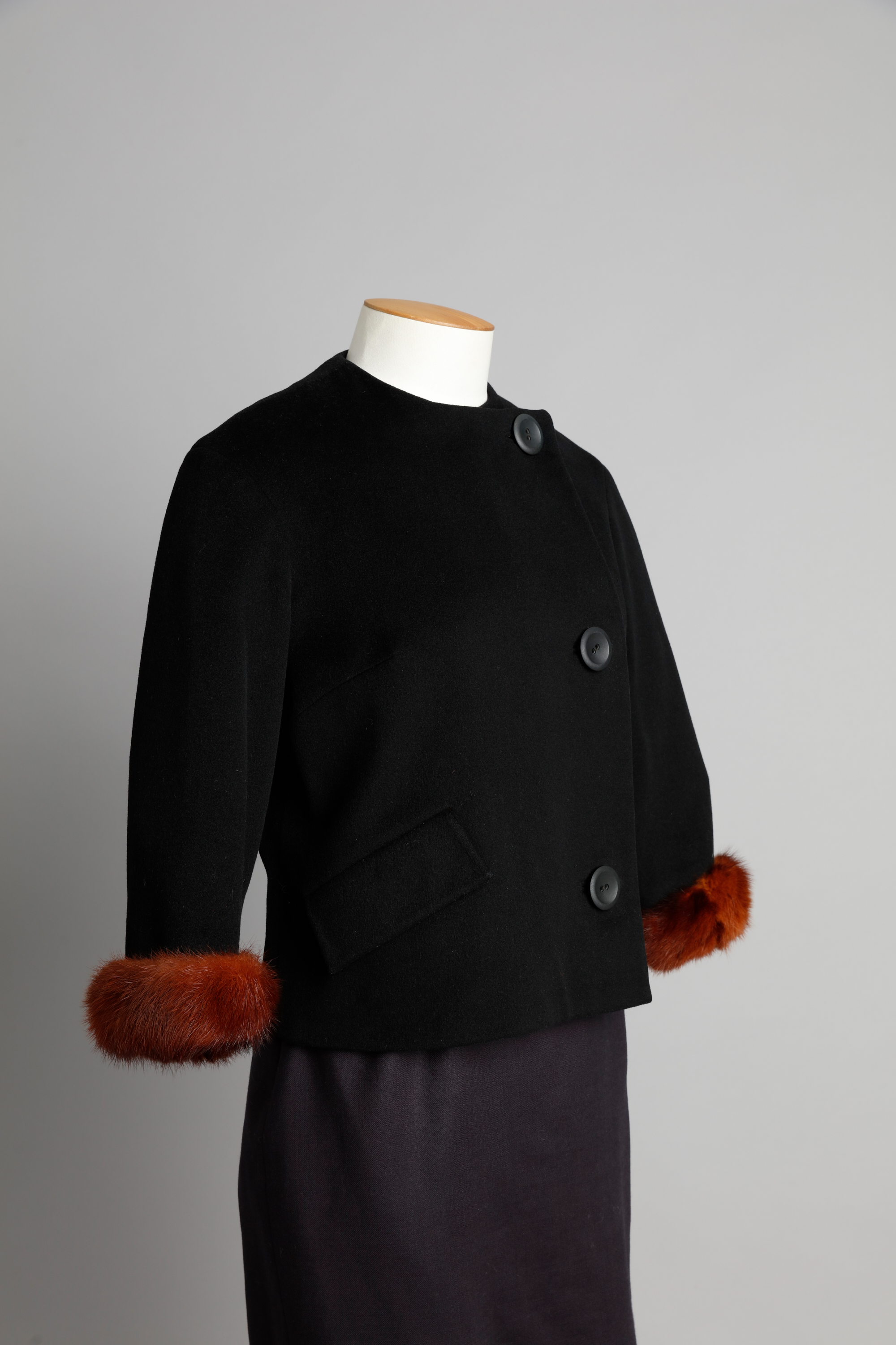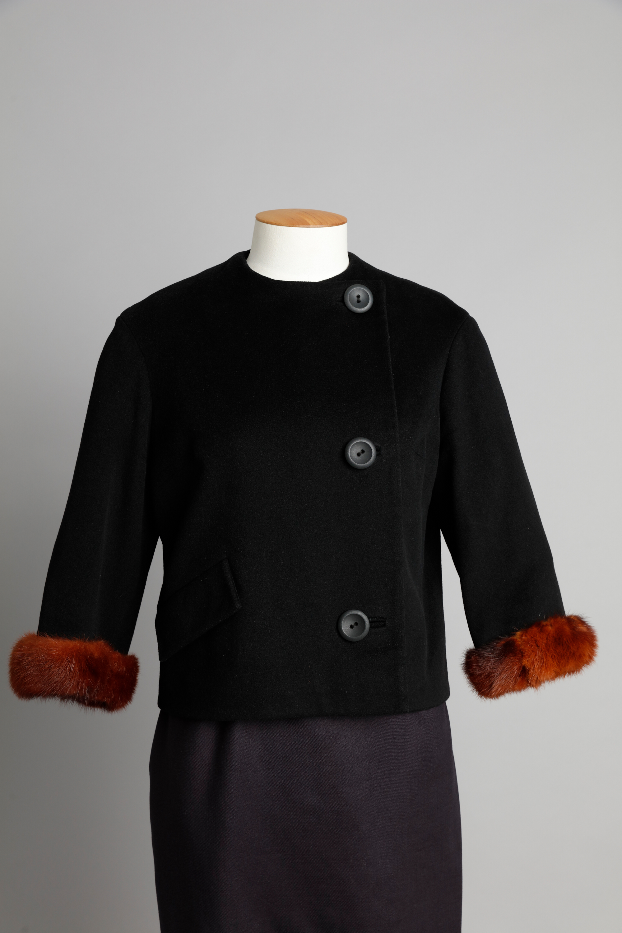 Asymmetric closure with bound buttonholes. The bracelet length sleeves are trimmed with real fur.