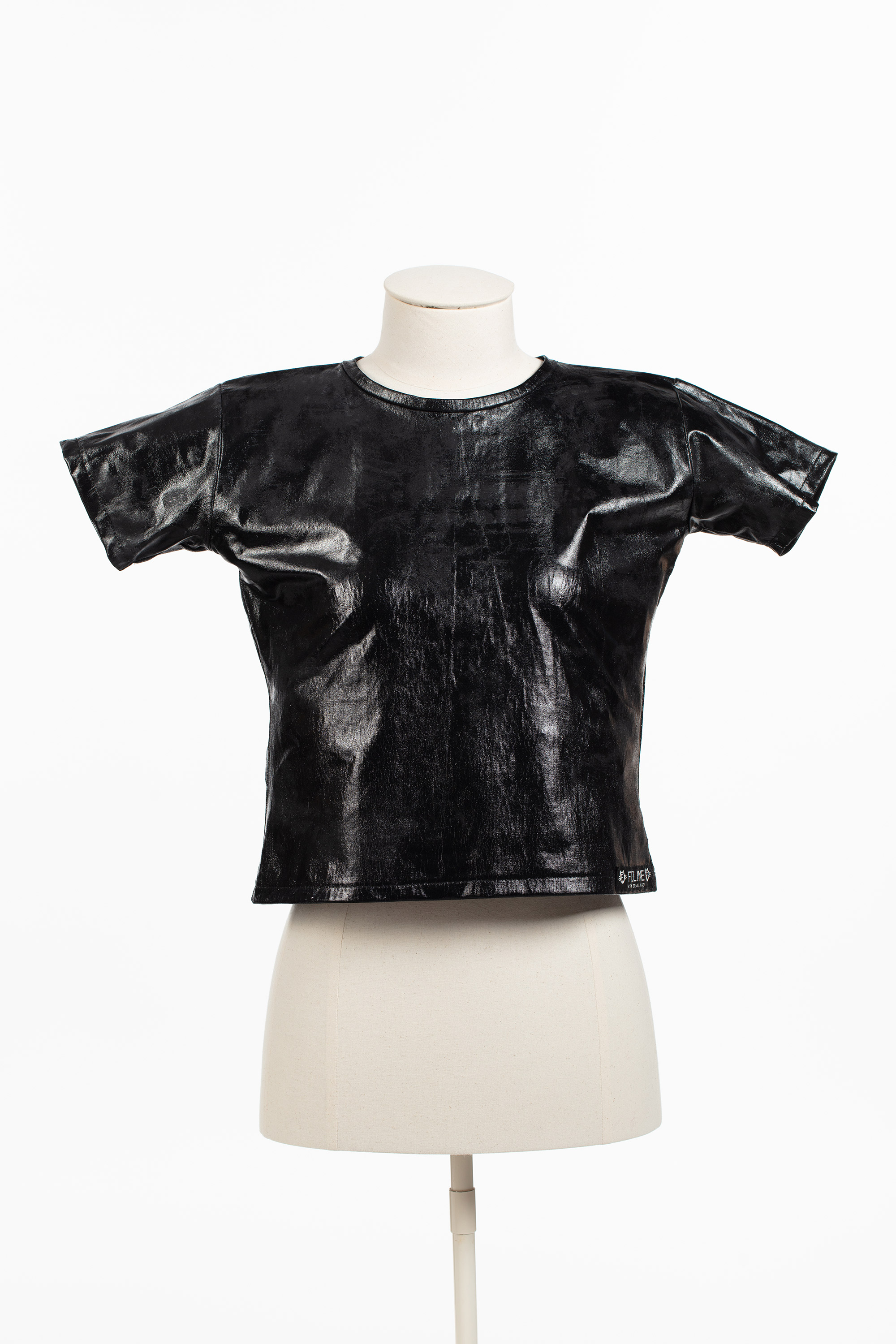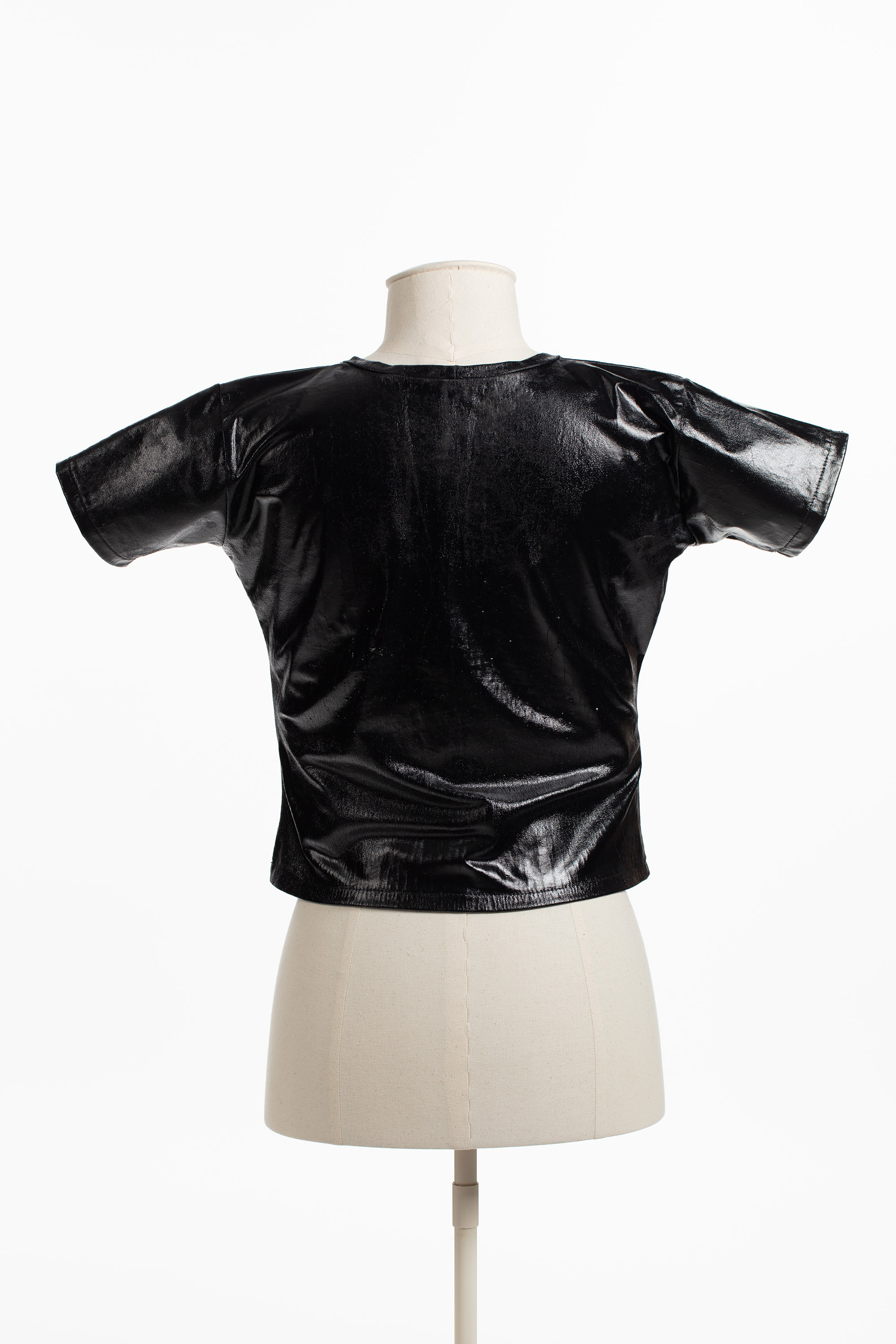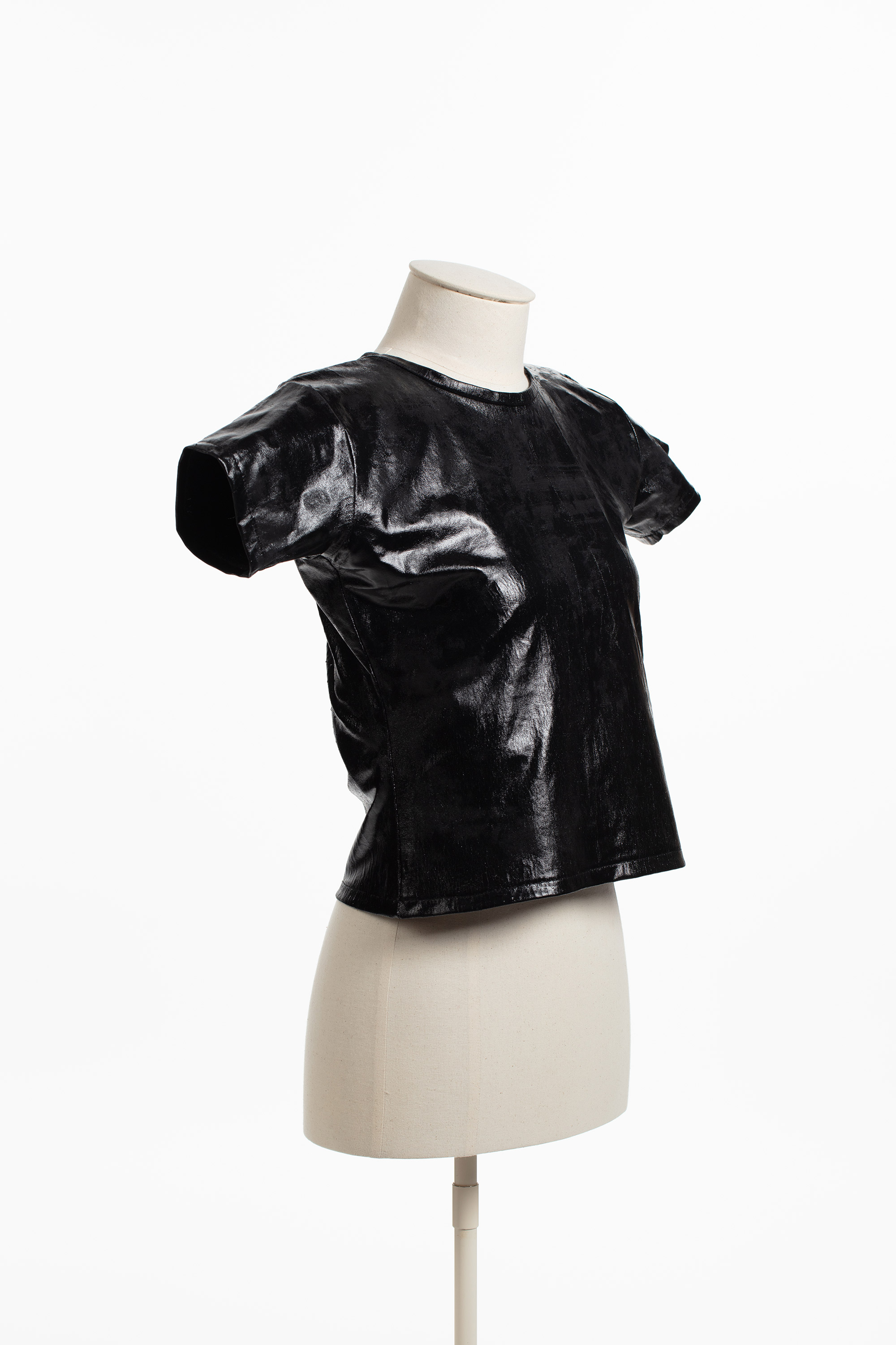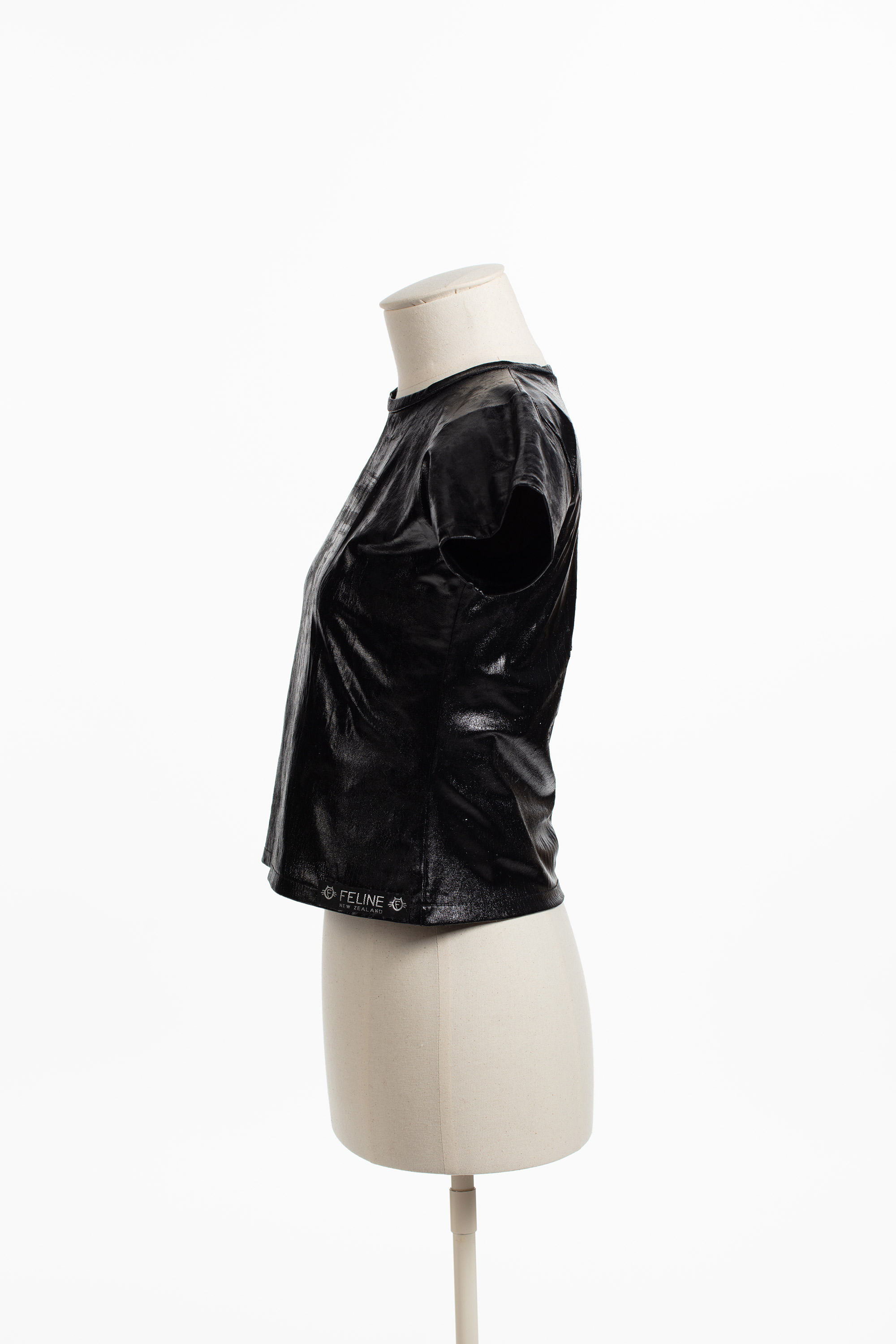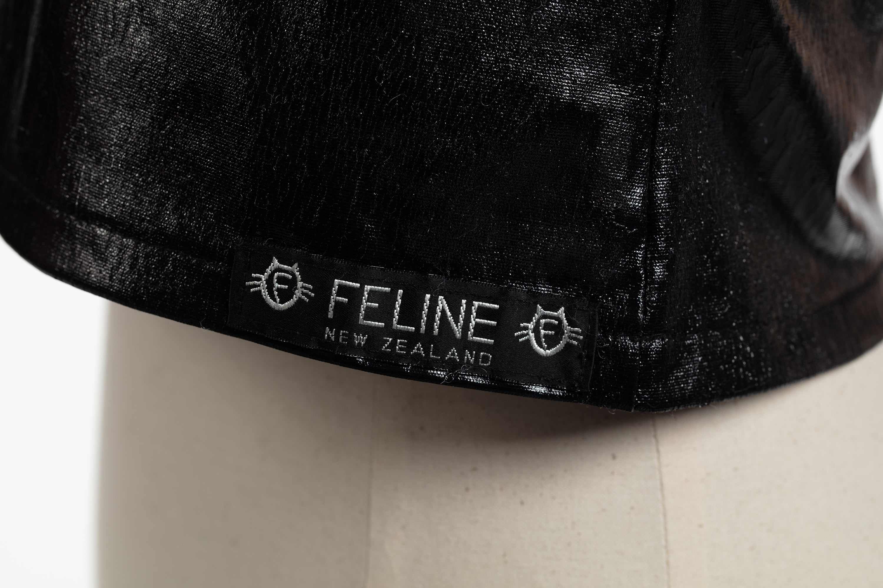 This Feline top was designed by Tanya Sheridan and Andrew Bishop. They started their label in 1986. After several years in a shop in Auckland's Wyndham Street, they moved to Century Arcade on High Street. Feline often used PVC for their garments. In the 1990s fabric mills developed new stretch wet look fabrics using PVC bonded to knitted fabrics. Andrew recalls that PVC garments were immensely popular with fashion stylists and customers.