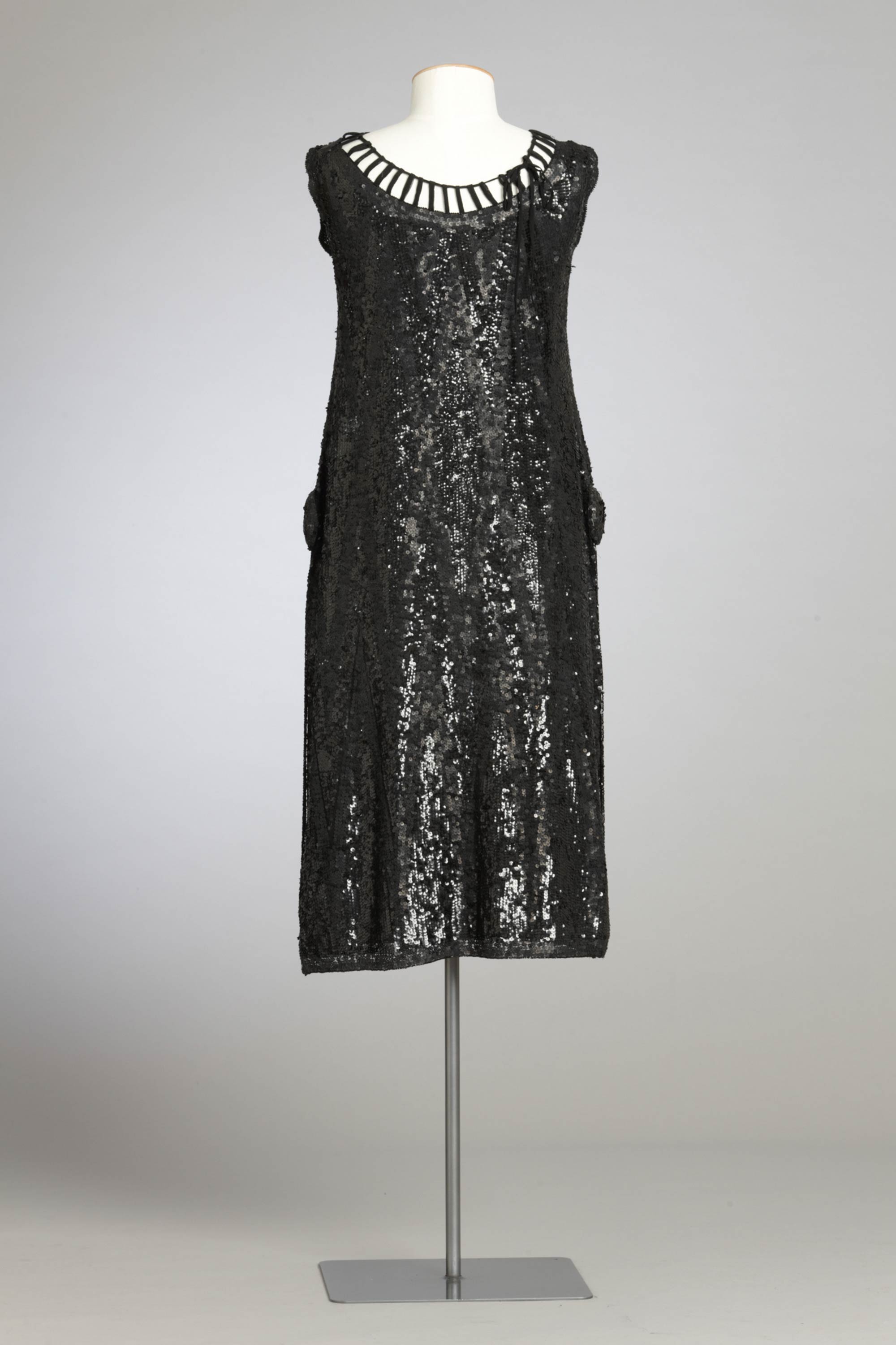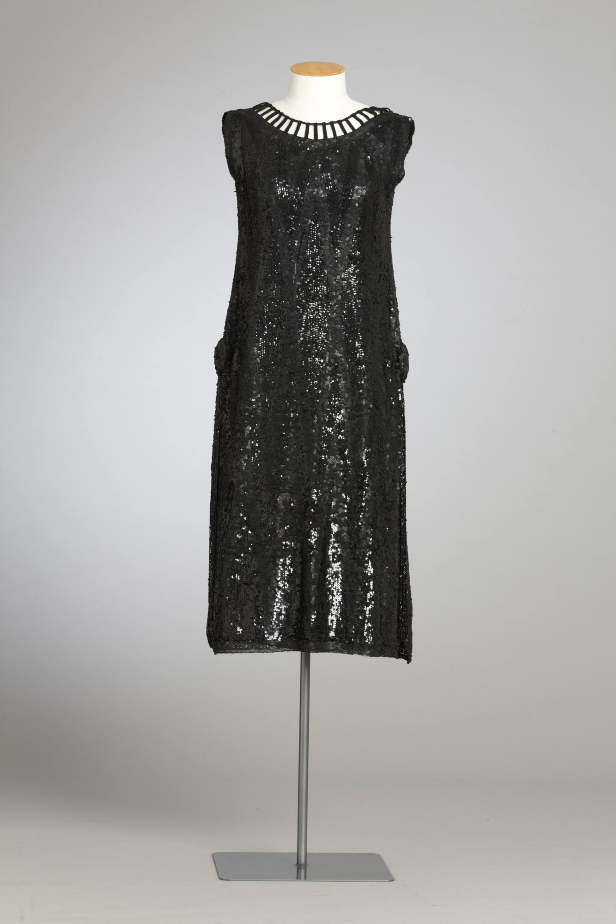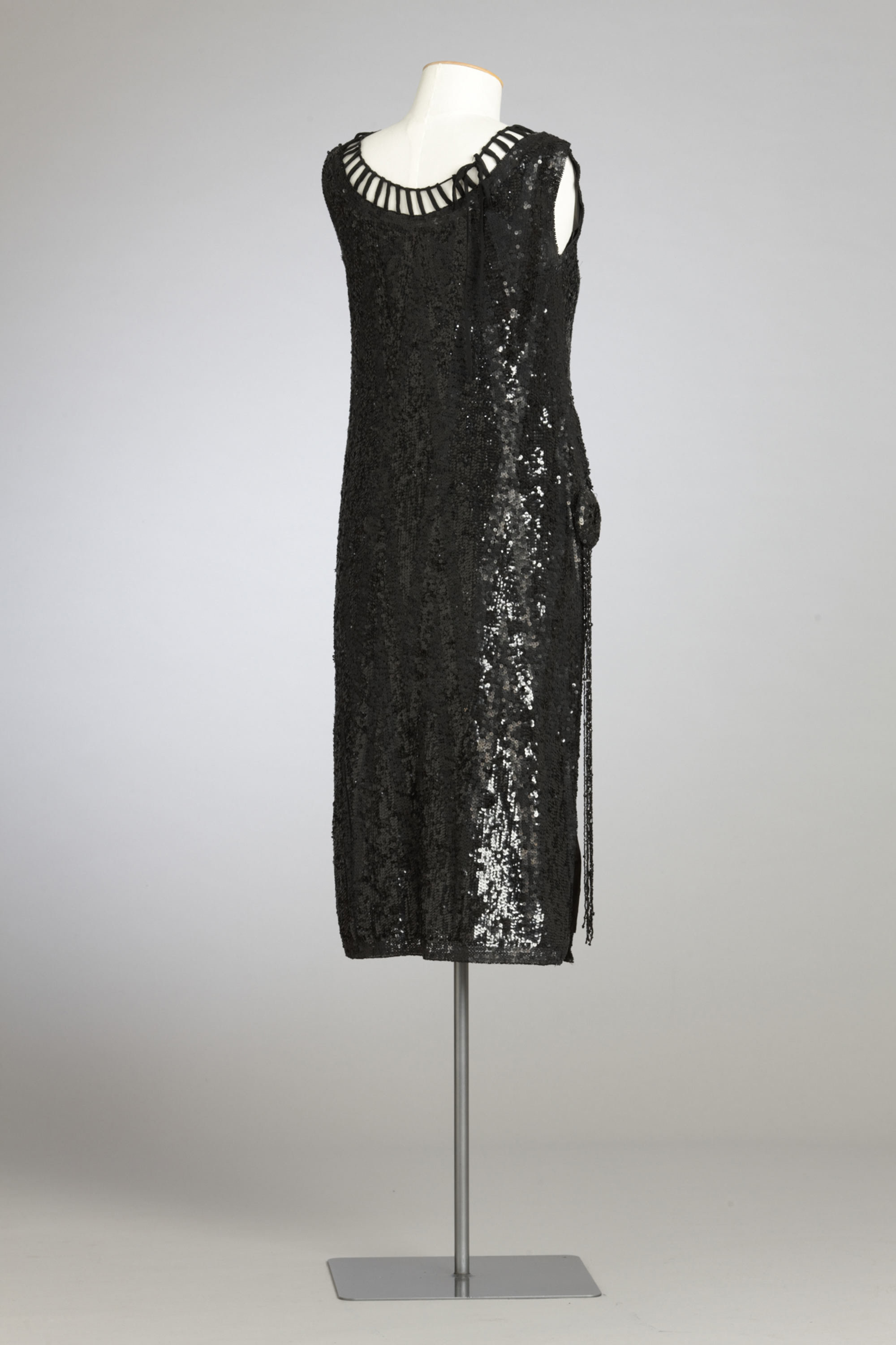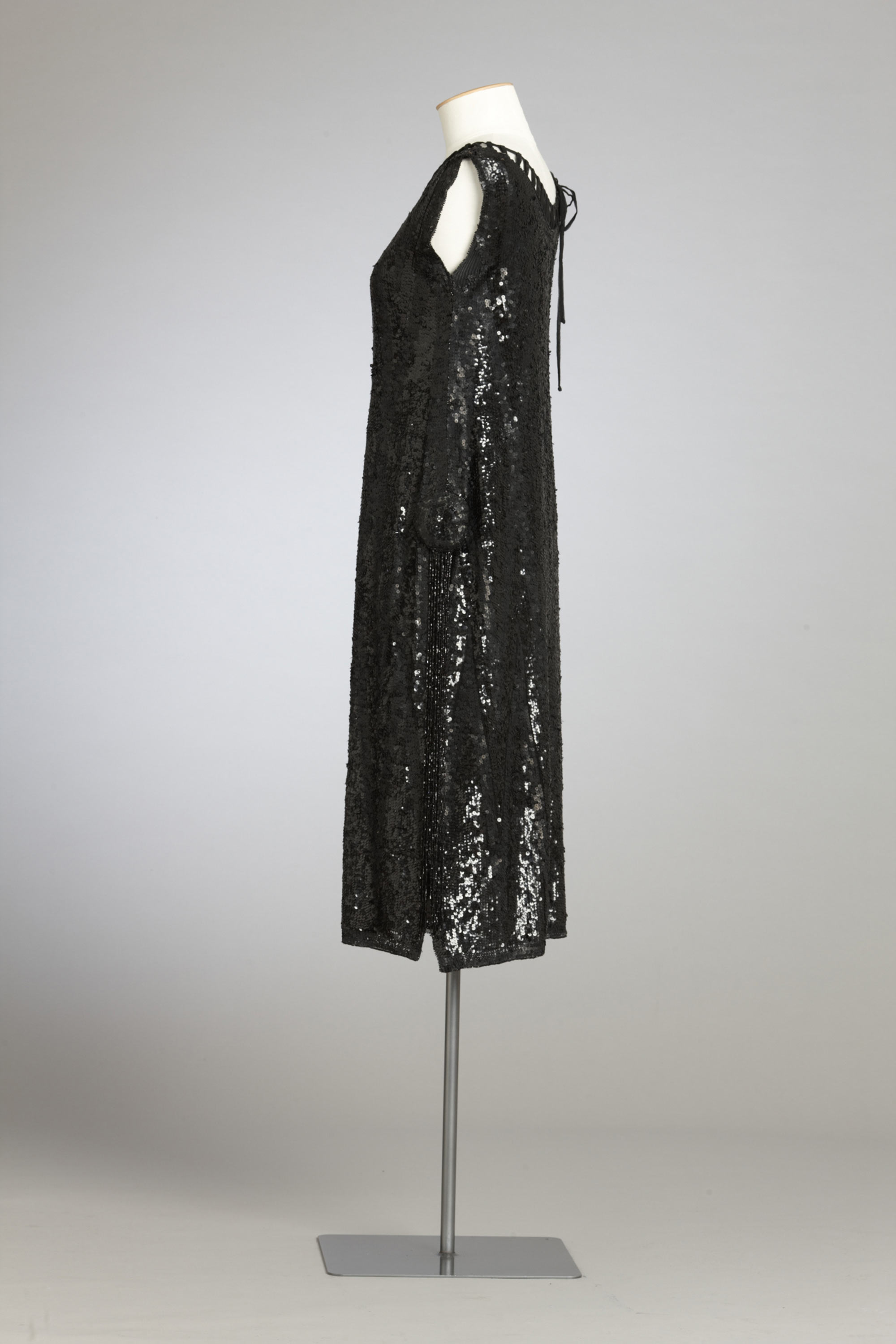 the bobbed hairstyles of the day represented a new freedom for women. The original owner of this dress, Josephine McGuire, was a married woman with three children. When she was 37 she established a dress shop named The Elite in Trafalgar Street, Nelson. We see her fashion sense in the 1925 photo of Josephine with her husband Edward and their three children Jack, Kevin and Leonie. Read more about wearing the colour black in the New Zealand Fashion Museum publication Black: The history of black in fashion, society and culture in New Zealand.