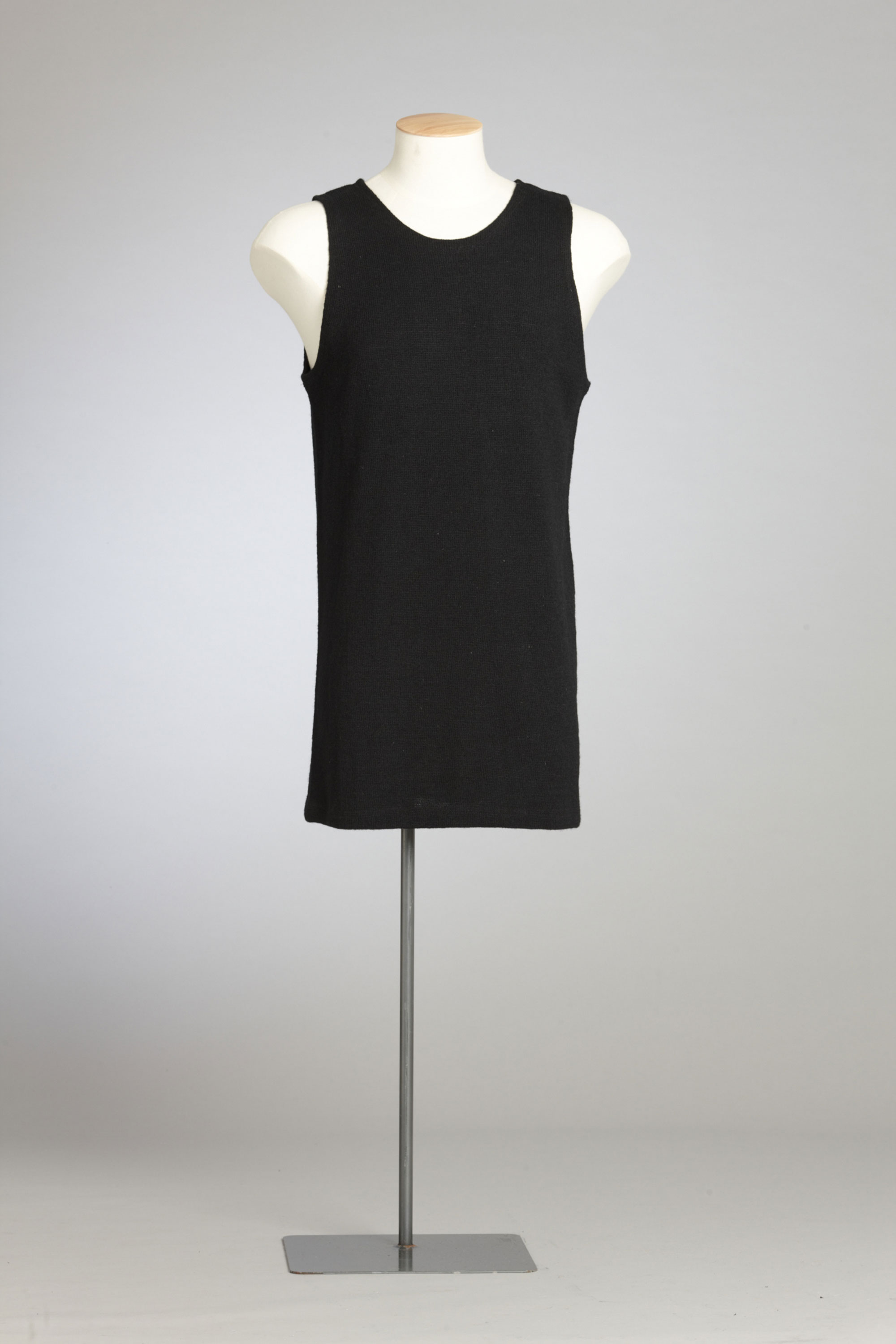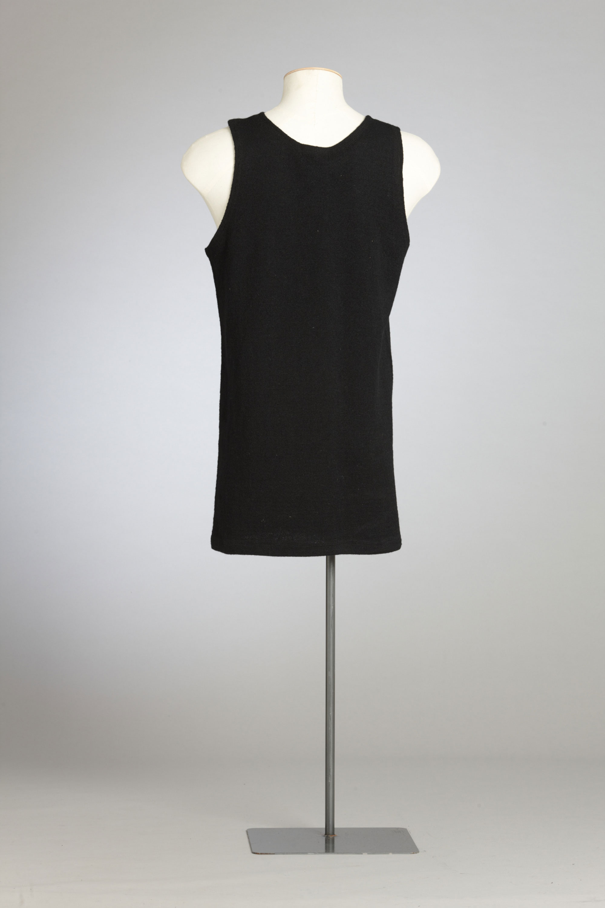 Traditionally shearers wore a black singlet, thick trousers and moccasins cut from a wool bale. Today, they wear custom-made shearing pants and coloured singlets. The black woollen singlet allowed shearers to keep warm, while freely moving their arms, and the extra length protected their kidneys. Pure wool has the added bonus of fire resistance, as attested at field days where people were encouraged to put a blowtorch to a singlet to test this theory. This singlet is from the Manawatu Knitting Mills, founded in 1884 by Mary Alice Stubbs and her husband, John Stubbs. Originally the company produced hosiery in a converted farmhouse, and has evolved to become one of Australasia’s largest knitwear producers. Read more about wearing the colour black in the New Zealand Fashion Museum publication Black: The history of black in fashion, society and culture in New Zealand.