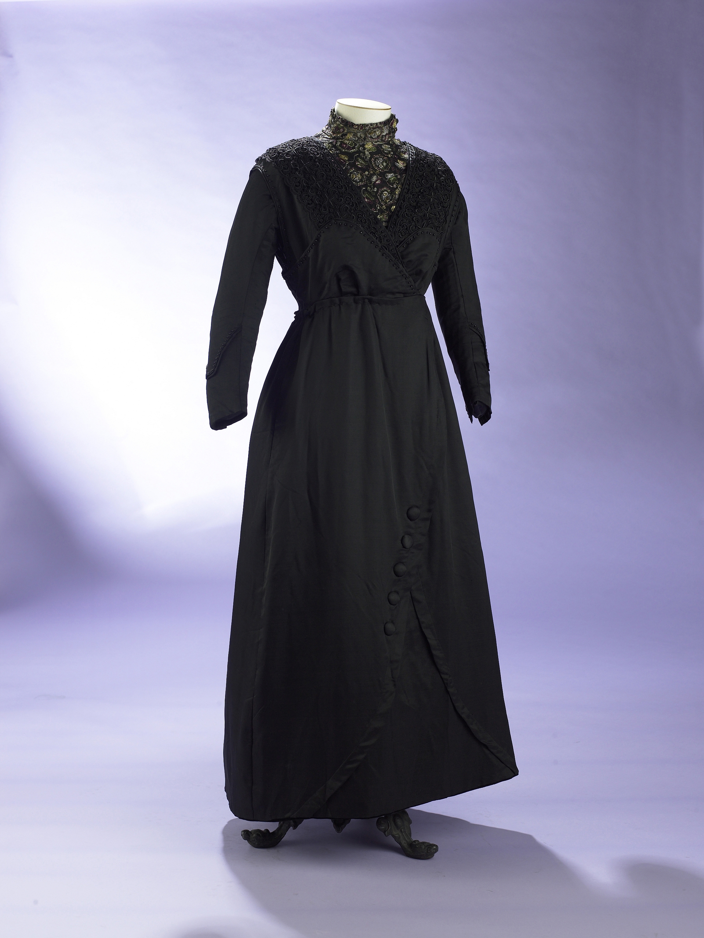 Black silk day dress with embroidered yoke