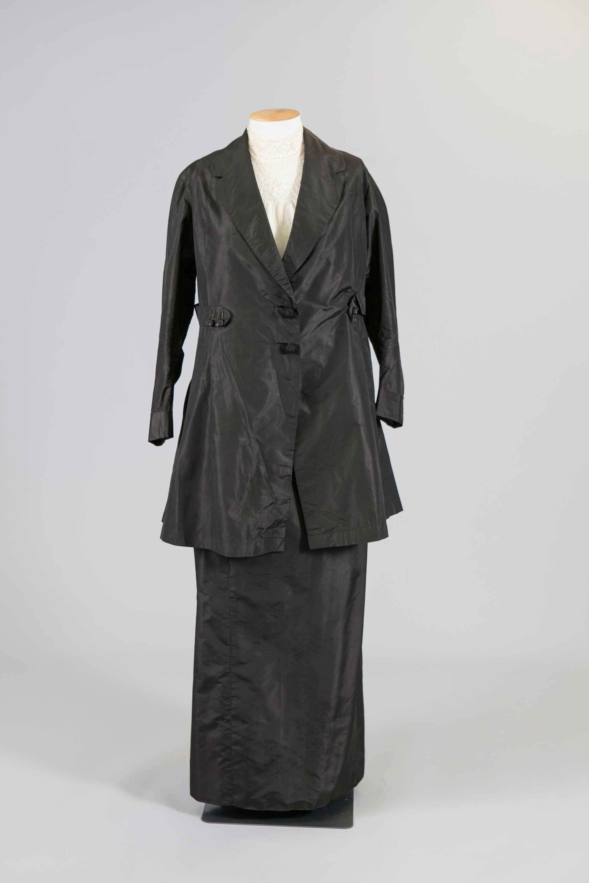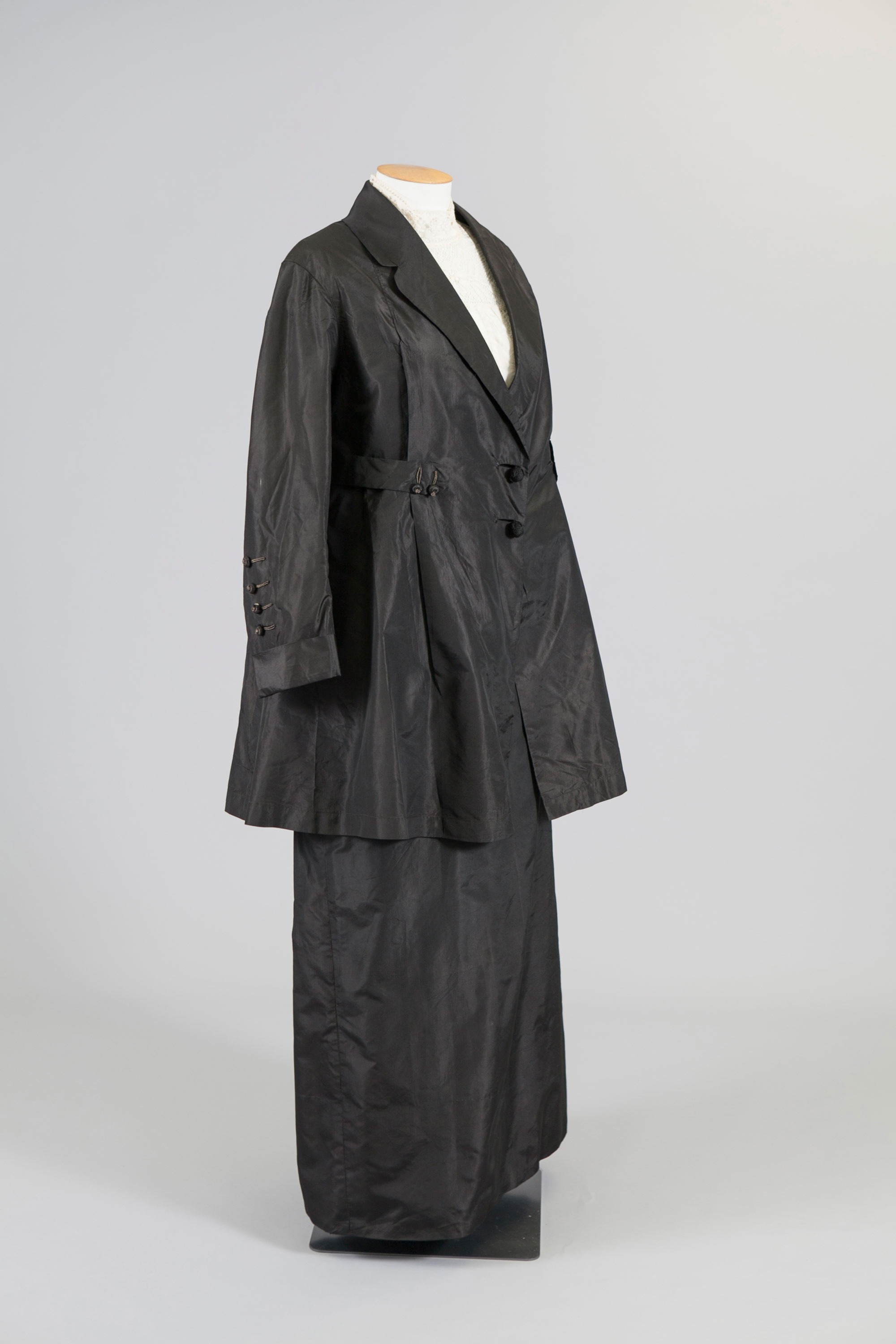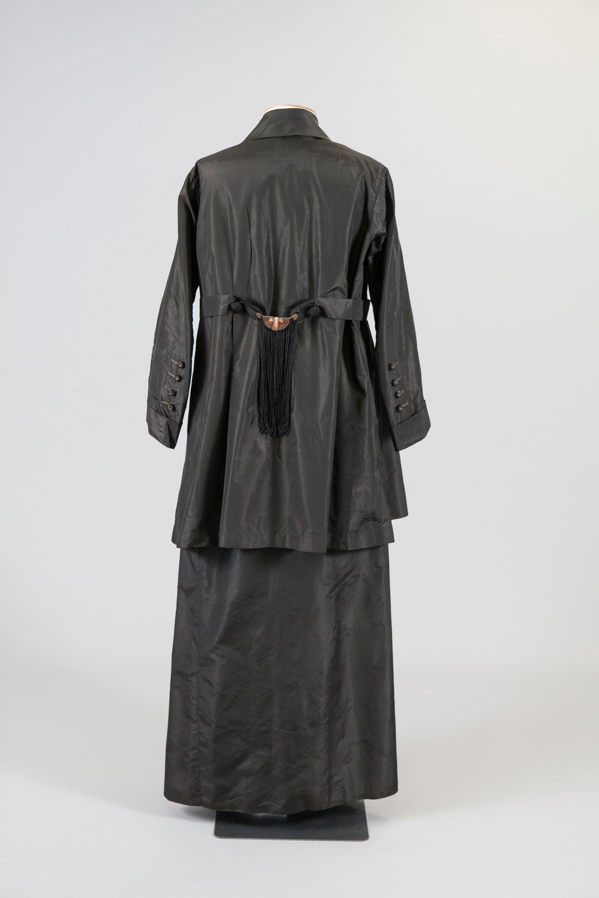 Black taffeta jacket and skirt suit with tasselled tie at back, 1915