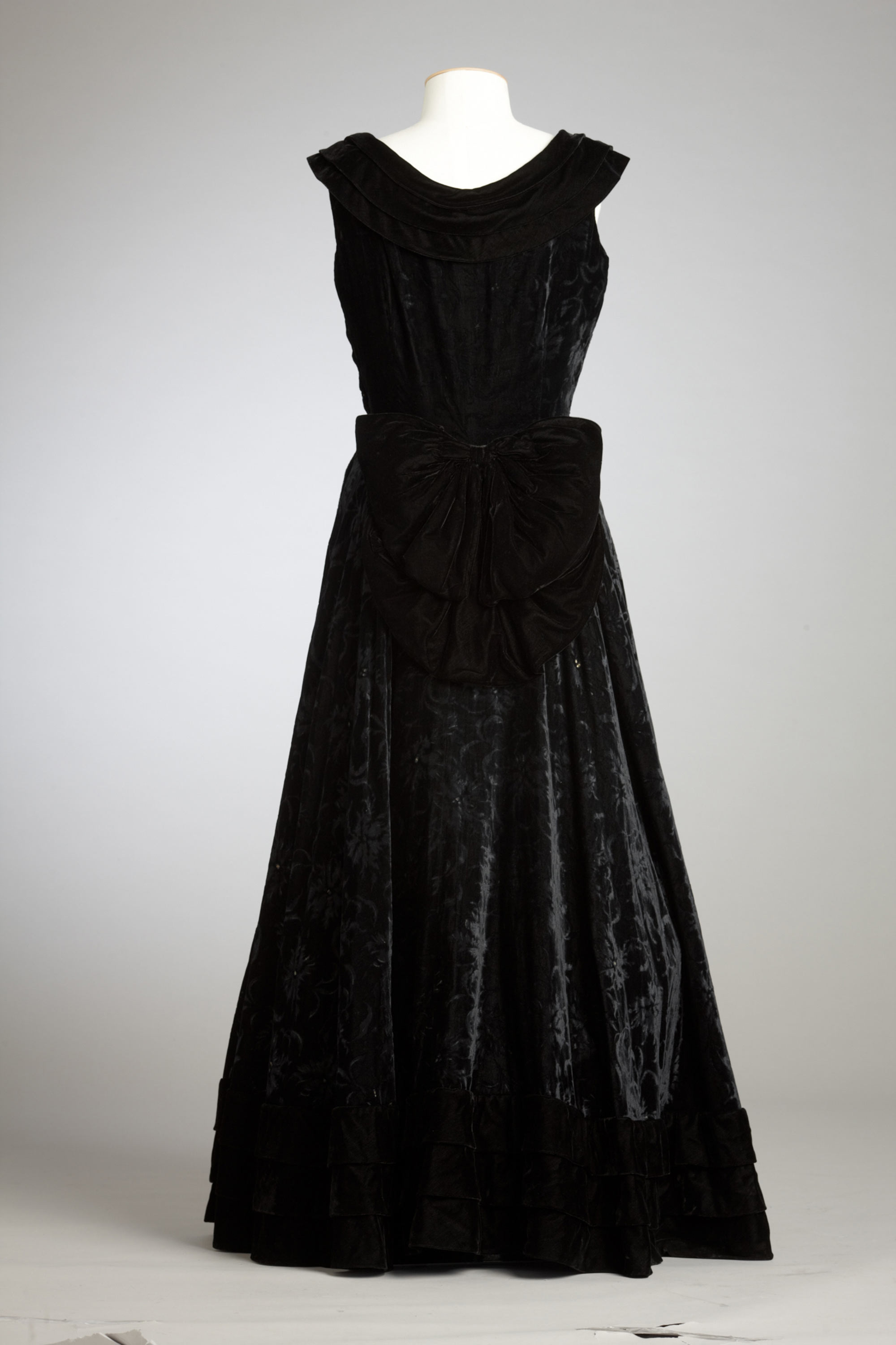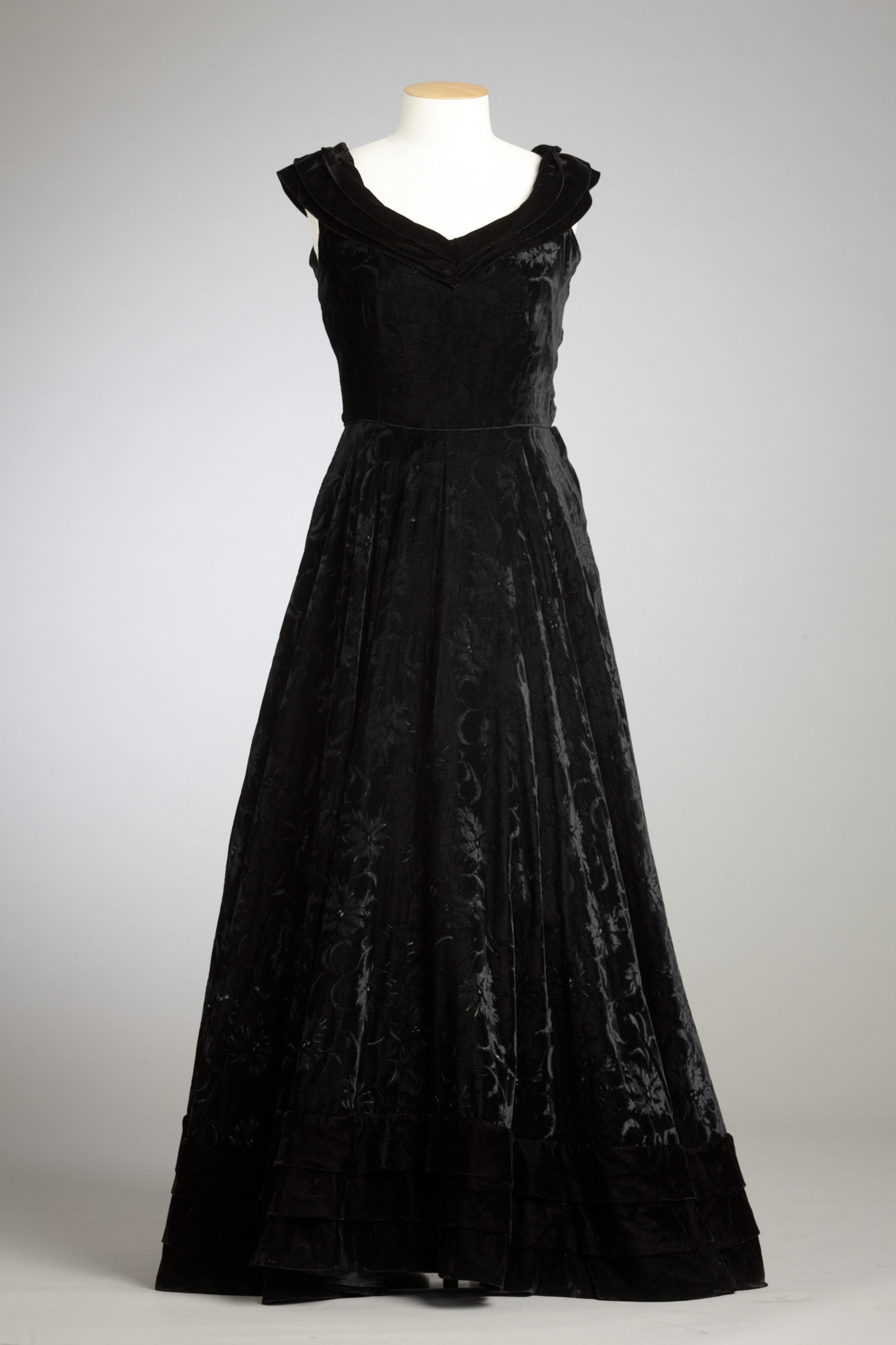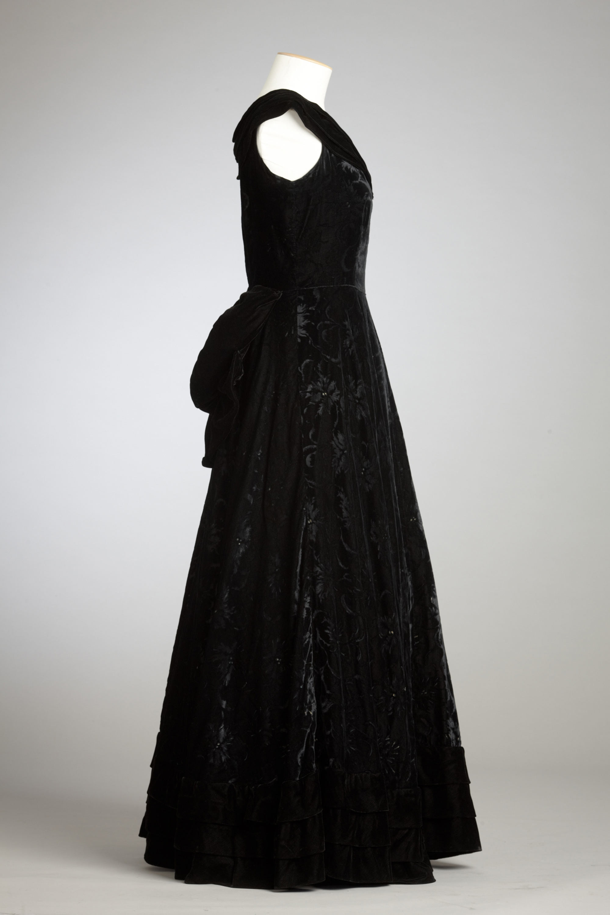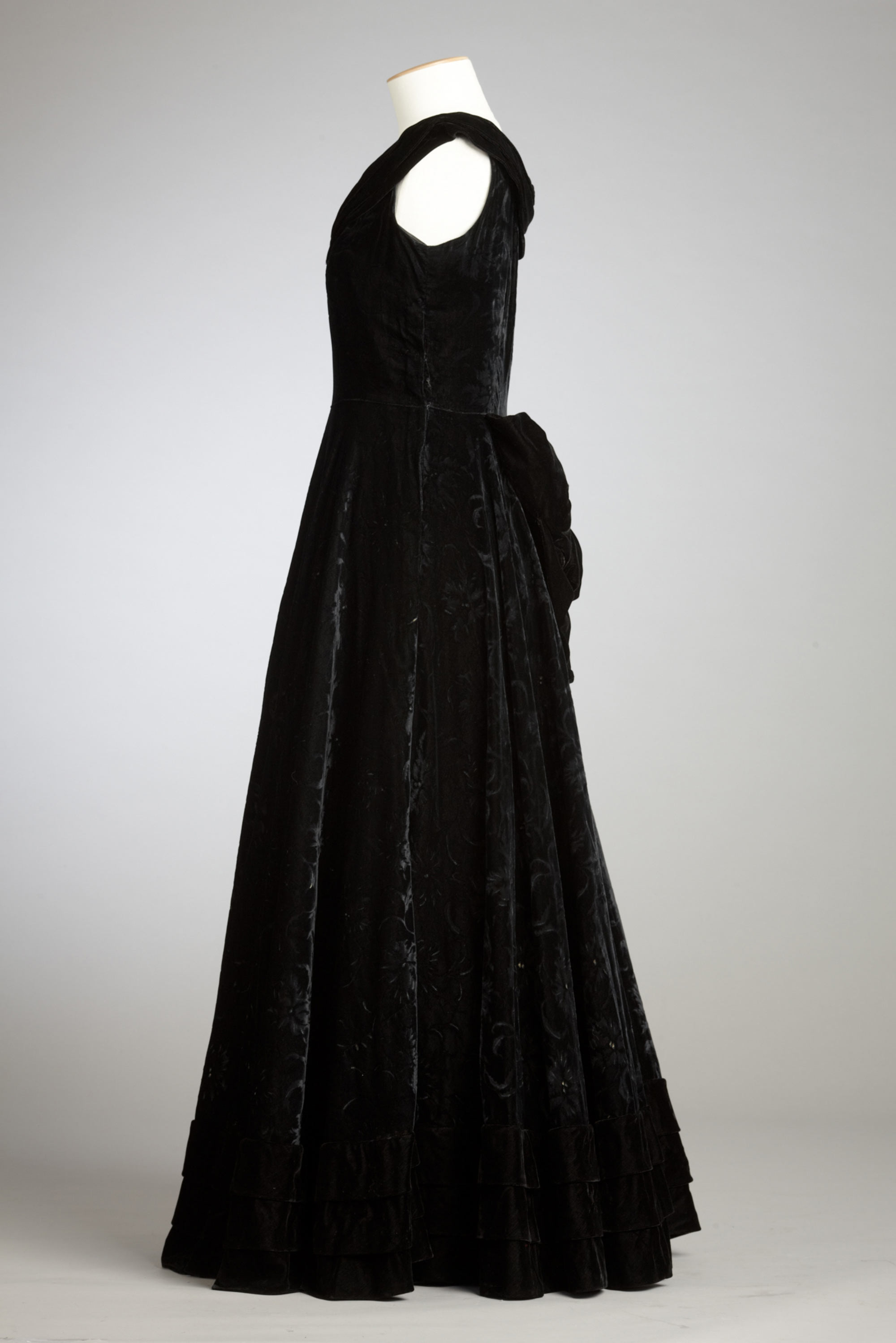 This luxurious gown was made for Mrs Dorothy Cameron, on the occasion of her daughter Mayford’s debutante ball in Dunedin in April 1948. The fullness of the skirt, the triple-layered neck and hemline and the bustle-like velvet bow are in extreme contrast to the fabric-conserving shapes prevalent just a few years earlier during the war. While the fashions from Paris were not yet available in New Zealand shops, they were seen and talked about in magazines and newspapers. This dress displays many of the fashionable attributes of the day with its soft décolleté, fitted bodice and profligate use of fabric – the hemline measures 6.5 metres. Debutante Balls were an important social occasion when young women were formally introduced to their social circle. It was a practice common to many groups – young Catholic women were presented by their father or brother to the Bishop of the Diocese, the daughters of Freemasons made their curtsies to the Masonic Lodge Grand Master and young Māori women were presented to the Māori Queen. It was an important event in the social calendar and warranted the acquisition of new formal garments for all involved. Read more about wearing the colour black in the New Zealand Fashion Museum publication Black: The history of black in fashion, society and culture in New Zealand.