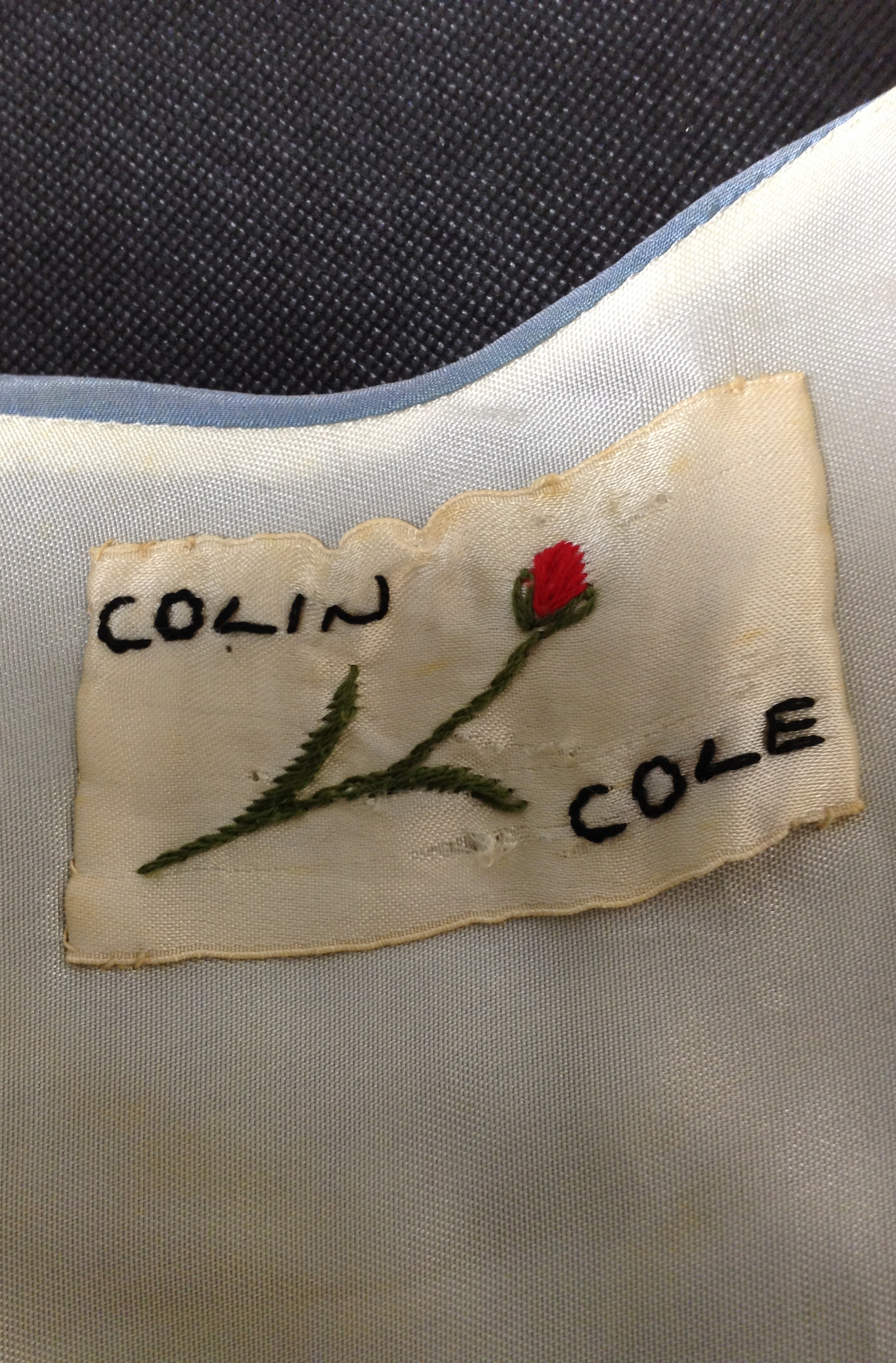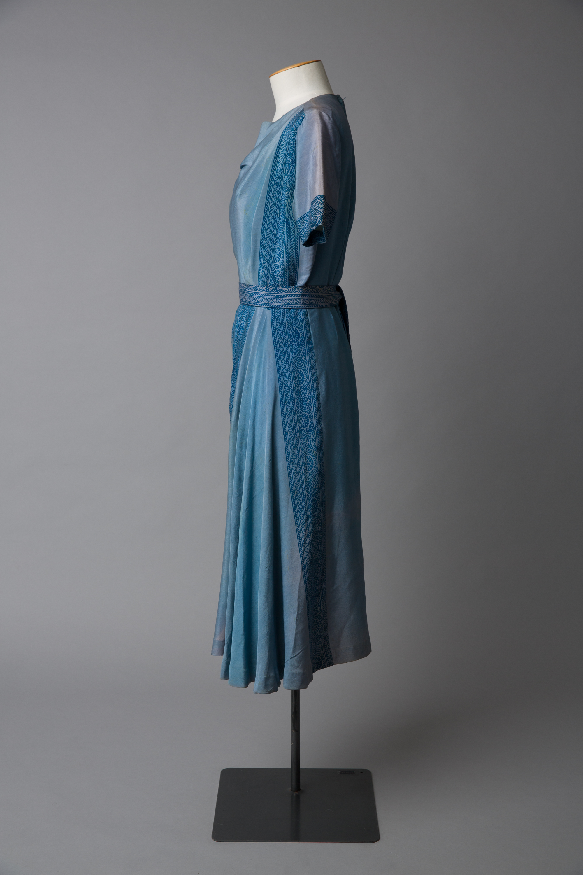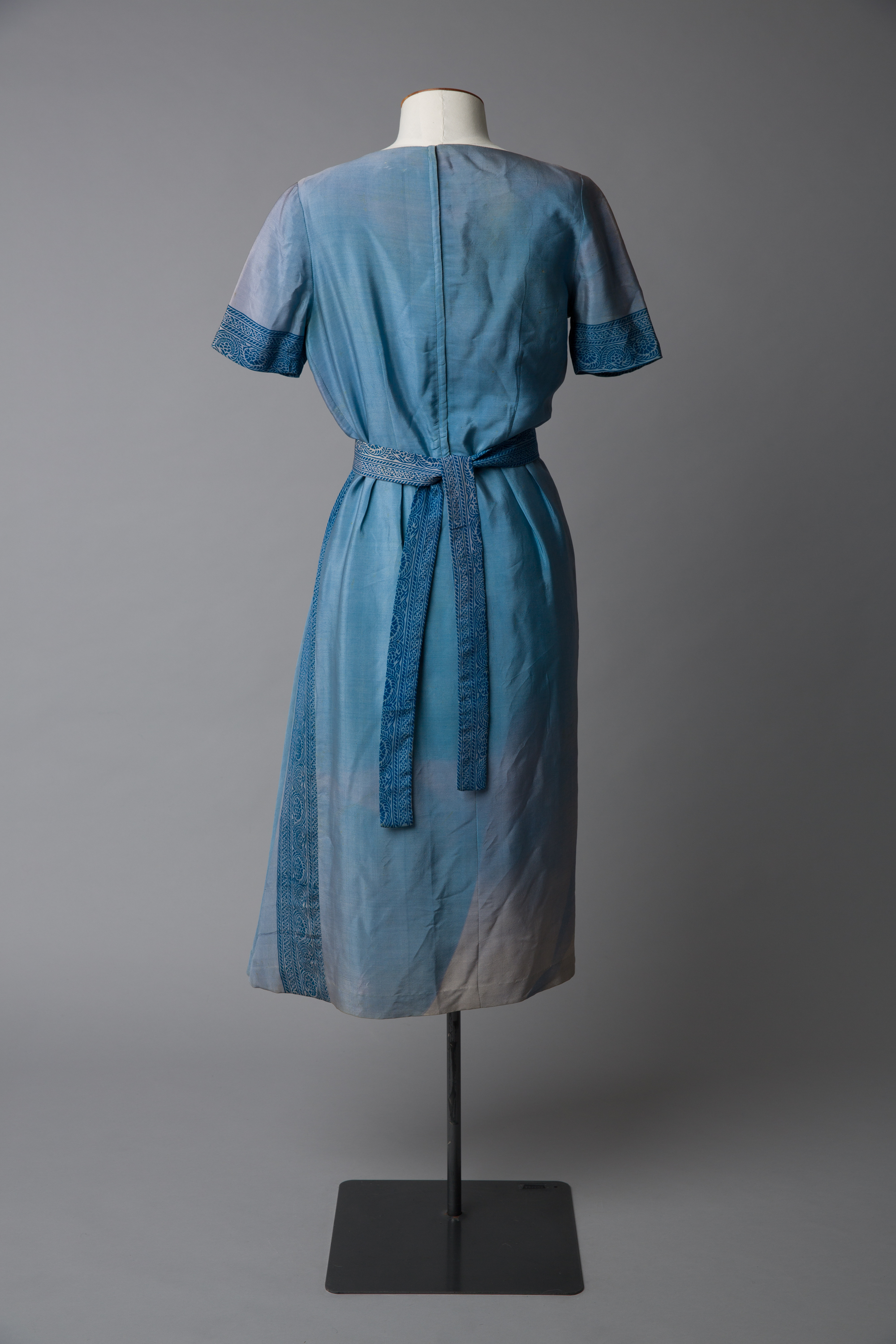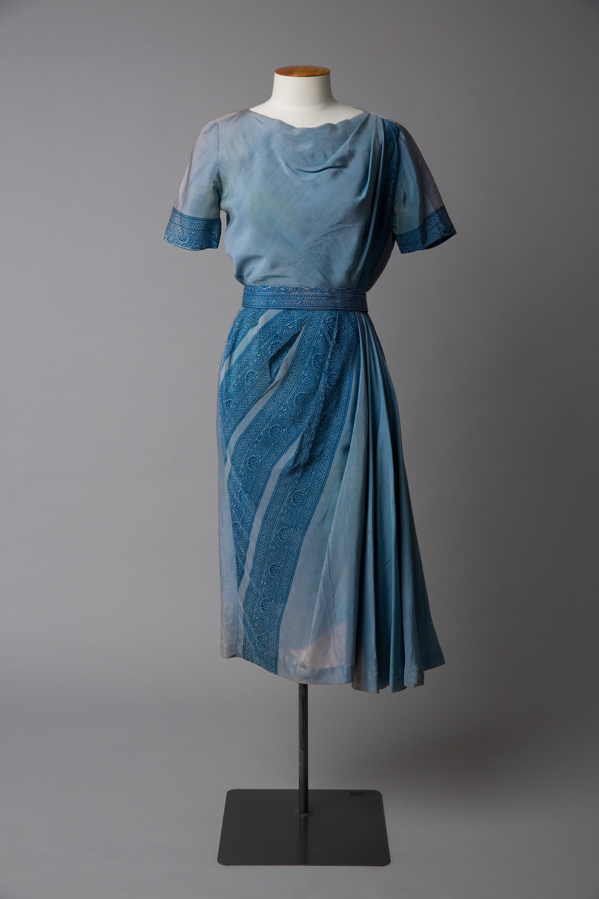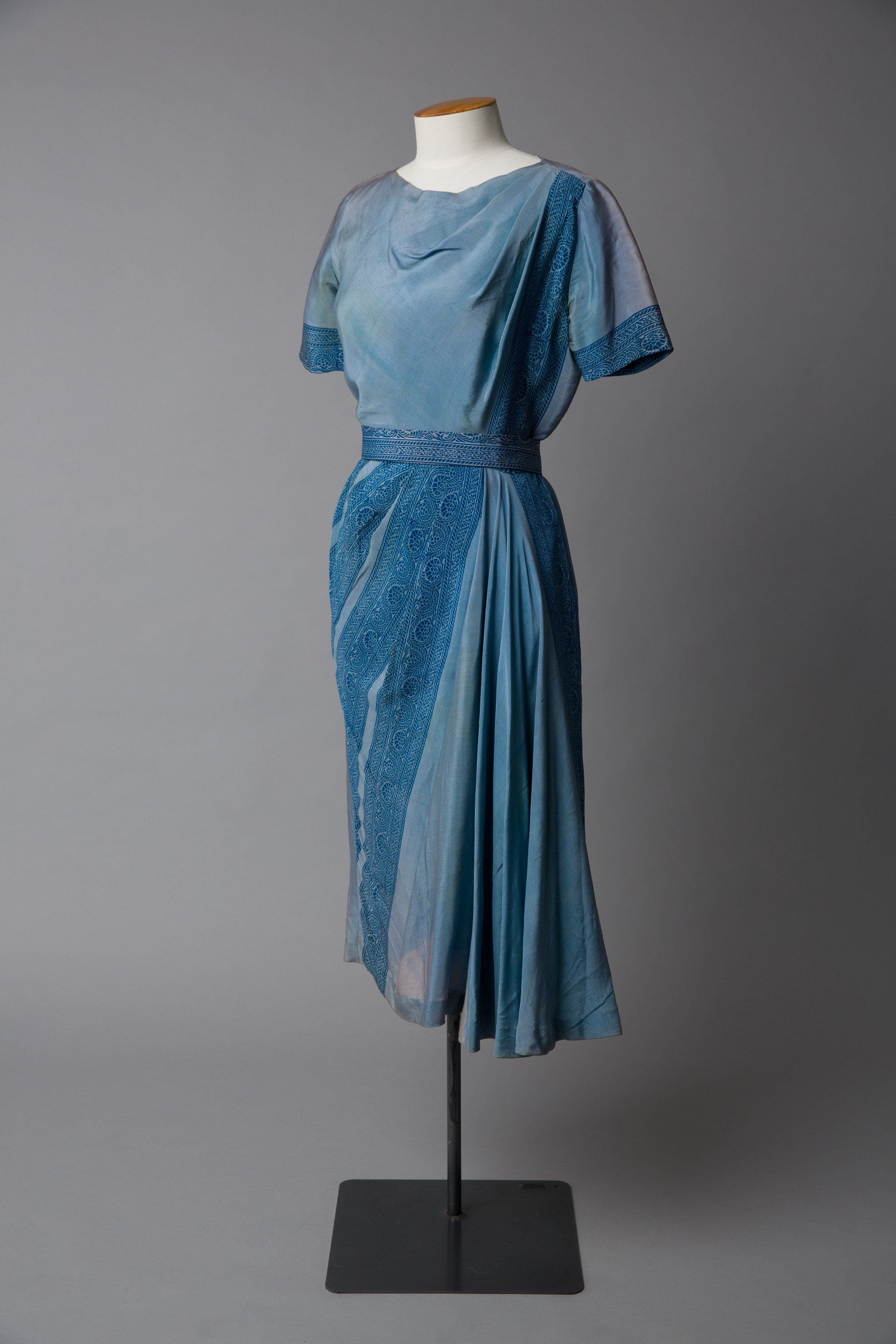 This blue Colin Cole dress has a sari drape front with a braided print trim. The fabric has been hand-dyed. Imports of fabric were limited by a system that required a licence and this restricted the options for designers who were in search of something original. The dress was owned by Helen Lillian Shaw who was a gifted short story writer, poet and editor. Aside from her writing she was known for her good looks and distinctive style, she favoured dressing simply often in skirts and high-necked Victorian blouses.