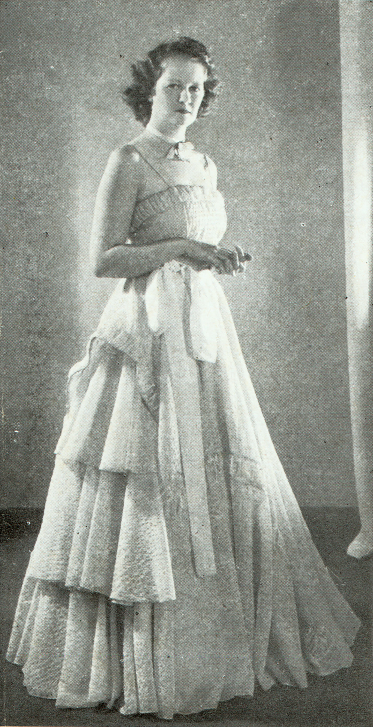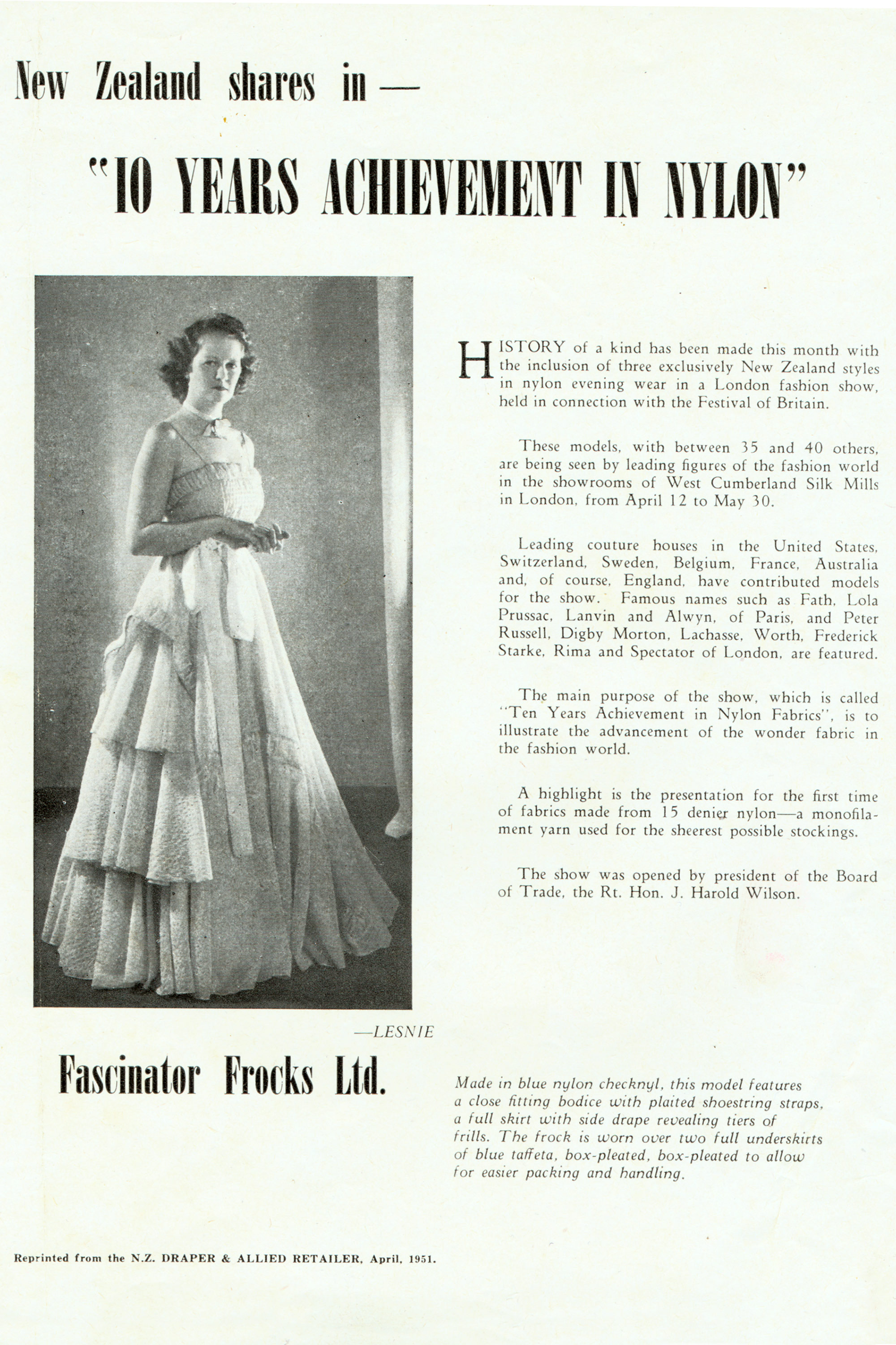Maud Barrell of Fascinator Frocks was asked to design a nylon evening dress to be exhibited at the Festival of Britain in 1951. Her design was included in a show held in the showrooms of the West Cumberland Silk Mills in London. The show illustrated the advancement of this 'wonder fabric' in the fashion world. The dress was made from pale blue Checknyl - a trade name for an early nylon fabric. Sekers provided only three yards of the fabric so the dress was carefully cut out with nothing left over.