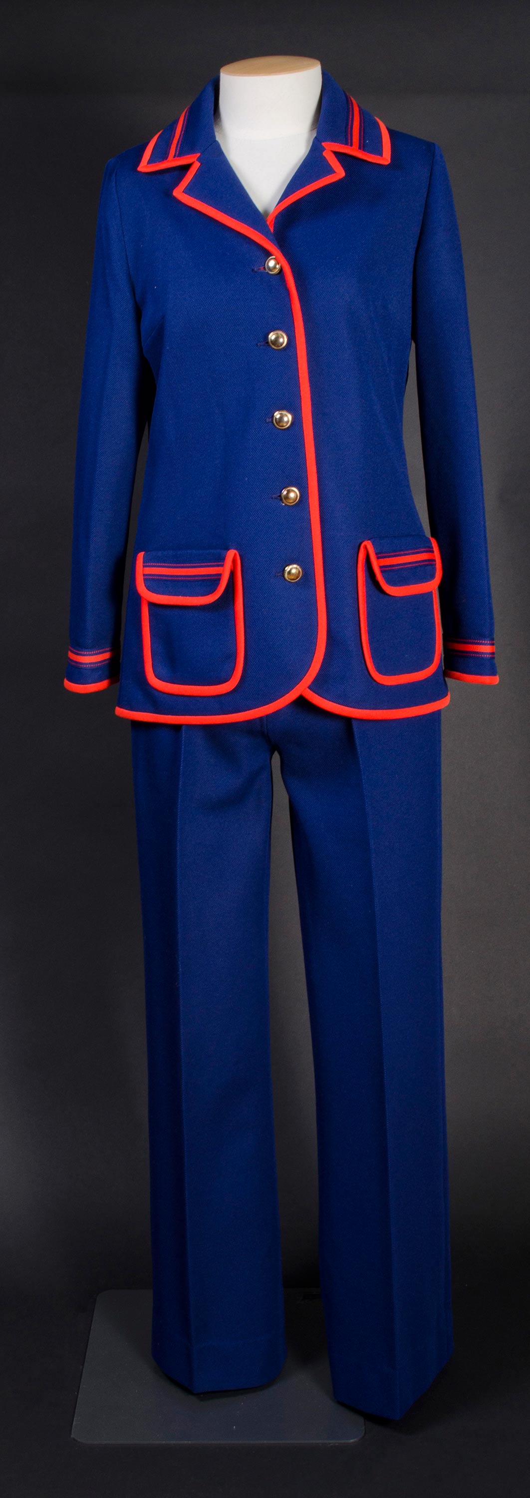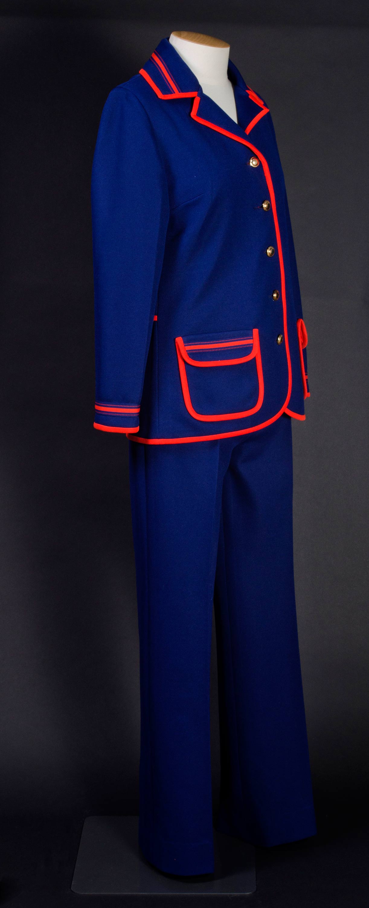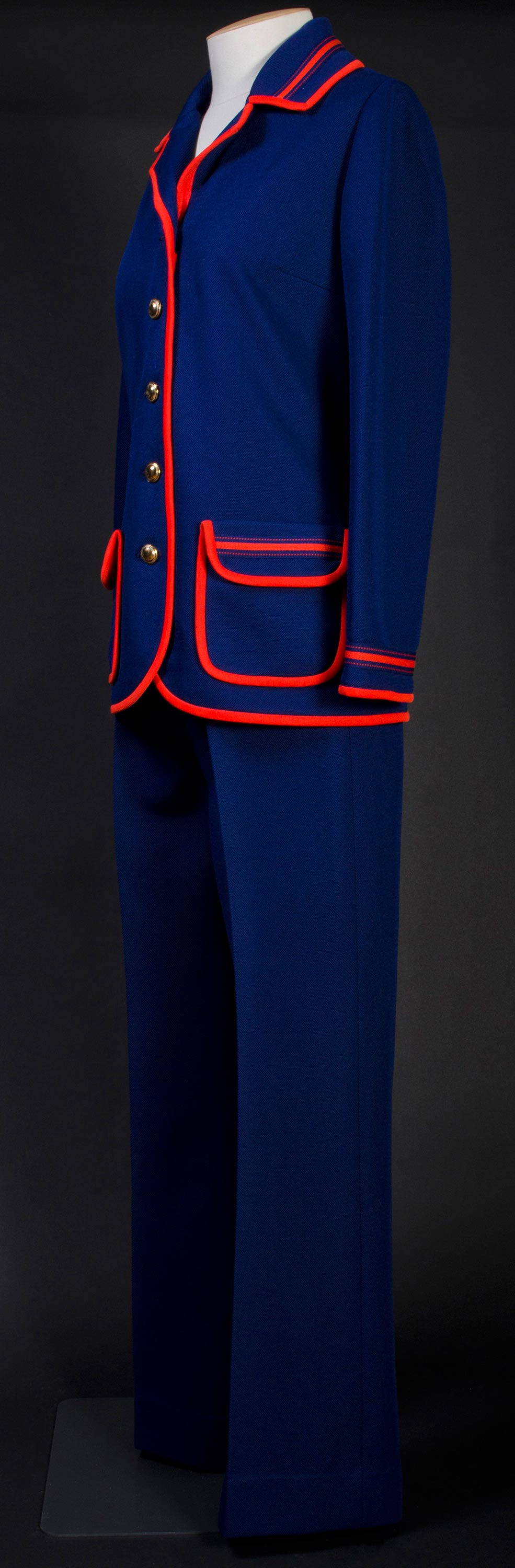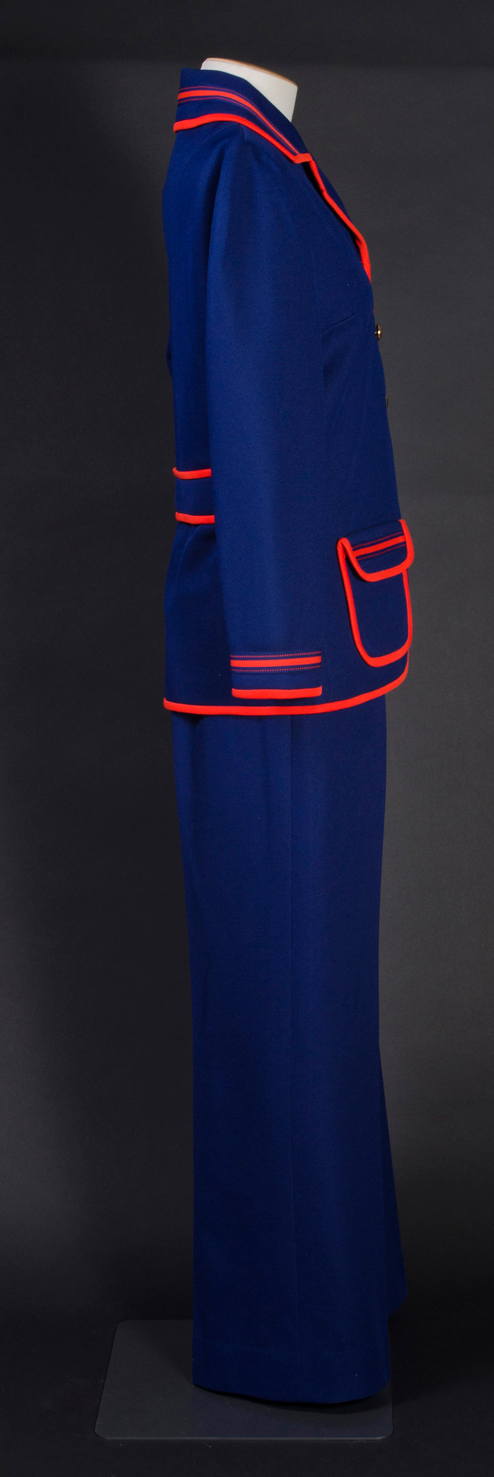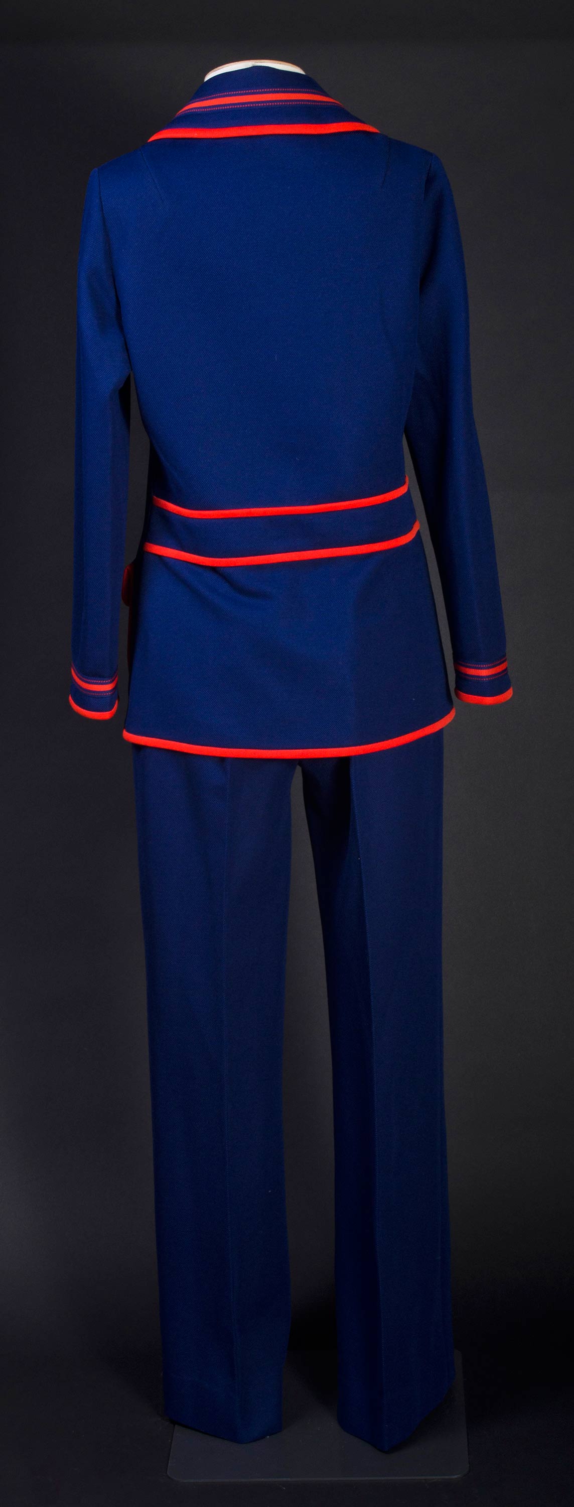 Blue pantsuit with red trim