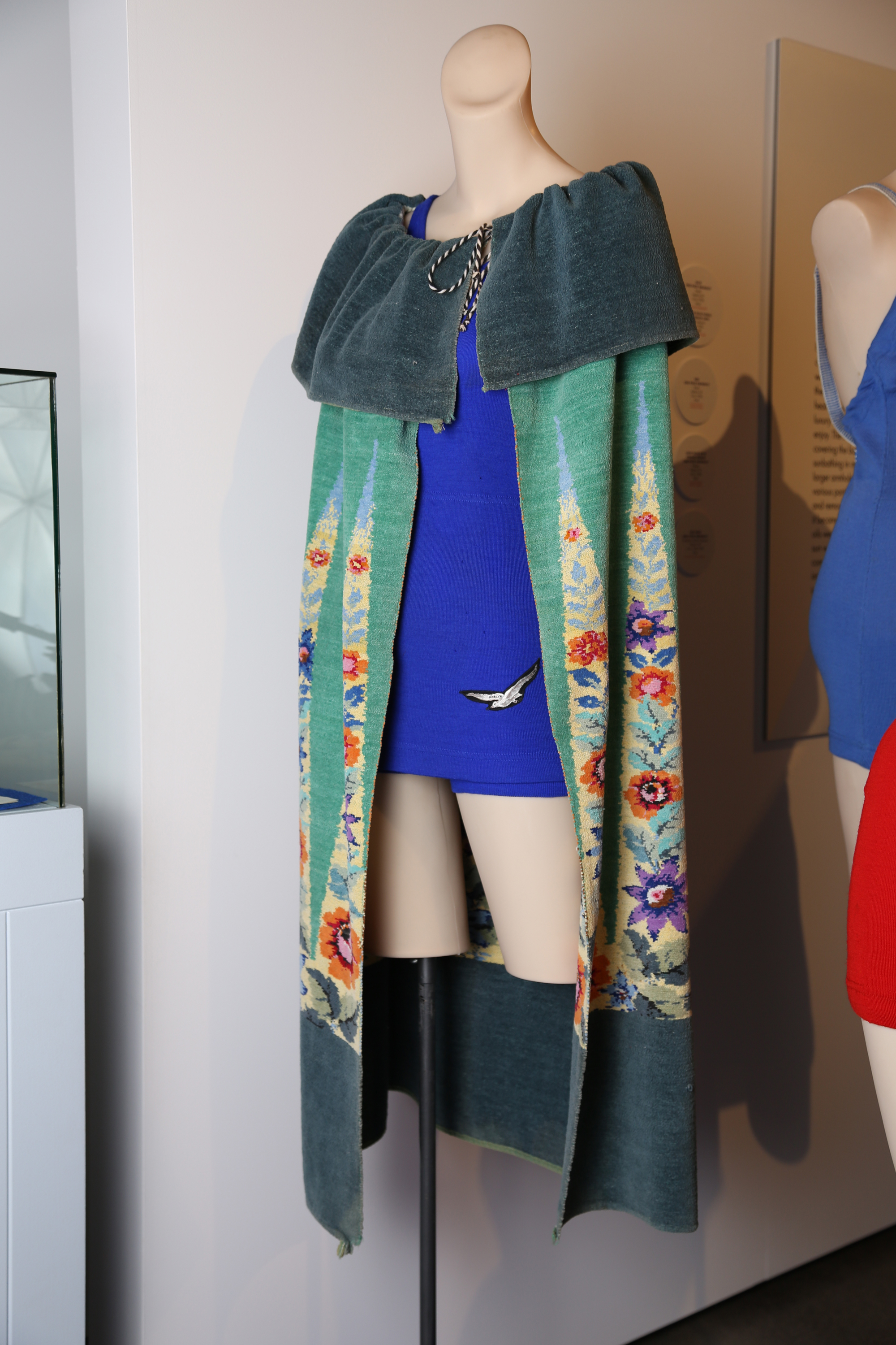 This swimsuit is labelled Roslyn - one of many labels used by Dunedin manufacturers, Ross & Glendining. Roslyn swimwear usually featured a badge featuring a swimming lady and a pair of wings. This style of cape was a glamorous, yet practical garment to wear the beach.