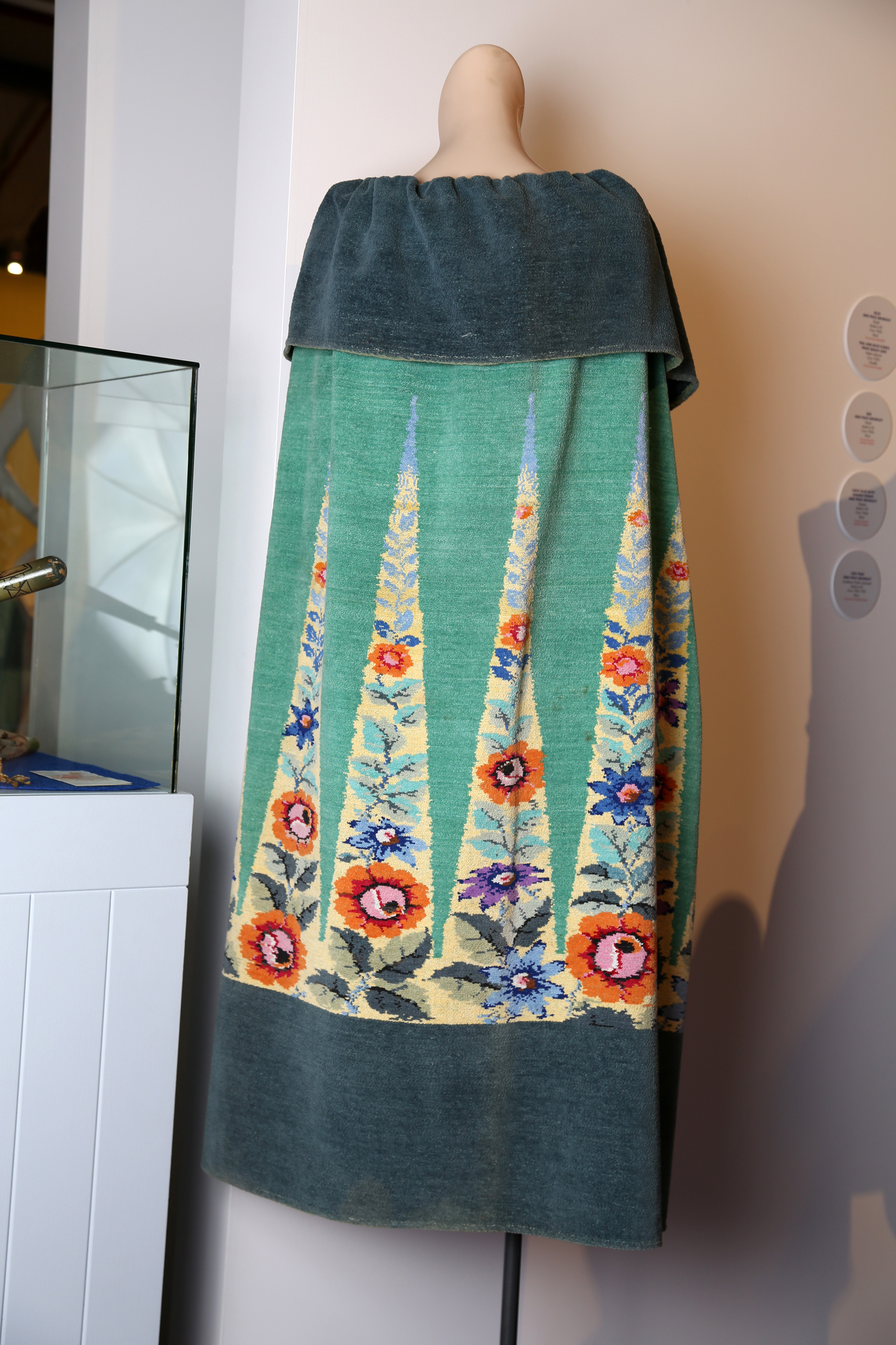 The cape has a a woven floral motif.
