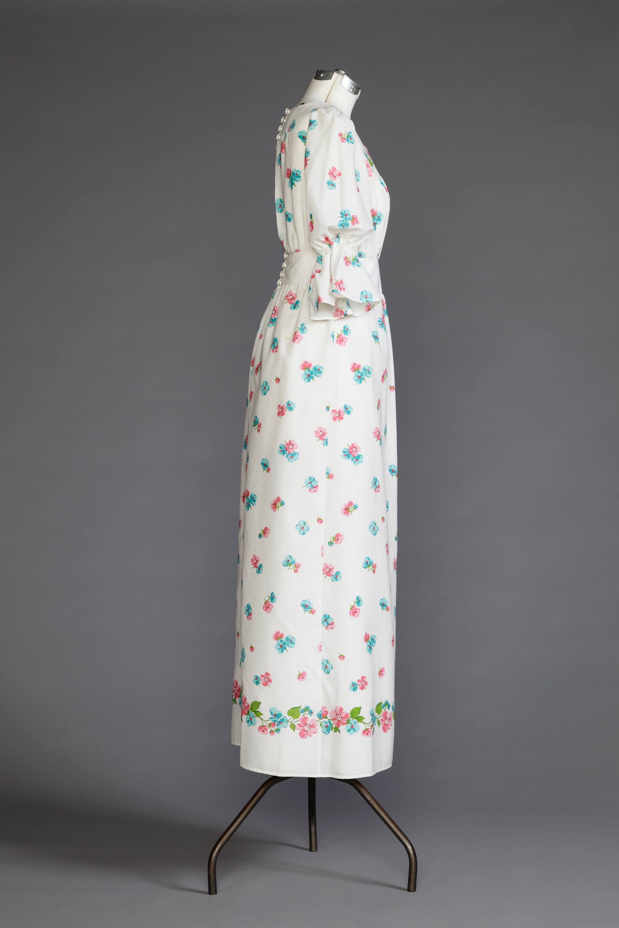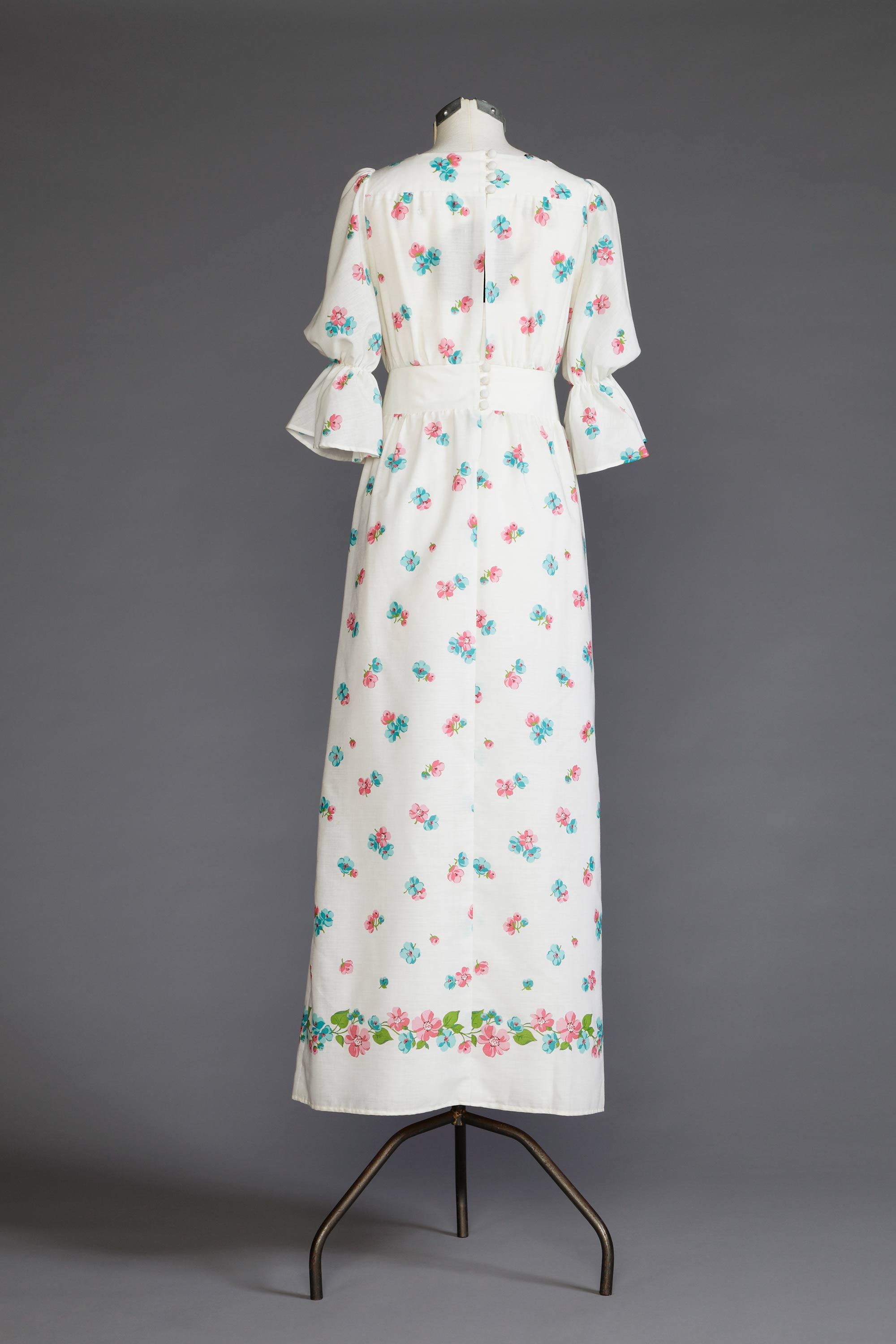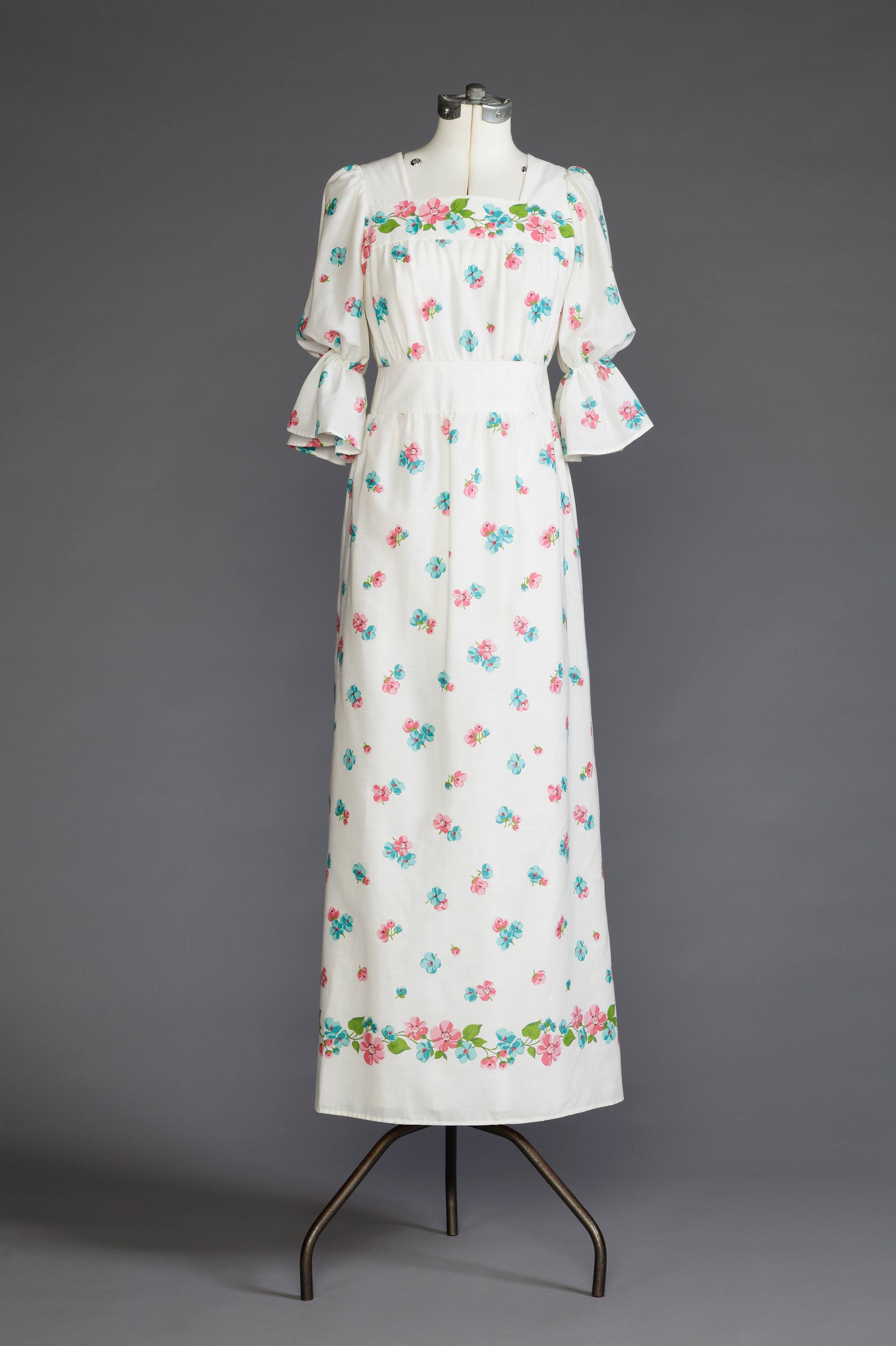 More often than not, wedding dresses allude fantasy rather than fashion. However, Linda Evans’ bohemian style wedding dress was very fashionable and of its time in 1973. The floral patterned lawn, deep ruffle cuffs, empire silhouette and square neckline could have been worn for any occasion throughout this era. It was not only sewing but also fashion which came naturally to Linda, who opened her own boutique in Avondale in 1973. The store was called Country Road Craft and sold embroidered clothing along with handmade pottery, tooled leather bags, and wooden toys. Linda and her husband set up stores throughout their life together, later moving into furnishings. Today, Linda continues to create beautiful and sophisticated appliquéd garments. Read more about the history of home sewing in the New Zealand Fashion Museum publication Home Sewn.