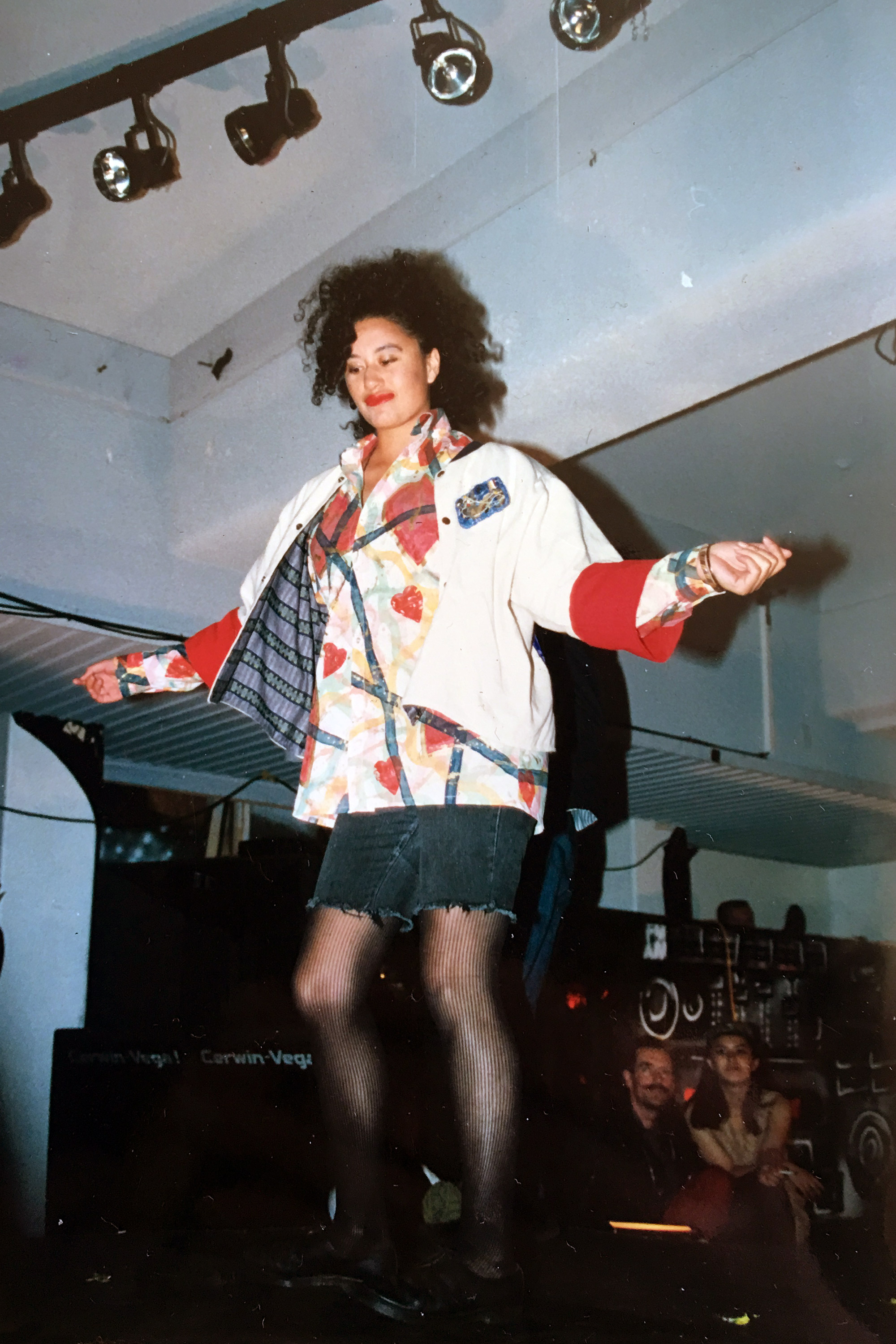 Sonja Hammer models an A. Ray outfit at The Box nightclub in the 1990s. Designed by Raewyn Alexander, the jacket is a boxy shape with drop sleeves, and a different coloured sleeve lining that showed when the cuffs were rolled back. The hand-painted shirt is a classic, loose-fitting 1980s-1990s style with one button cuffs. Sonja is also wearing what has become a Lyrical Brooch, made with a base of discarded electrical circuitry and then embroidered with beads and some discarded items, tulle-edged with gold thread. A secret pocket in the back holds a poem written on paper, folded to fit.