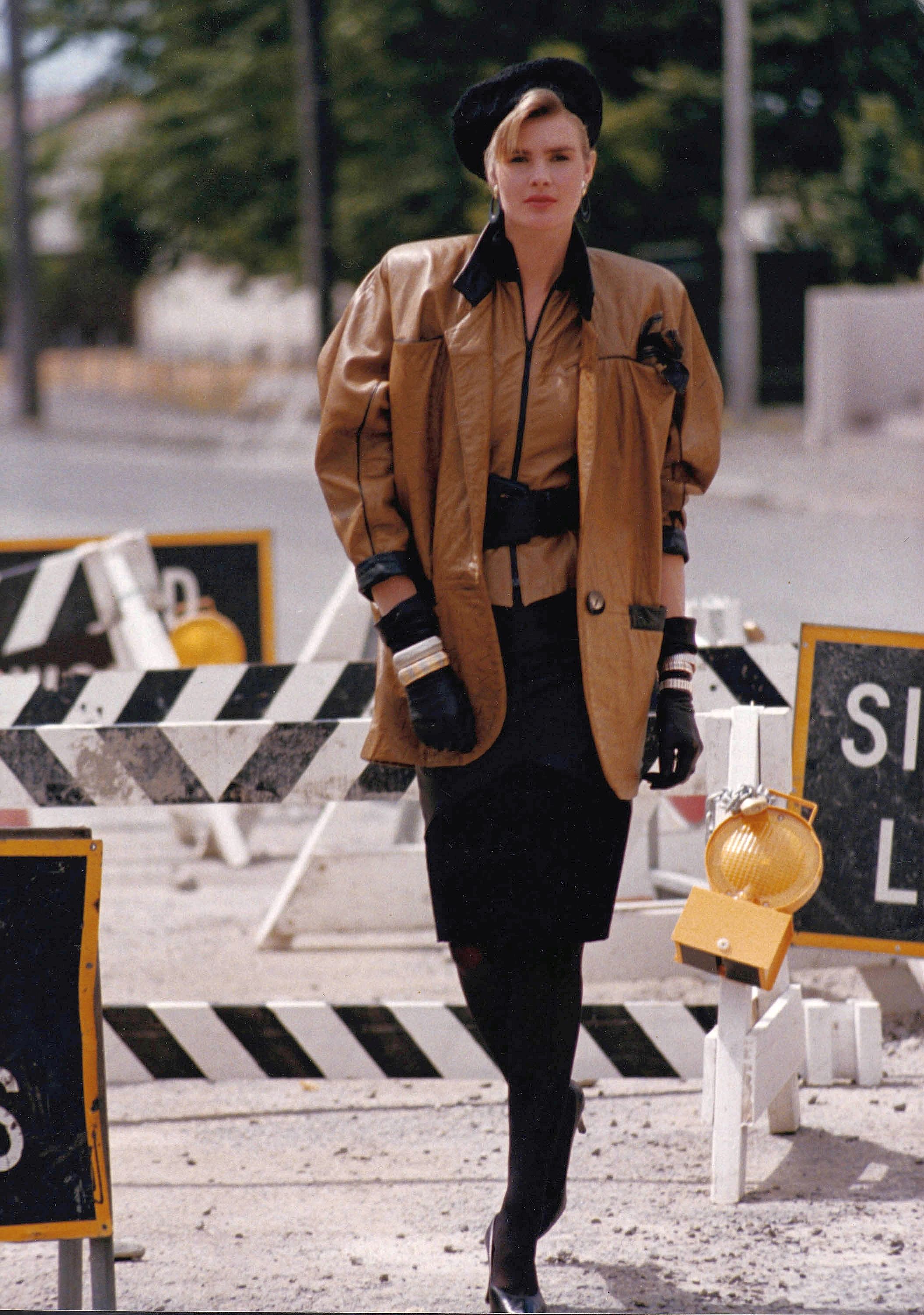 This leather ensemble was designed by Brigid Brock for the winter 1987 season. In early 1987, Brigid relocated from Christchurch to Melbourne. As the Christchurch-based Marcol Manufacturing was still making the bulk of her range, she commuted back and forth between the two cities for the next four years.