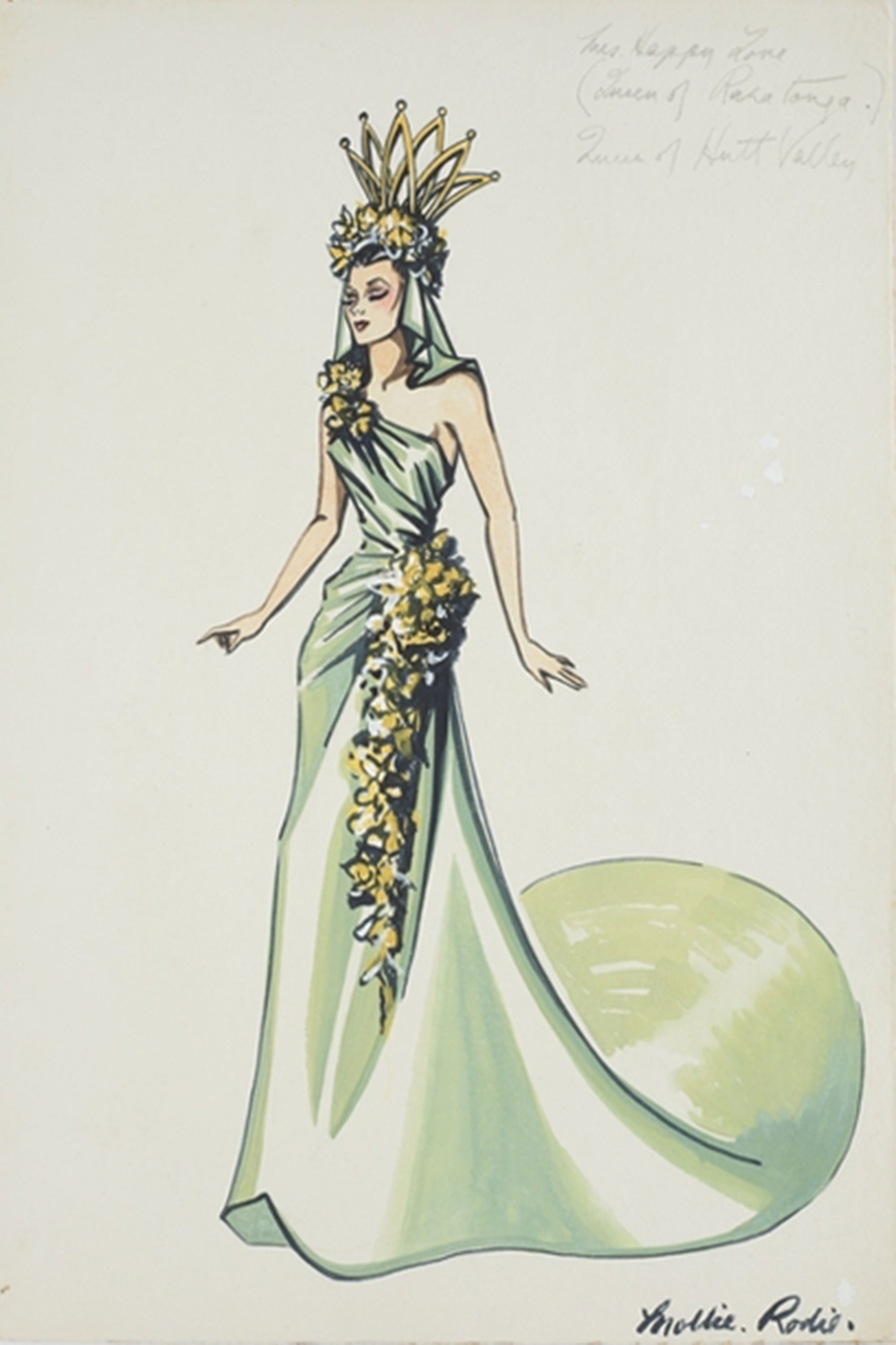 Mollie Rodie designed the costume for the Queen of Hutt Valley, Mrs E T W Rio Love, for the Victory Queen Carnival in 1941.