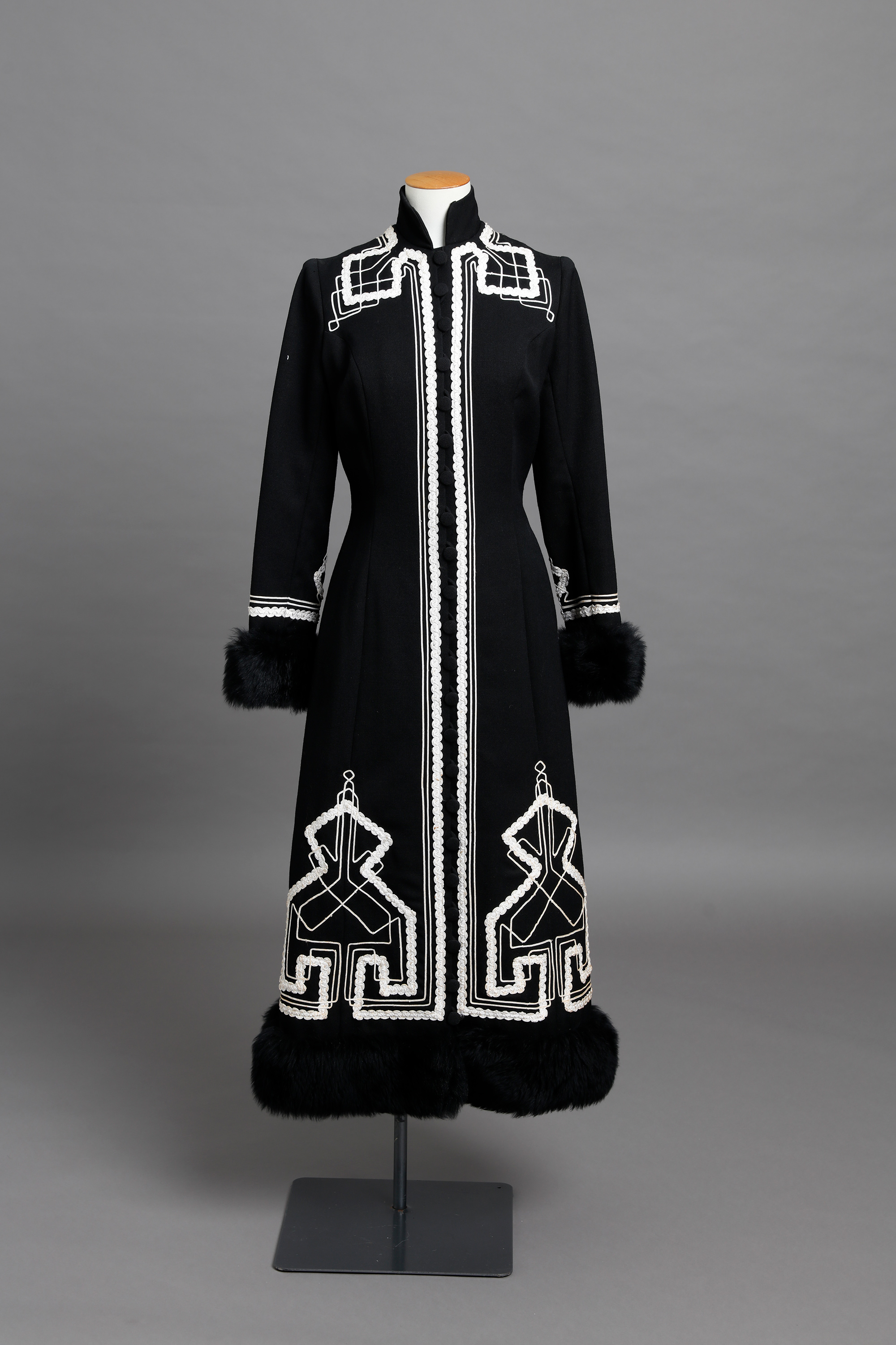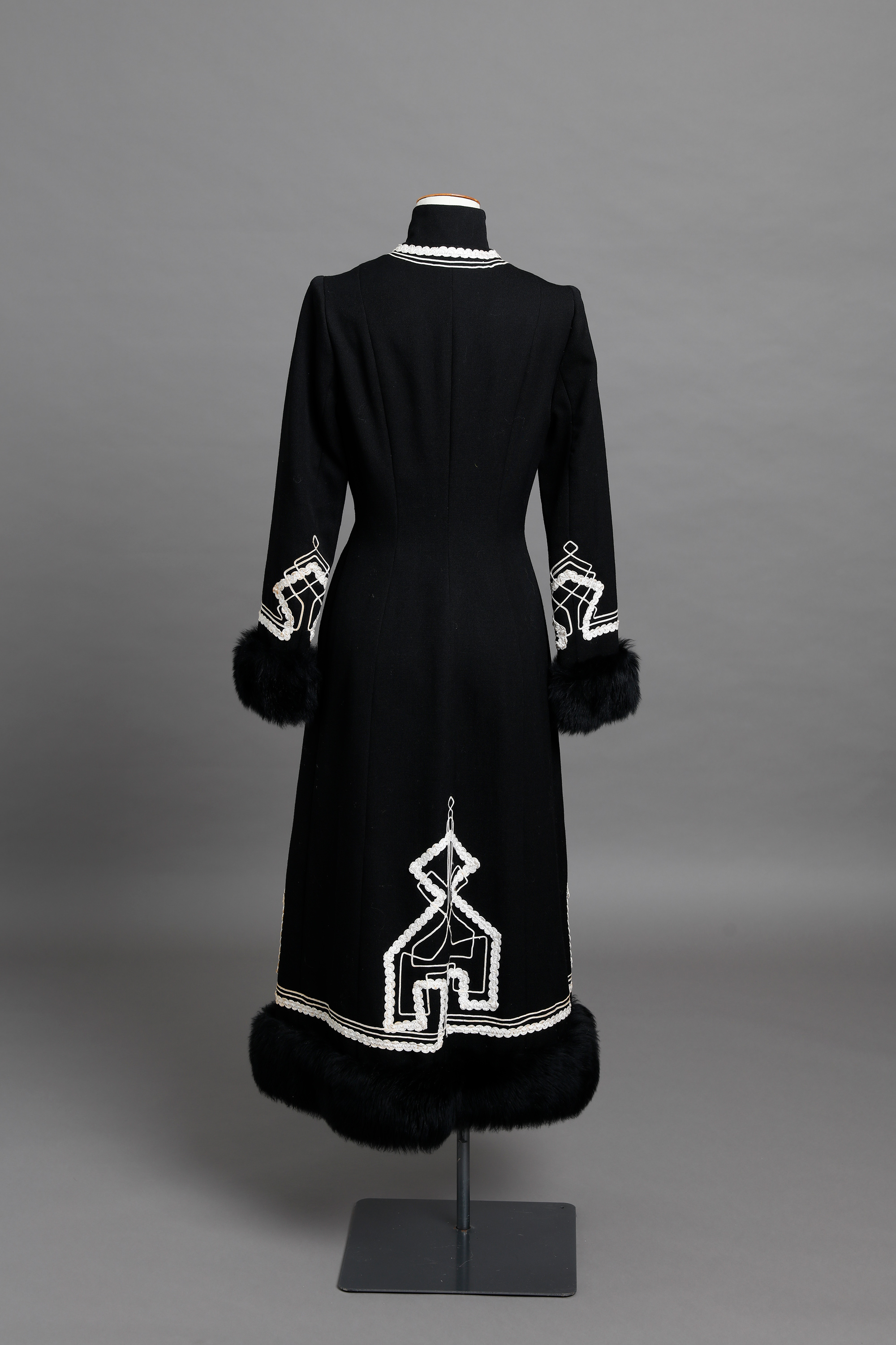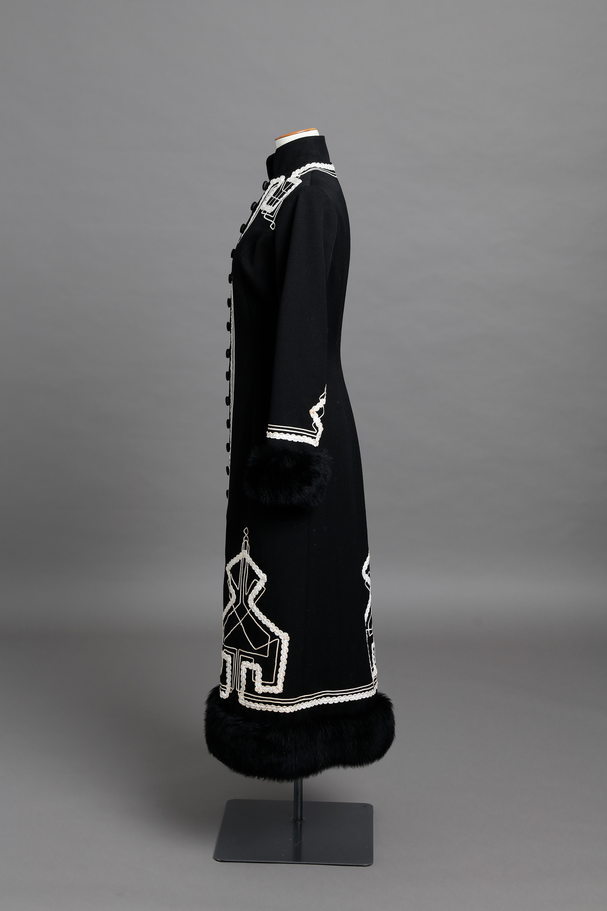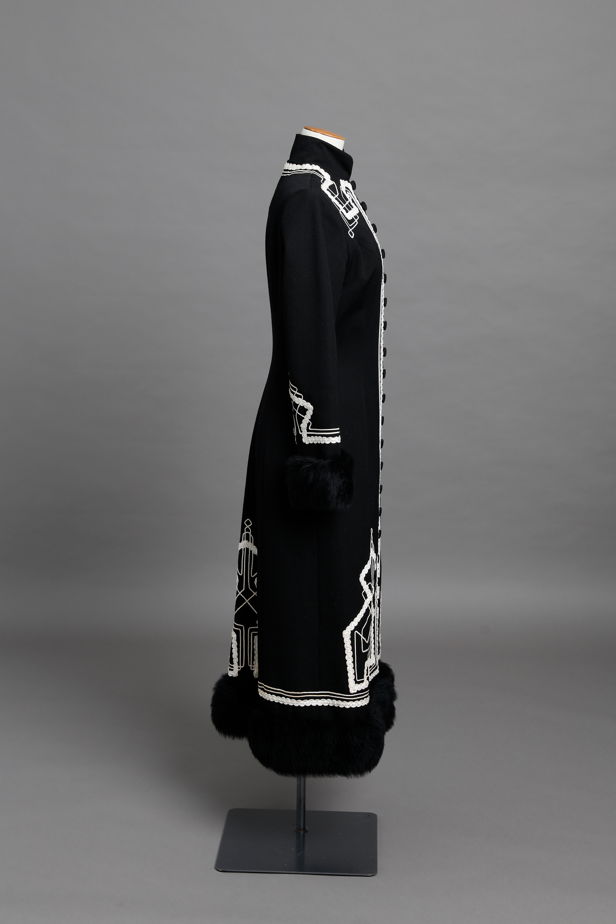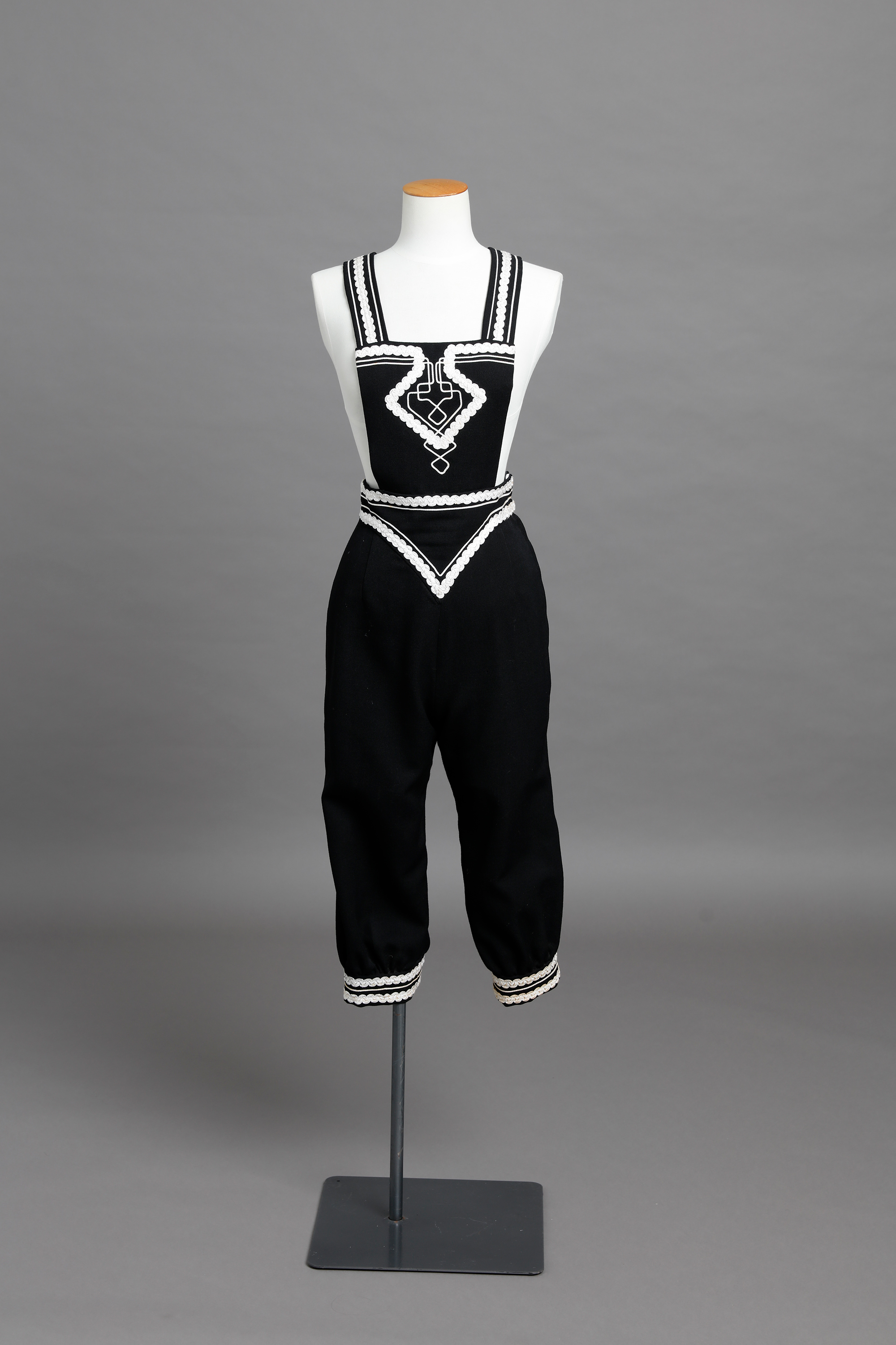 The coat and knickerbockers feature white braid work and lambs wool trim at the cuffs.
