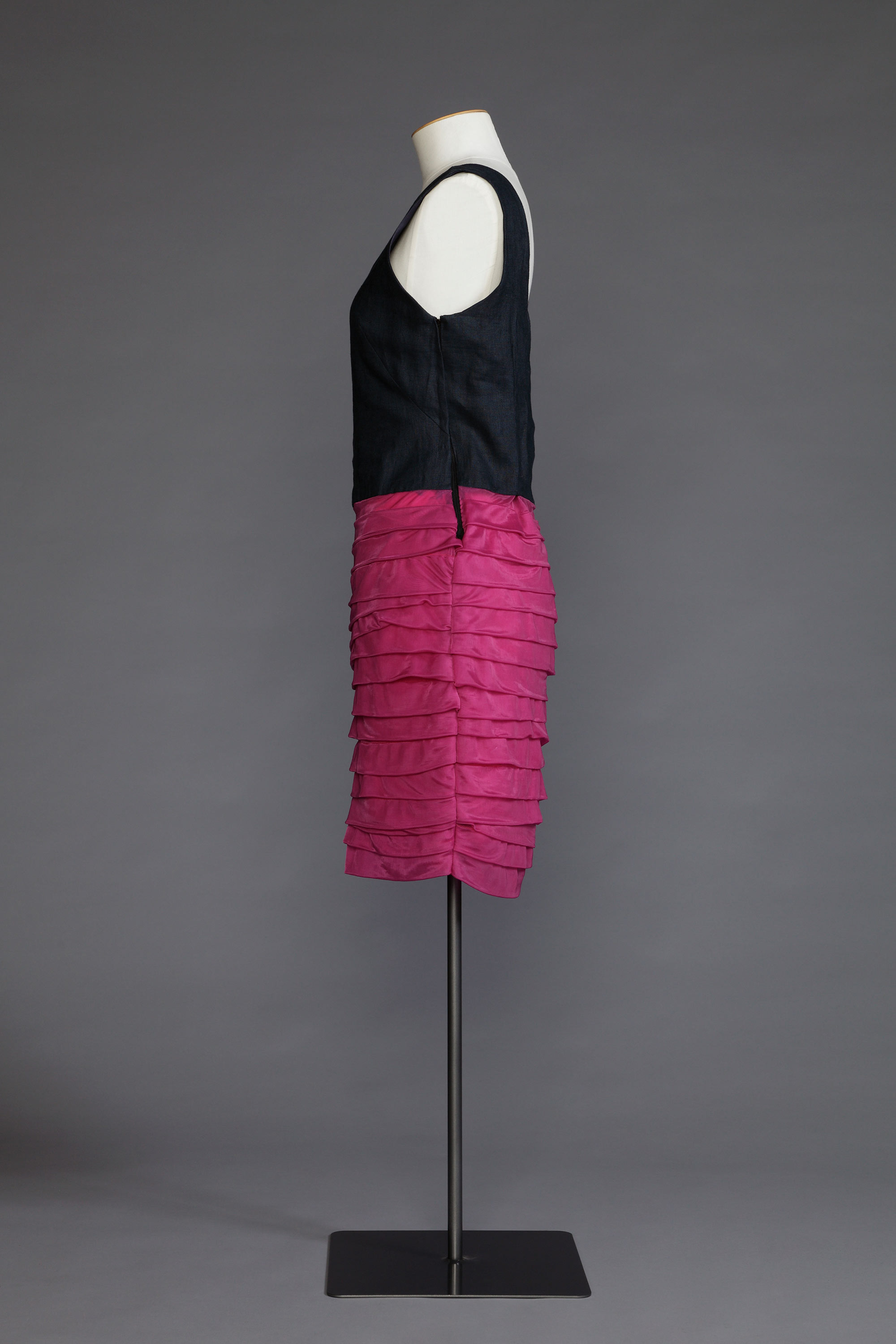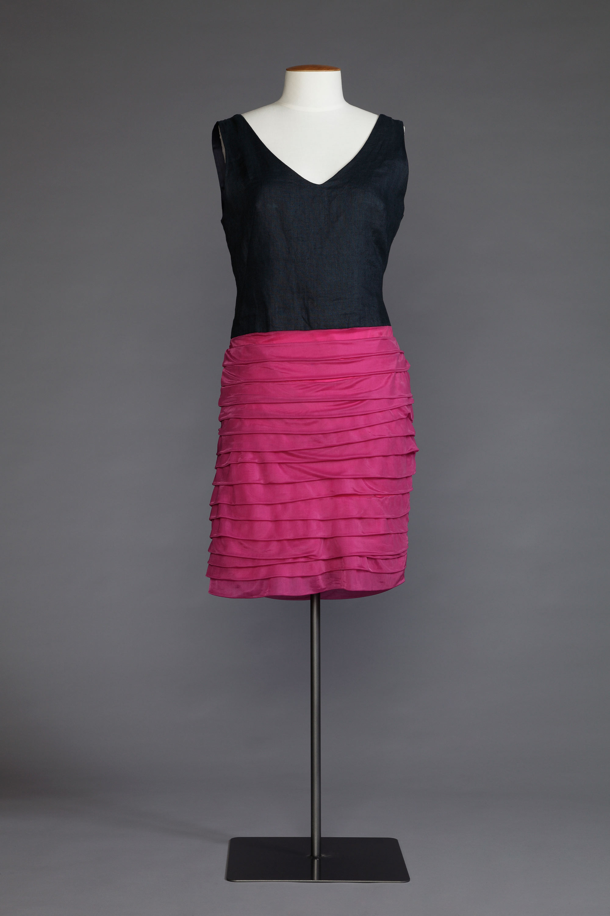 The daughter and great- granddaughter of sewers, Amber Smith recalls her first project was creating a pair of harlequin shorts for her school swimming sports at age 11. Reflecting on this project, Amber remembers, "I think it took about four goes to get the leg/crotch seam right. But I persevered and felt pretty fancy on the day." Unpicking, it seems, is a downside of experimentation. The construction of this dress was also labour intensive, with hours spent kneeling on the floor marking out and pinning the folds for the skirt. She remembers: "Eventually I gave up and used the width of the floorboards for the pleated layers." The dress is based on a vintage pattern (Vogue 6253) and inspired by the fabric of the overskirt. Read more about the history of home sewing in the New Zealand Fashion Museum publication Home Sewn.