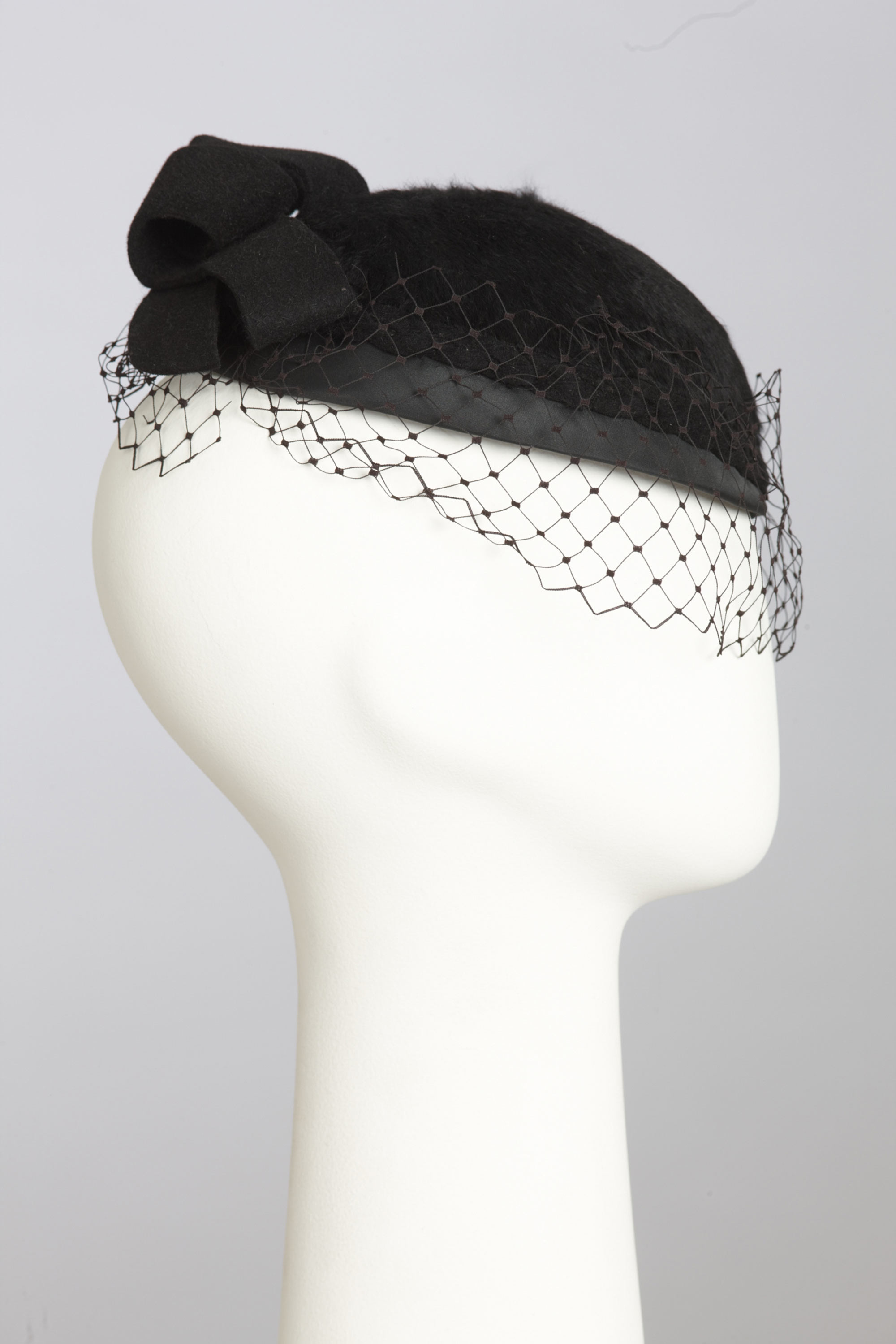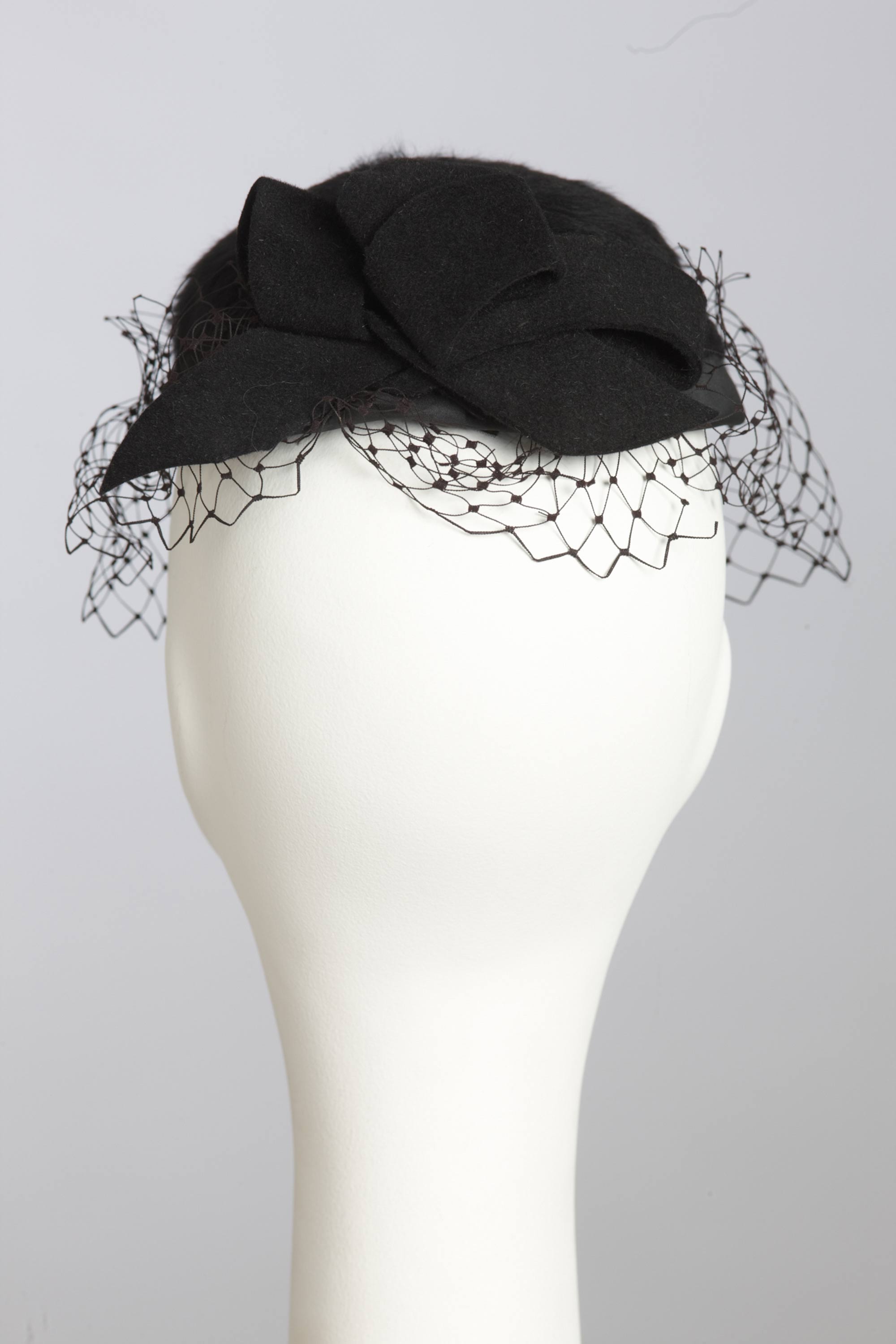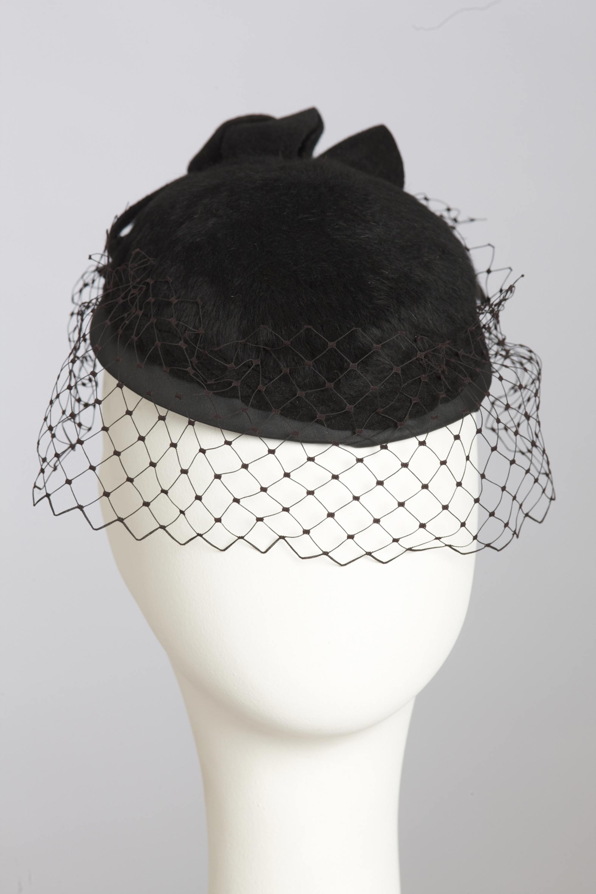 As a young girl Norma Ingram worked in a haberdashery store in Motueka, which sold hats, and here she learnt millinery. Years later as the wife of Sir Keith Holyoake (Prime Minister and Governor-General of New Zealand), Norma had an extensive collection of hats. Many of her hats were designed and crafted by Agnes Barrie (mother of broadcaster Maggie Barrie) who had a small workshop in Wellington. Cocktail hats were generally worn perched forward on the head, often tilted over one eye and generally had a small veil, like this hat of Dame Norma Janet Holyoake. Read more about wearing the colour black in the New Zealand Fashion Museum publication Black: The history of black in fashion, society and culture in New Zealand.