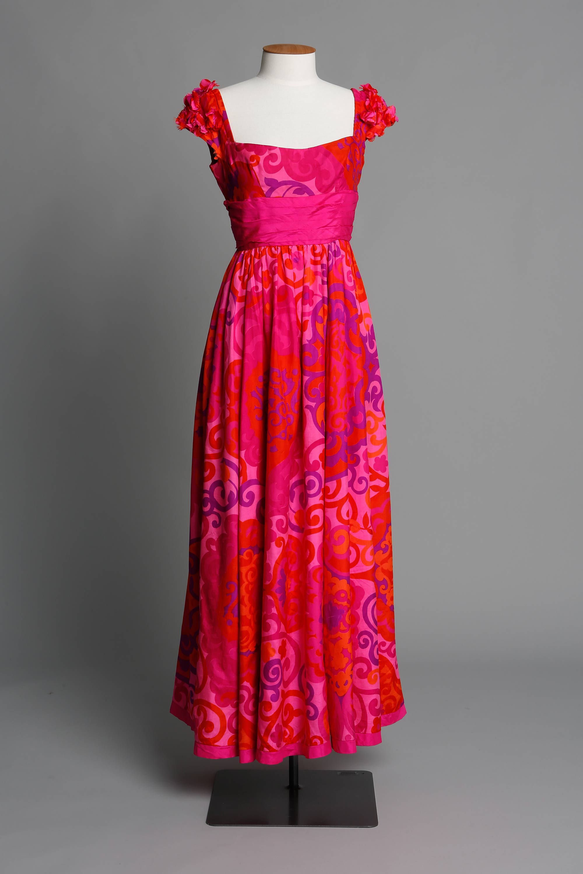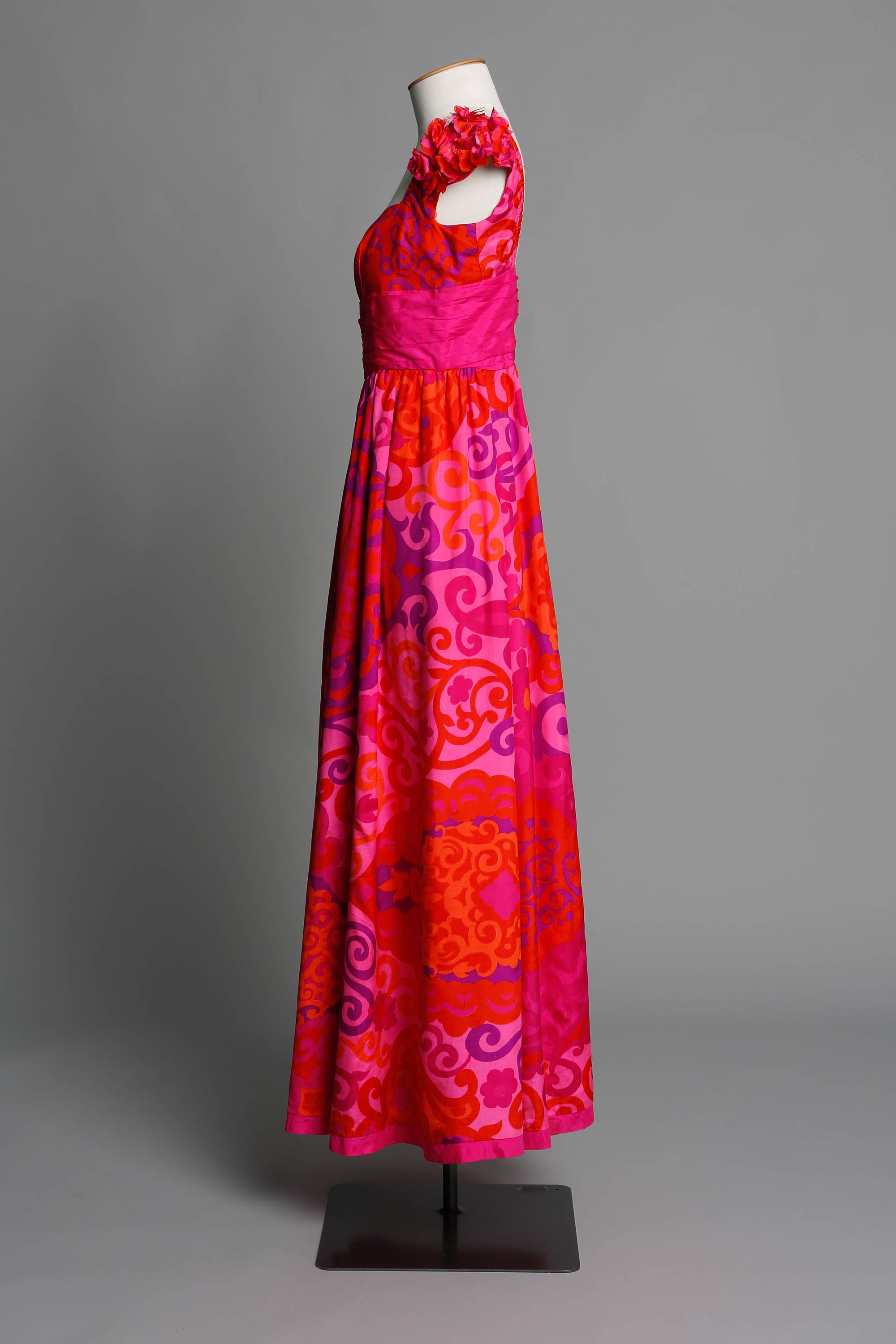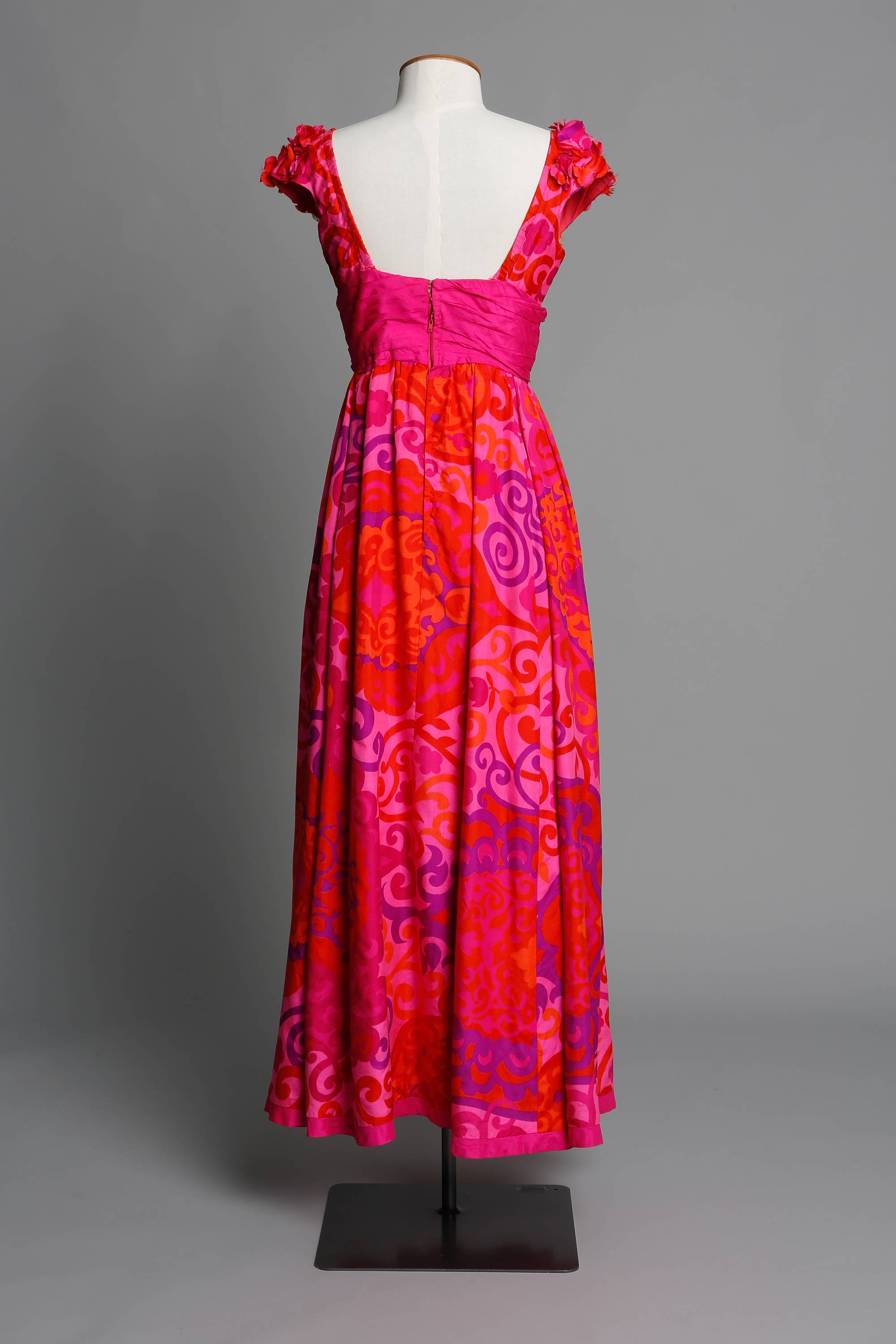 Colin Cole iridescent pink printed silk evening dress, 1969