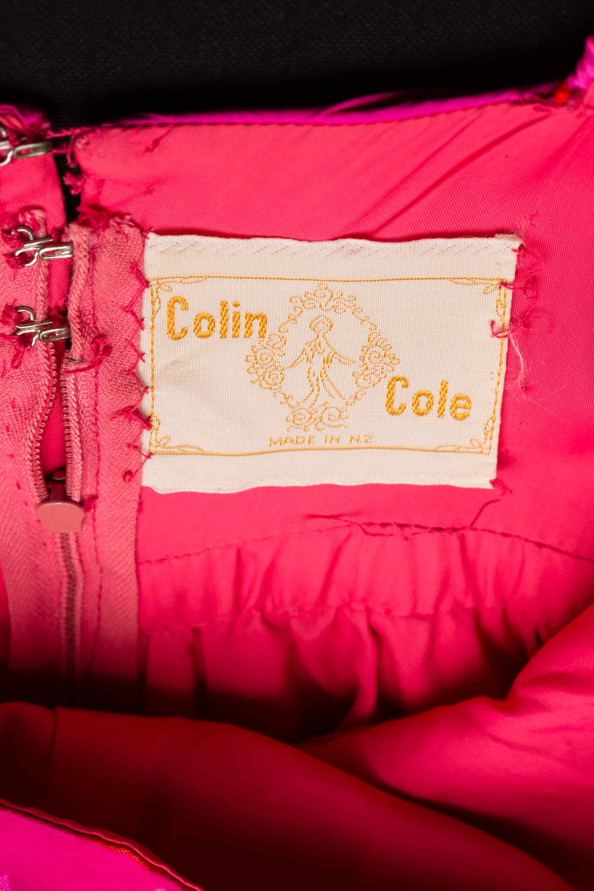 This dress was made in 1969 by Colin Cole for Lyndy for The Four Schools Ball – a ball for past pupils of Christ’s College, Wanganui Collegiate School, Woodford House and Nga Tawa Diocesan School. At this time, Colin extended his offering to include off-the-peg garments in response to the changing demographic. This garment has a conventional woven label, which he began to use instead of his signature hand sewn labels as production increased. Read more about 1970s fashion in the New Zealand Fashion Museum publication The Age of Aquarius: A 70s Revolution in Fashion.