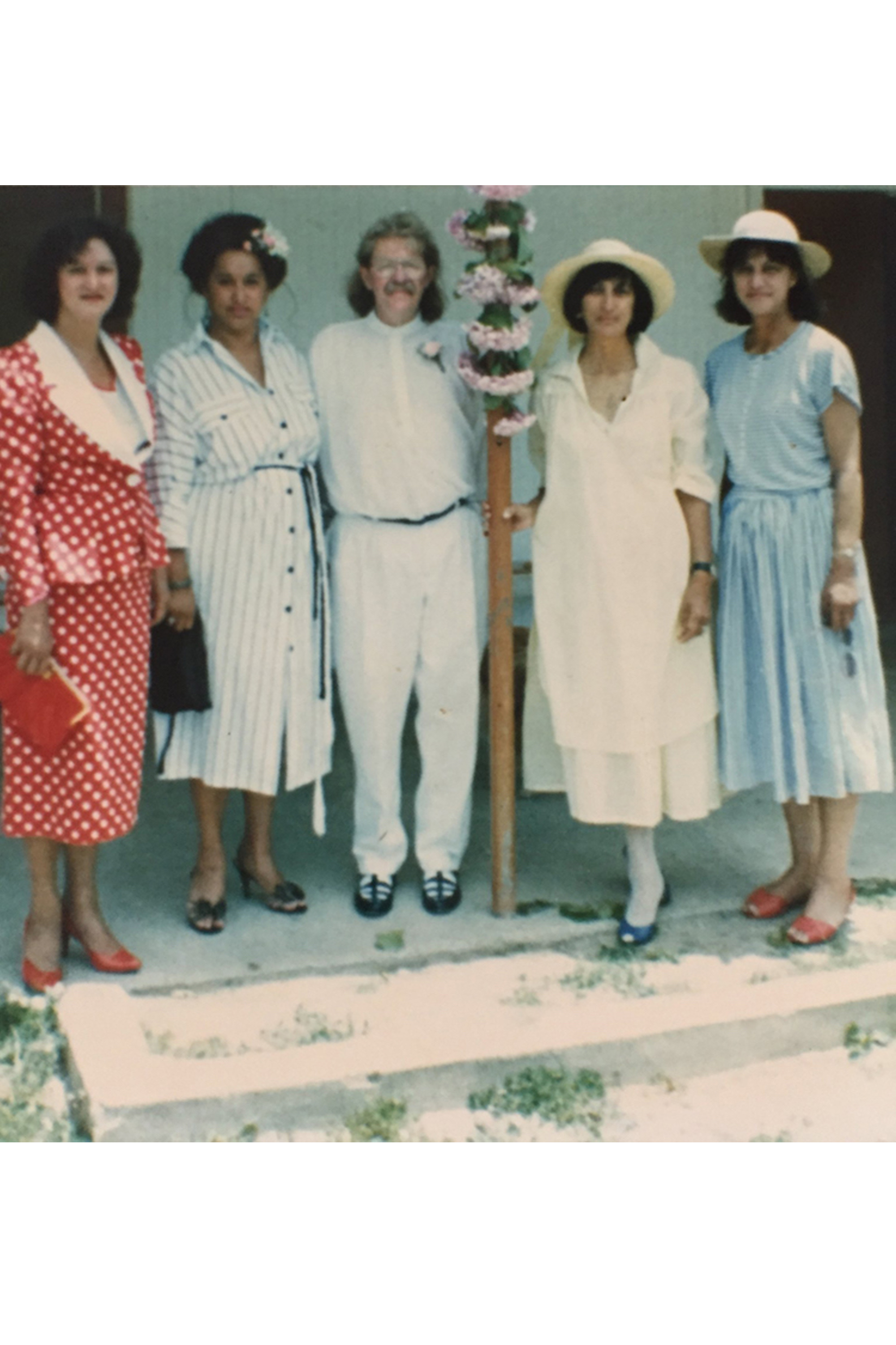 Binki Taua, Colin Cole's sister-in-law, had this iconic cherry red polka dot suit made by him for a wedding in the eighties. She wore it despite it being a three-piece suit on a hot summer day. The ensemble features a jacket with a statement contrast collar, the matching narrow pencil skirt, a white cotton sleeveless blouse with red bias binding, and a sash and belt that can be worn all together or switched out depending on how it was to be worn.