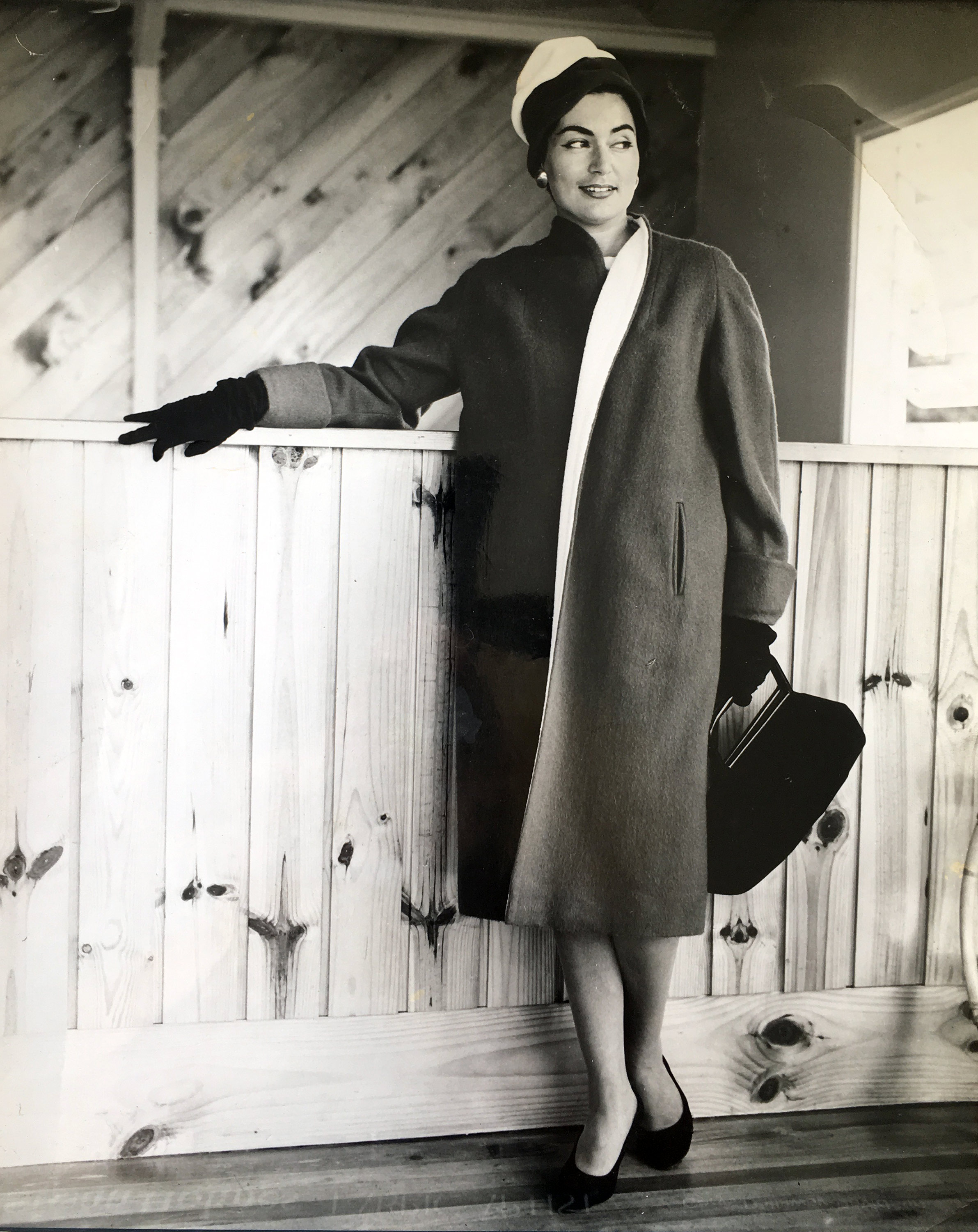 This photo of Else van den Muysenbergh modelling a coat and hat appeared in the Auckland Star in March 1959. The caption read: "Such a lot of talk about colour comes into this autumn's fashion story. Above is a bright coral woollen weave used for an easy coat with a superbly graceful line. It is lined with snowy white cotton-suede in a waffle pattern, and the high white felt hat keeps in tune with its coral brim."