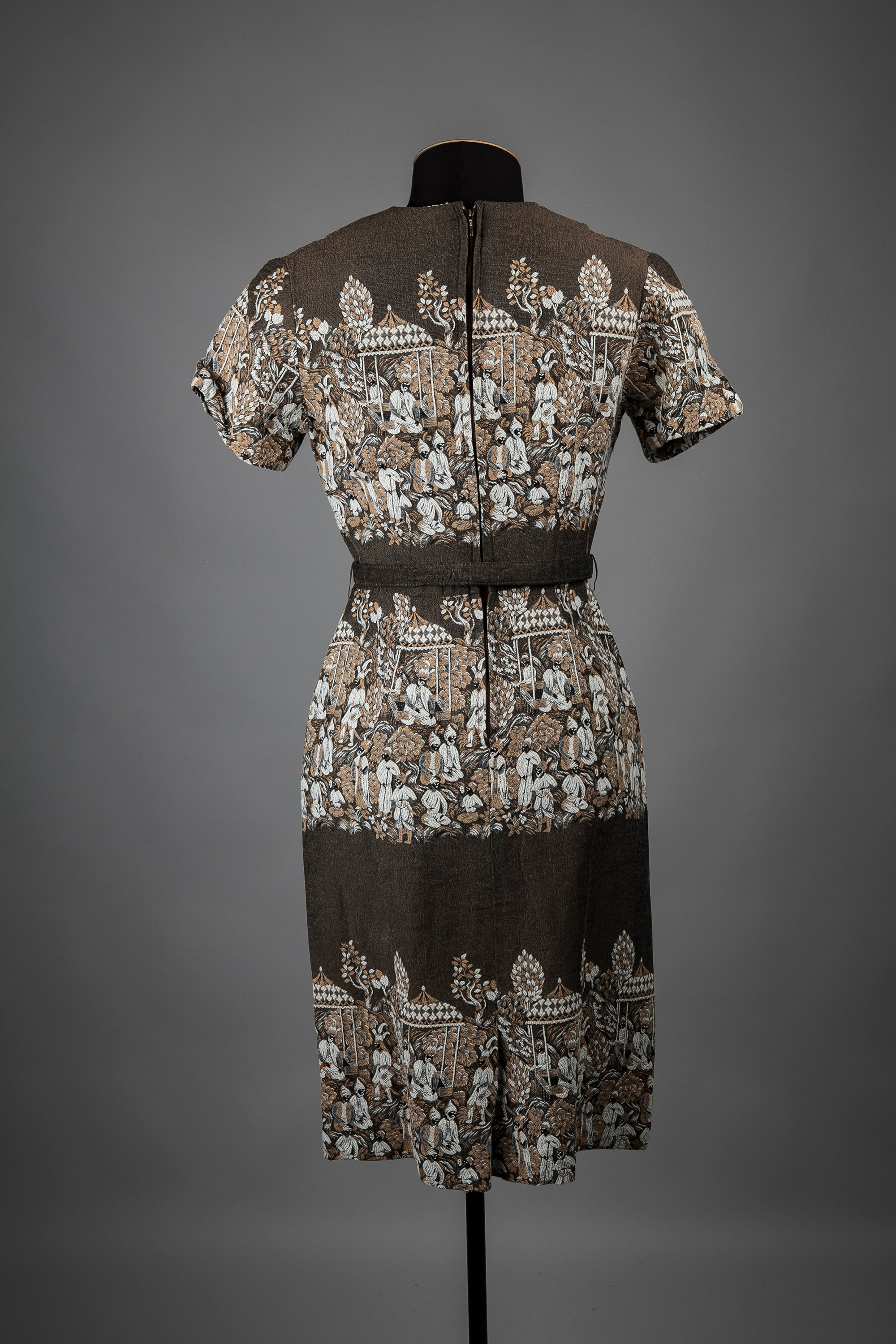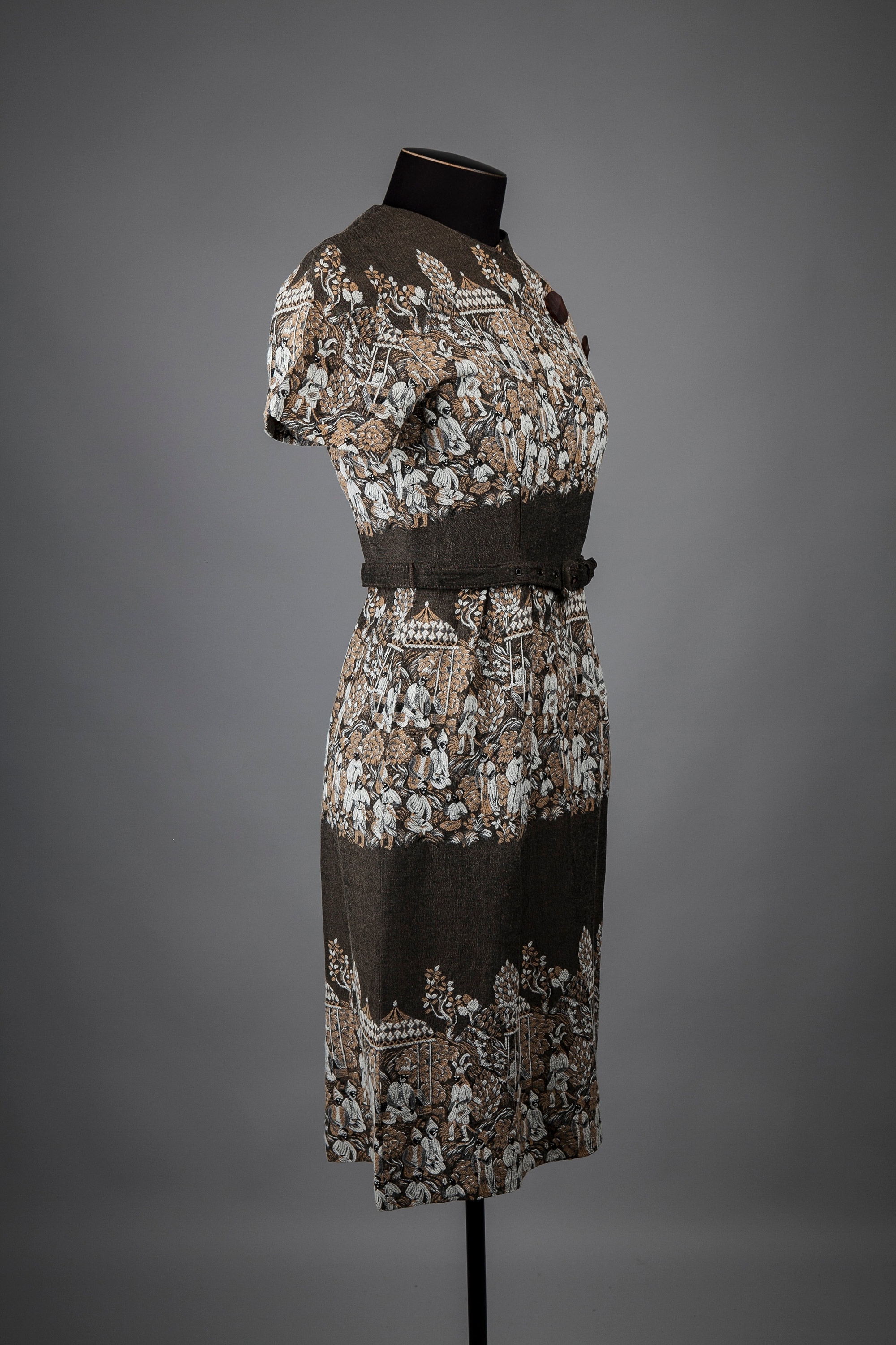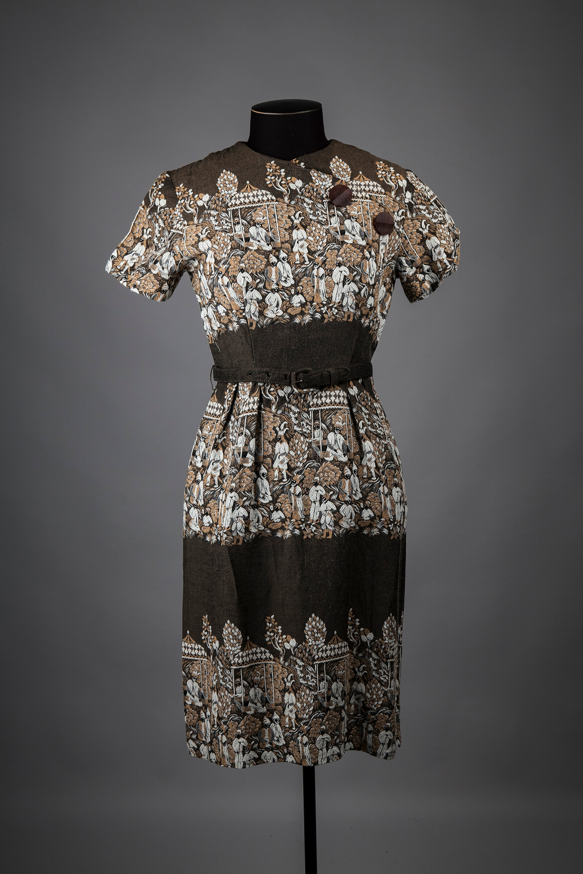 This heavy cotton dress features a repeated border pattern of a market scene. It has a high cross-over bodice line, short sleeves, and an un-pressed pleated skirt with a kick pleat. The dress is accessed through a back zip, and has a self- belt and keepers. Two large brown textured buttons adorn the bodice line.