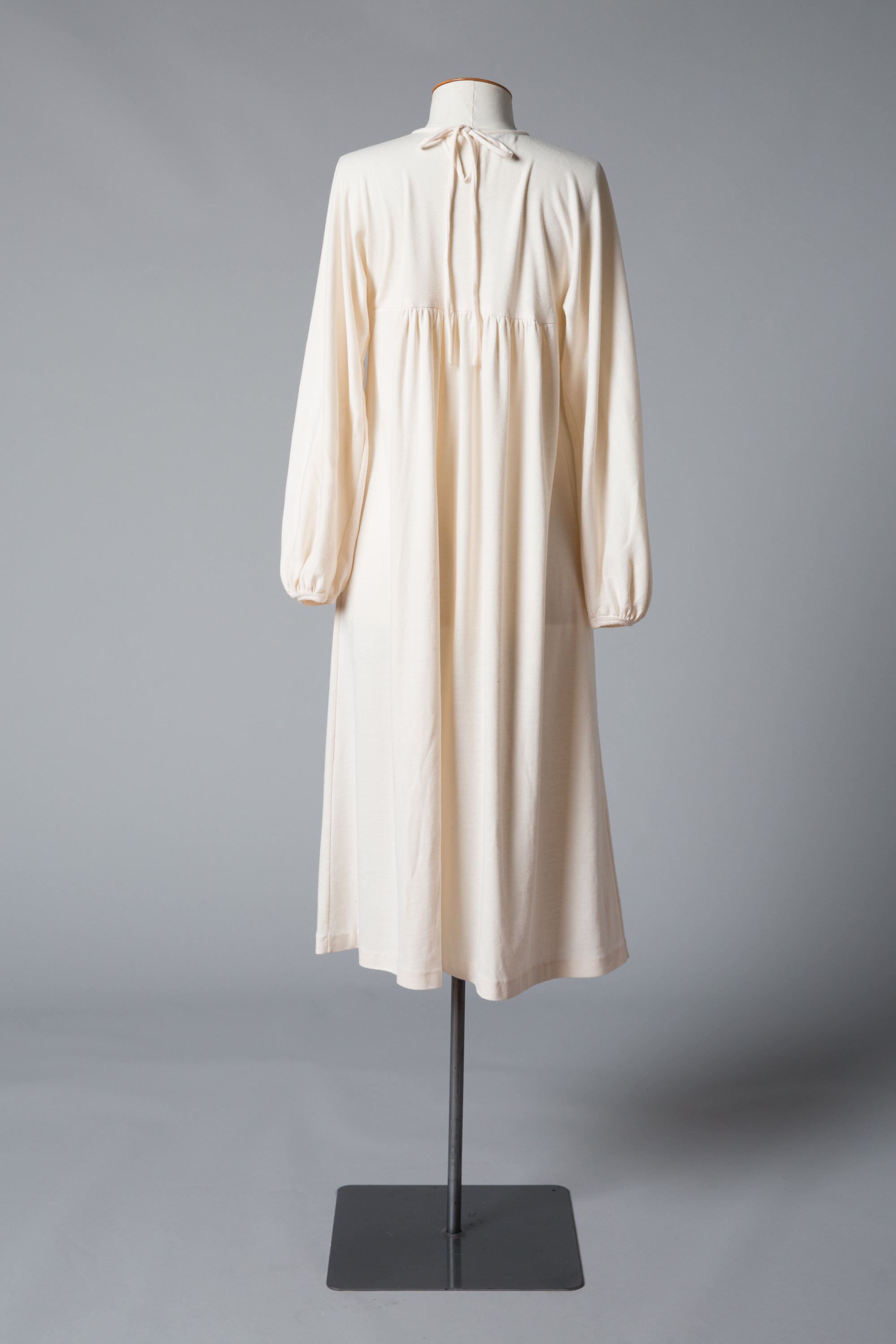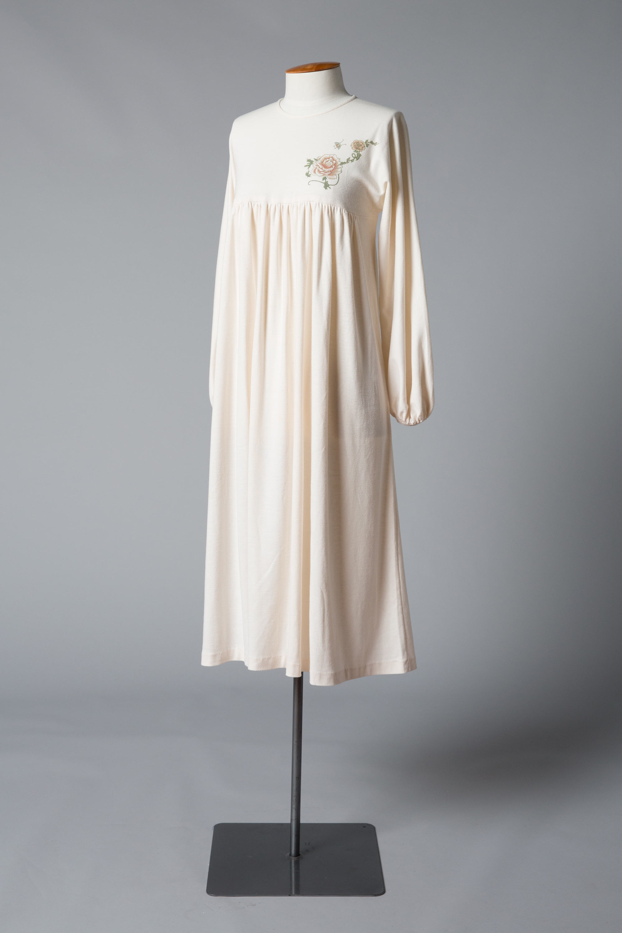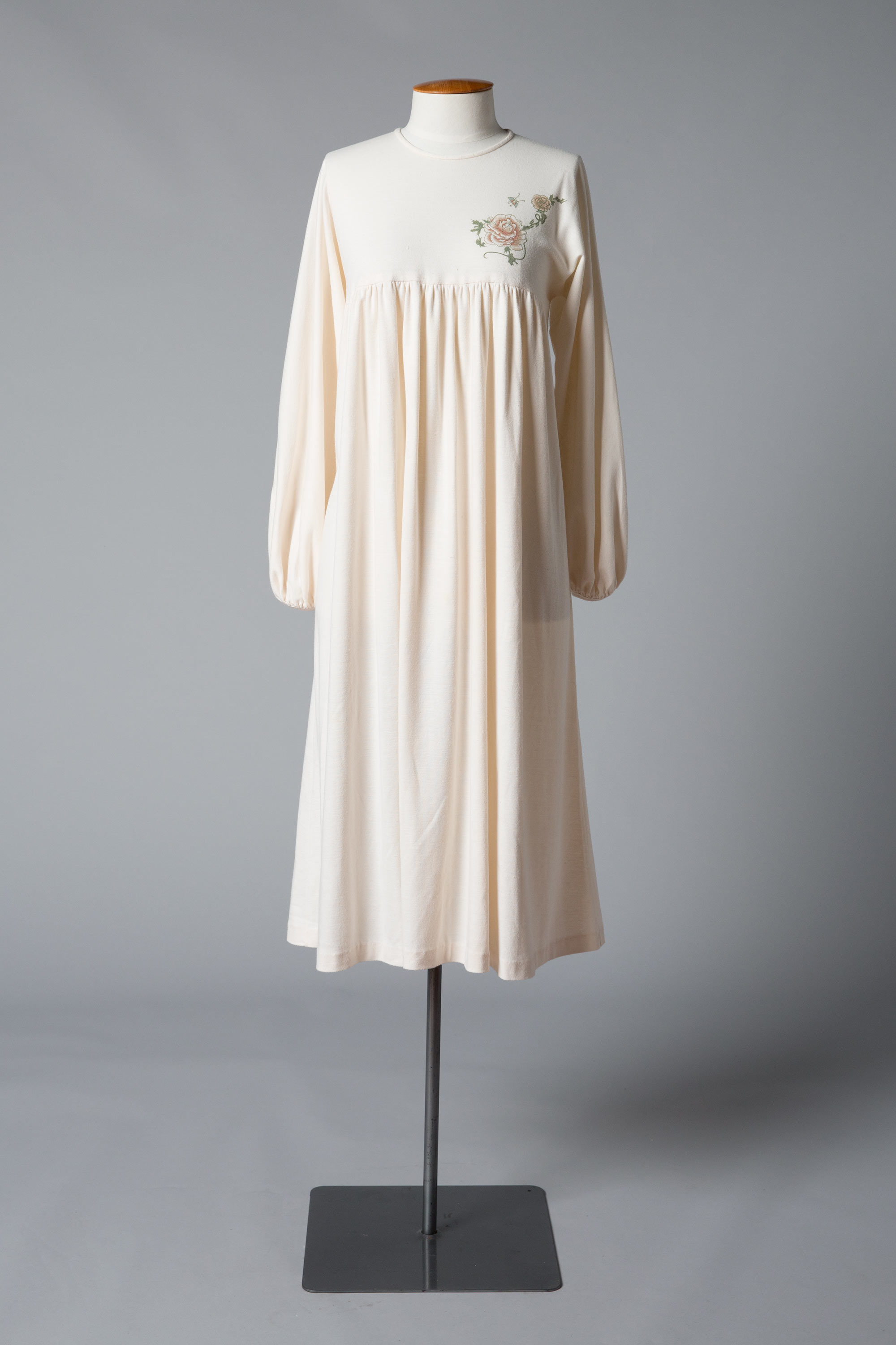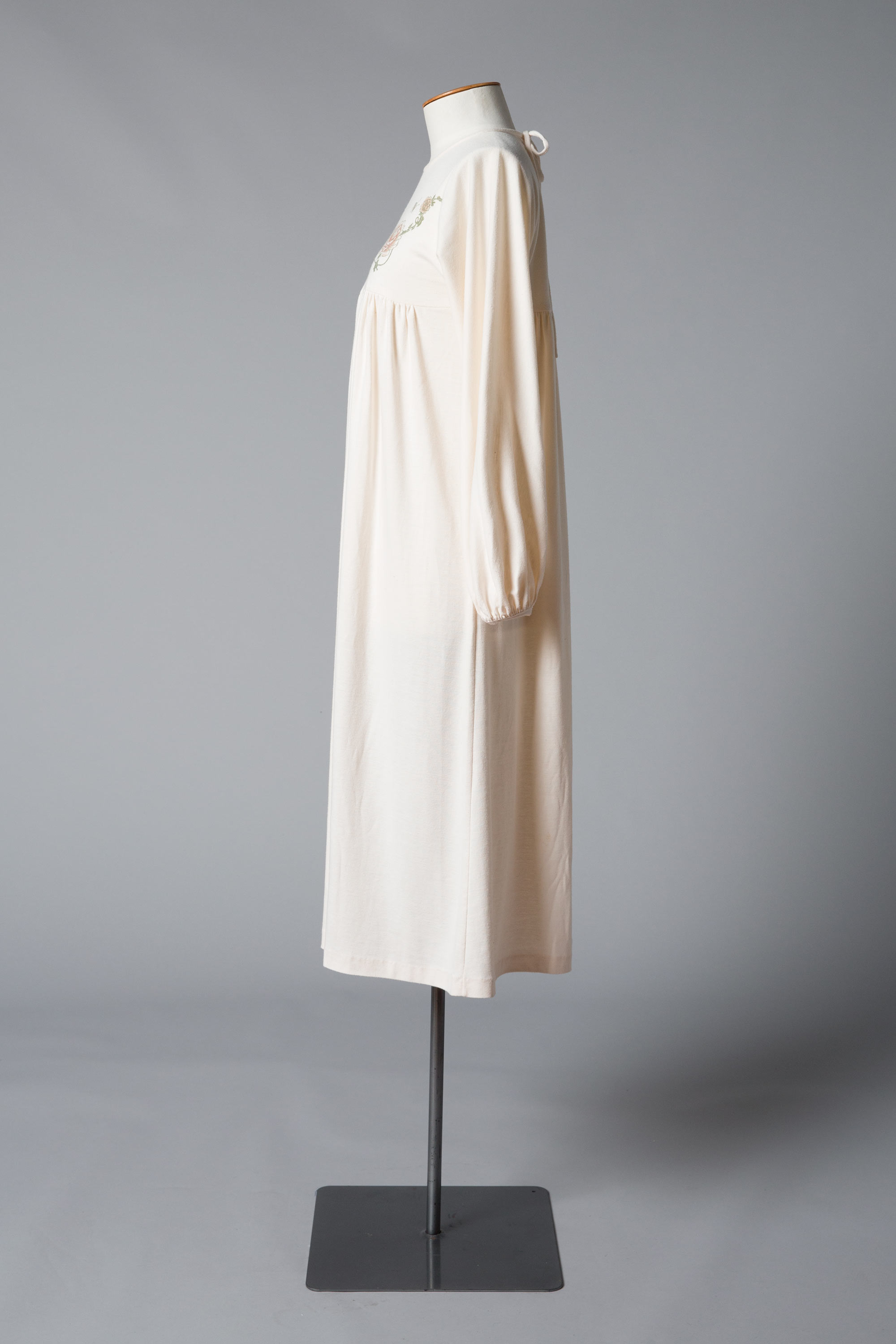 The yoke and sleeves of this dress are cut in one piece without shoulder seams. It is finished with narrow bands and a printed flower motif.