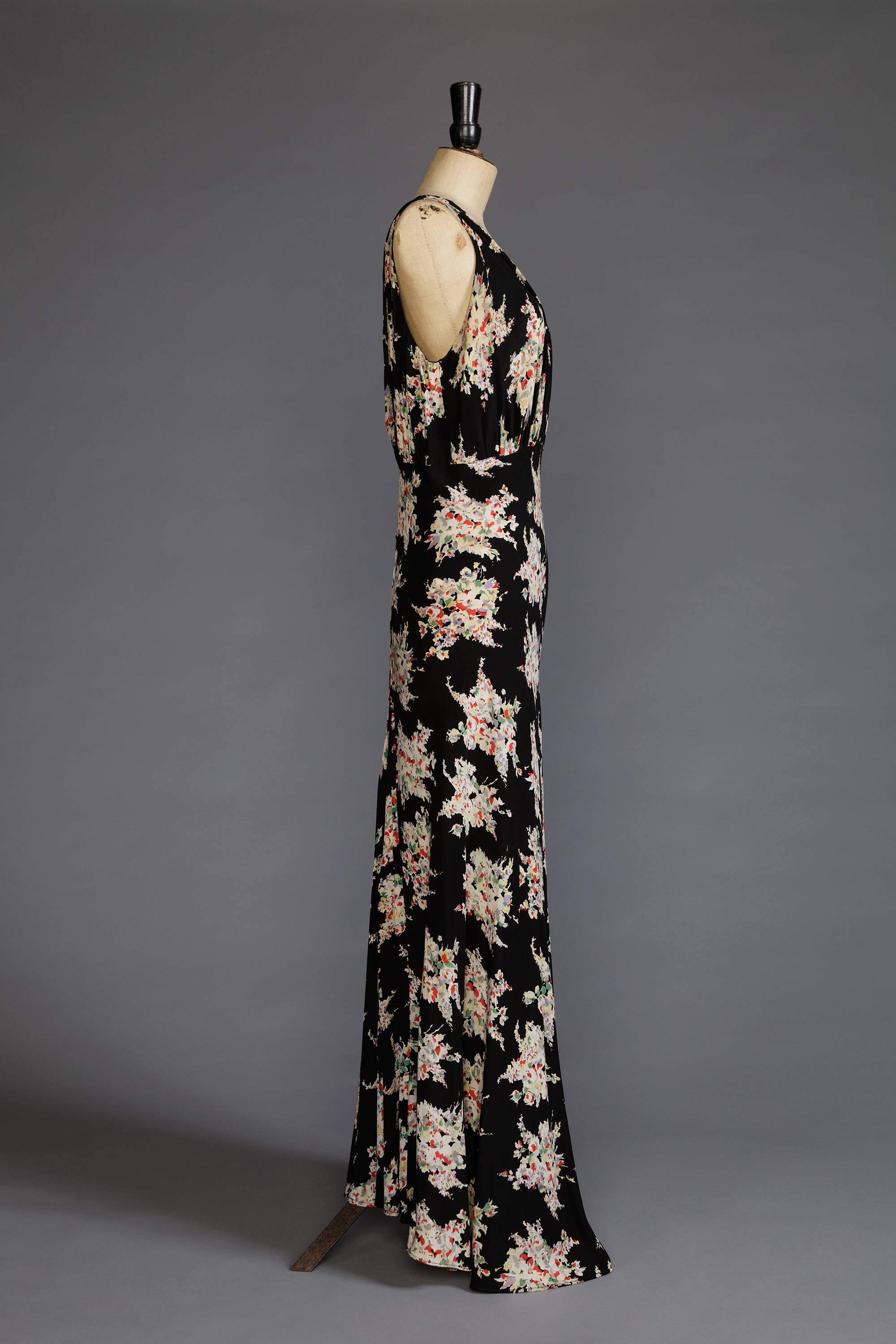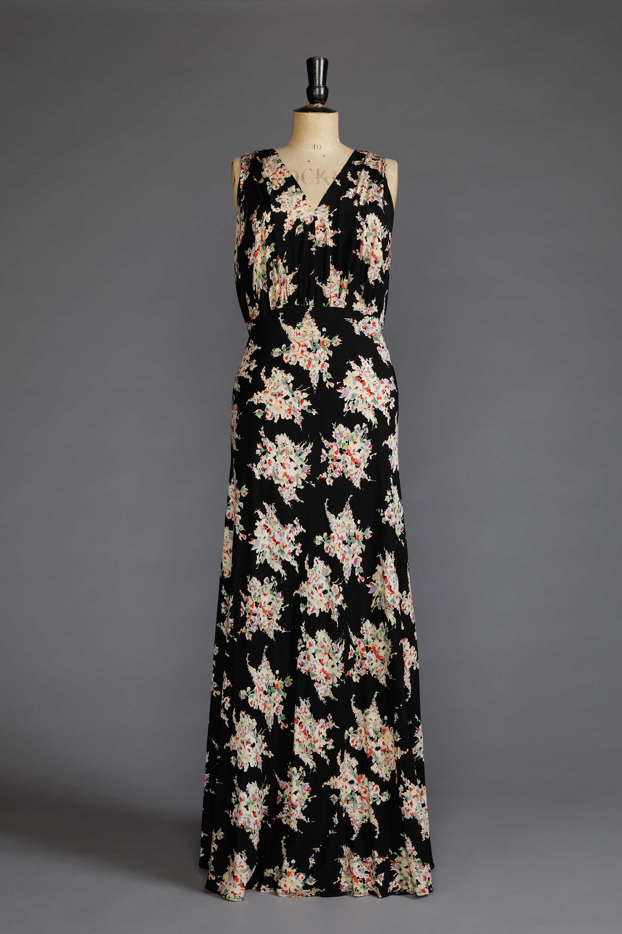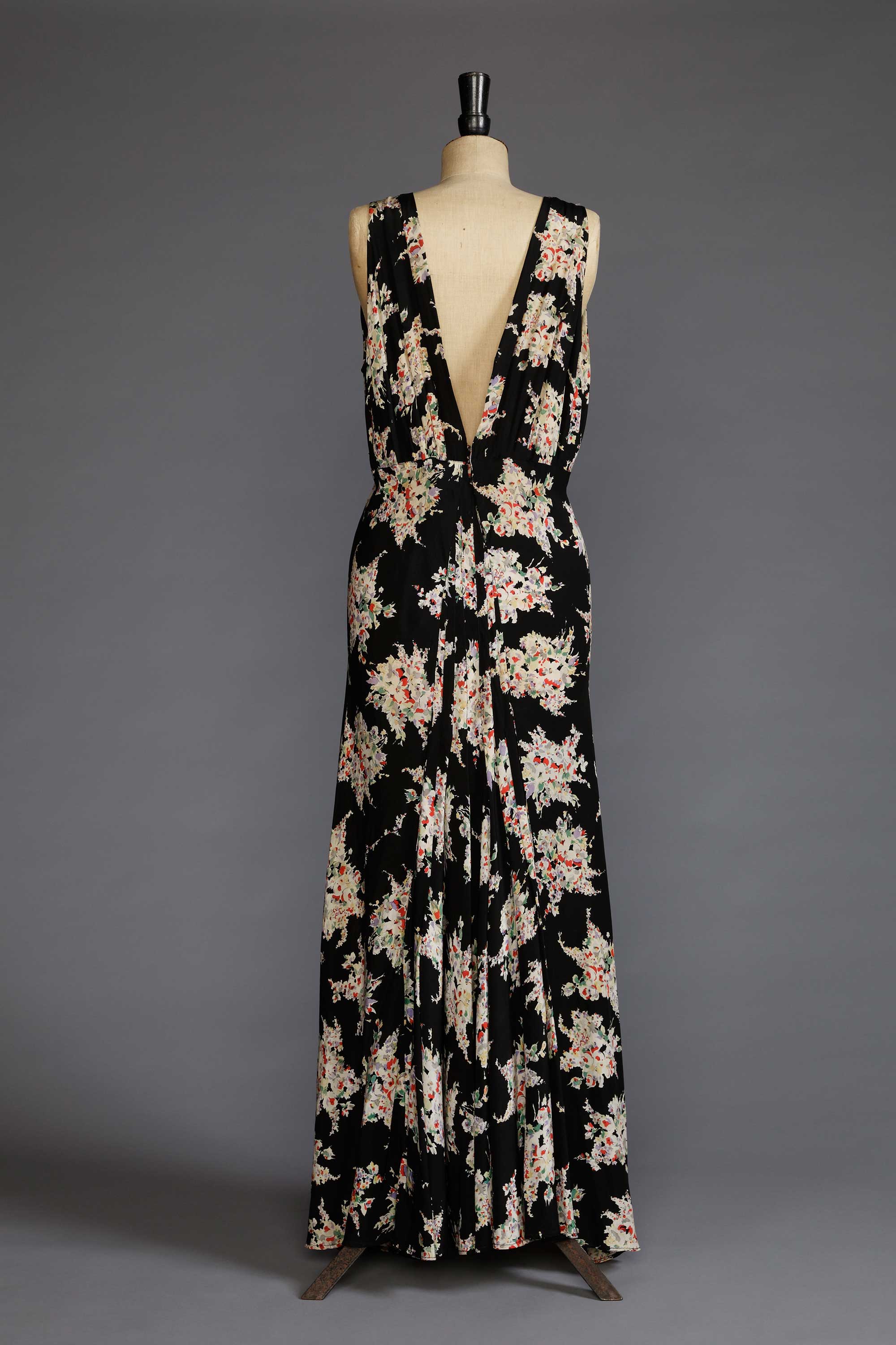 The bodice of this home sewn dress has been cut to make use of the selvedge edge at the front and back V to keep the neckline stable and fitting, while shoulder pleats and the bias effect precludes the need for bust darts. The skirt, which measures an amazing 350 cm [138 inches] at the hem, is cut in two expansive bias panels which have had to be seamed because the fabric was only 115 cm [45 inches] wide. The back pleating detail creates a flattering fit and a fishtail, the effect of which has been somewhat lost after the dress was shortened. The dress is closed with domes as it predates the use of zips in fashion garments which were not used until the 1940s. Read more about the history of home sewing in the New Zealand Fashion Museum publication Home Sewn.