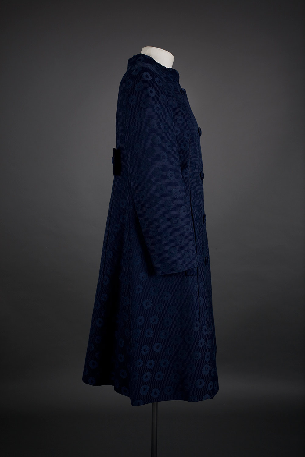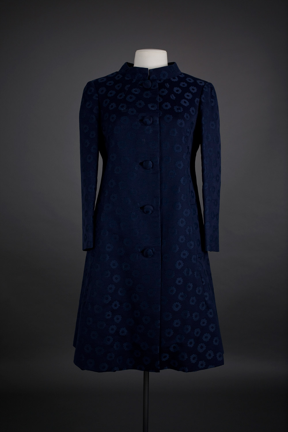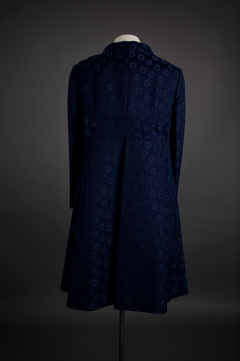 The coat features hand-finished jetted buttonholes and self covered buttons