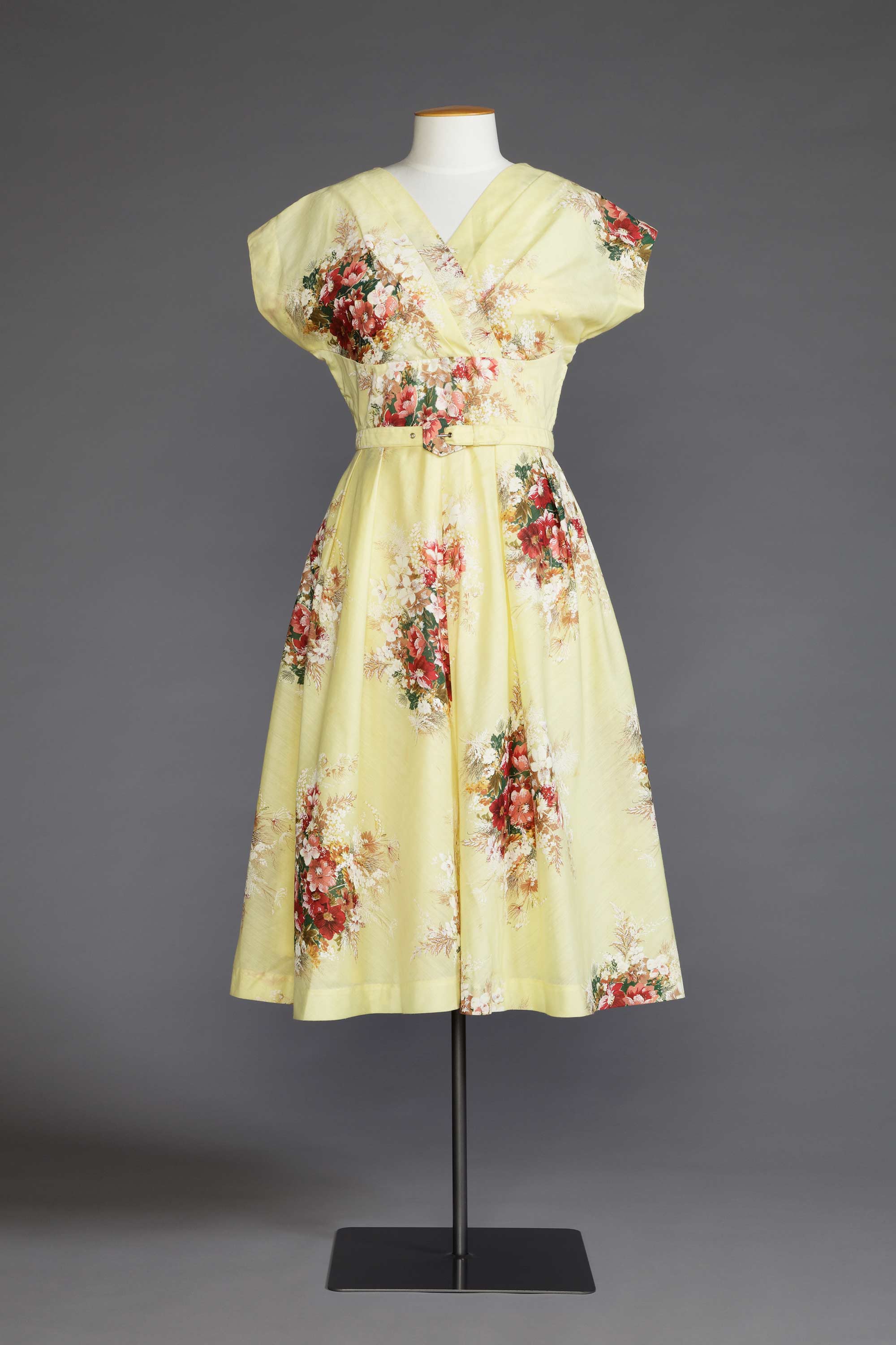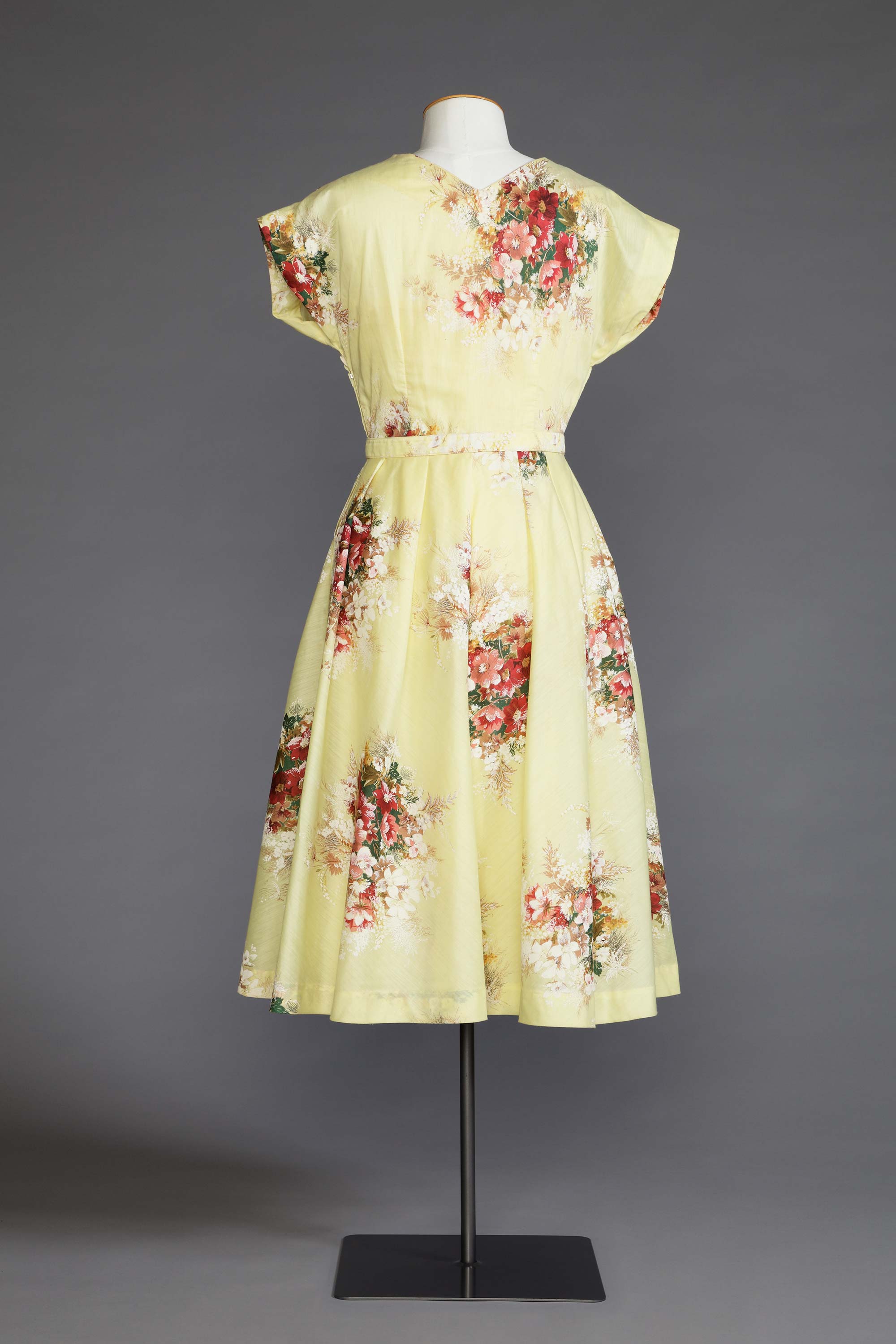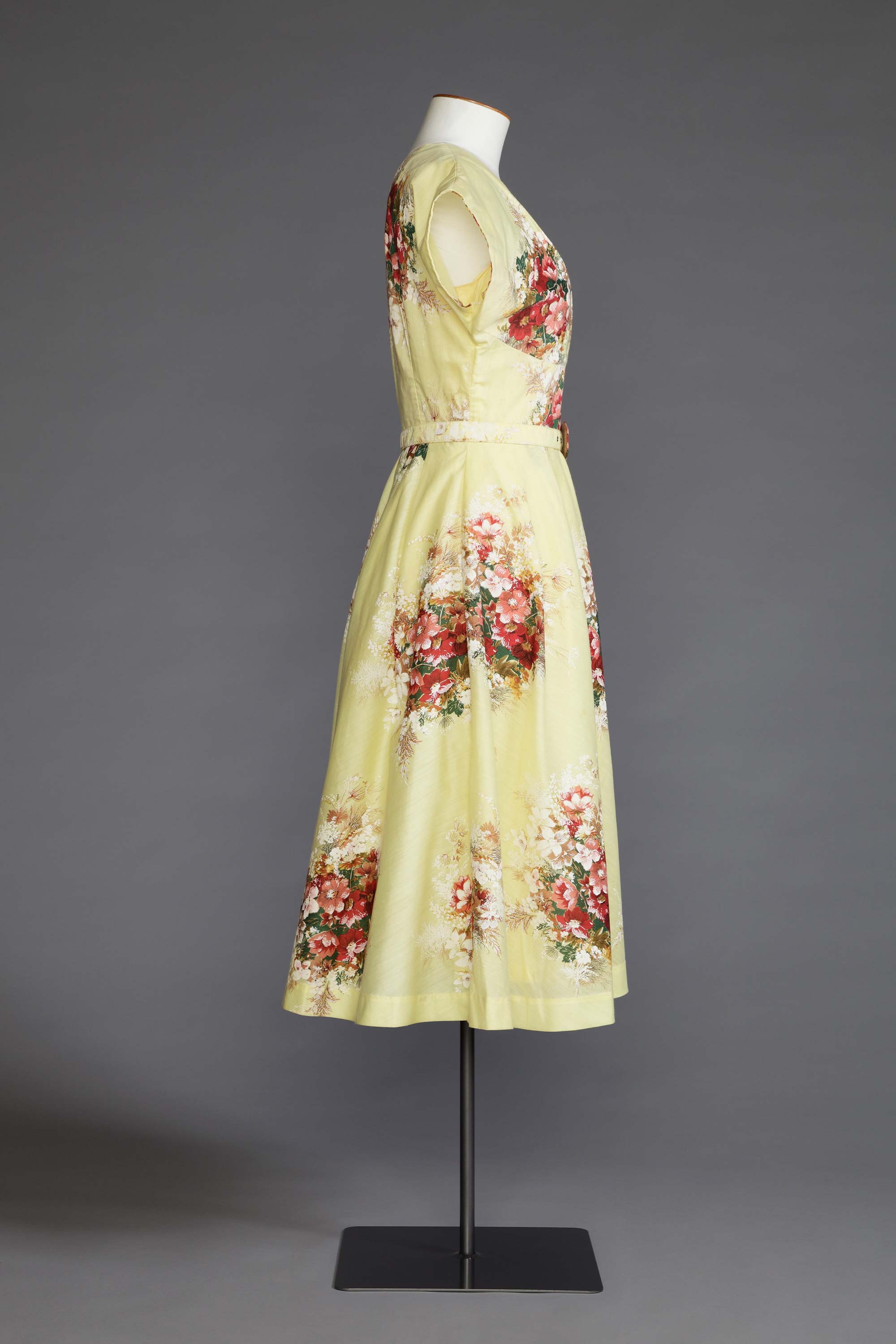 Grace Andrews (nee Furniss) was born in 1920 in the small town of Piopio, south of Te Kuiti. One of eleven children, Grace went into domestic service at the age of 13 to help support her family. Determined to change her circumstances, at the age of 19, she began studying in the evenings at the Hollywood School of Dressmaking on Auckland’s Queen Street while continuing her domestic work during the day. Her new skills enabled her to establish her own dress making enterprise in her home town. Marriage in 1941 brought an end to her business as it was customary for married women not to work. However, Grace continued sewing made-to-measure daywear, wedding and occasion dresses from her home and later, clothing for her four children, until her untimely death at 49. Much of Grace’s work has been given away with only a few pieces, such as this dress, remaining in her family’s care. Read more about the history of home sewing in the New Zealand Fashion Museum publication Home Sewn.
