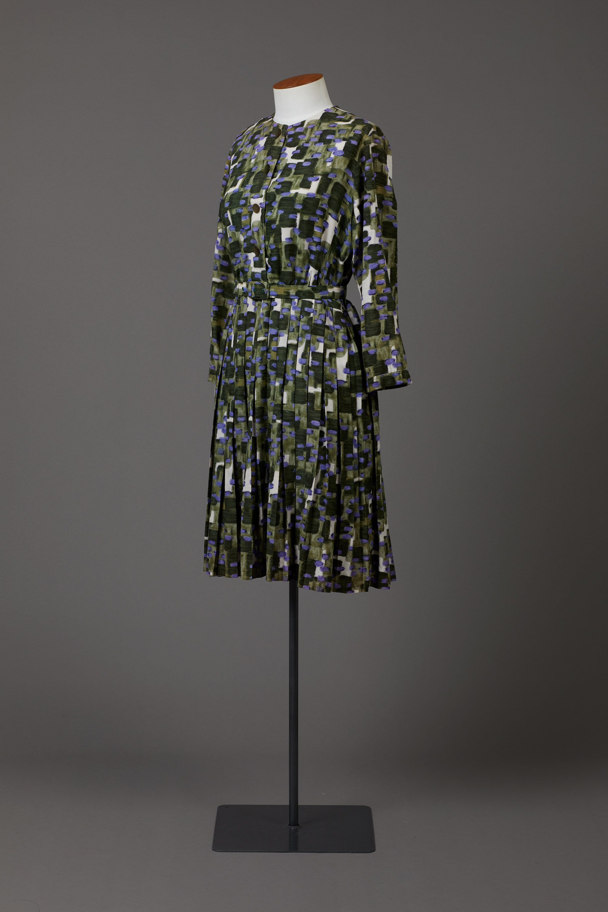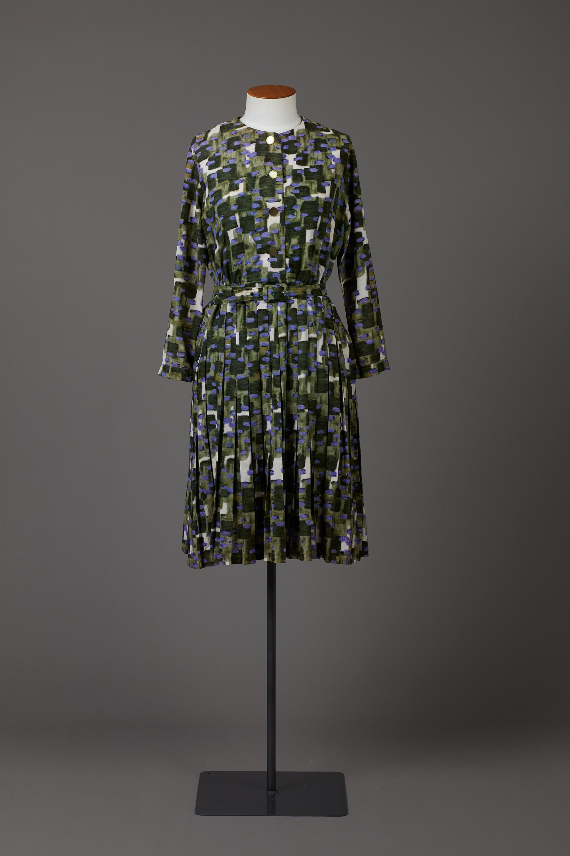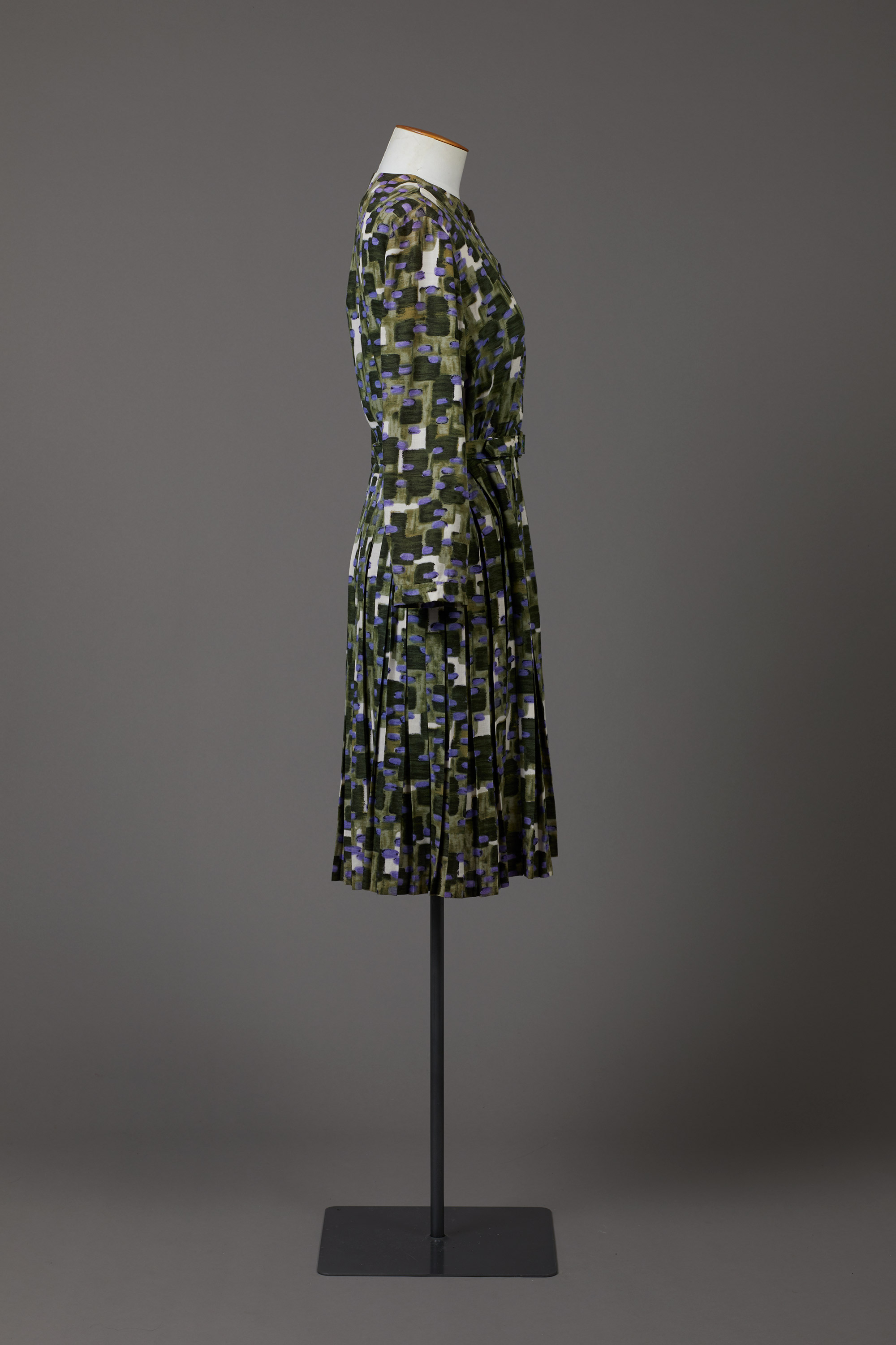 The dress has a self-fabric belt and pleated skirt.
