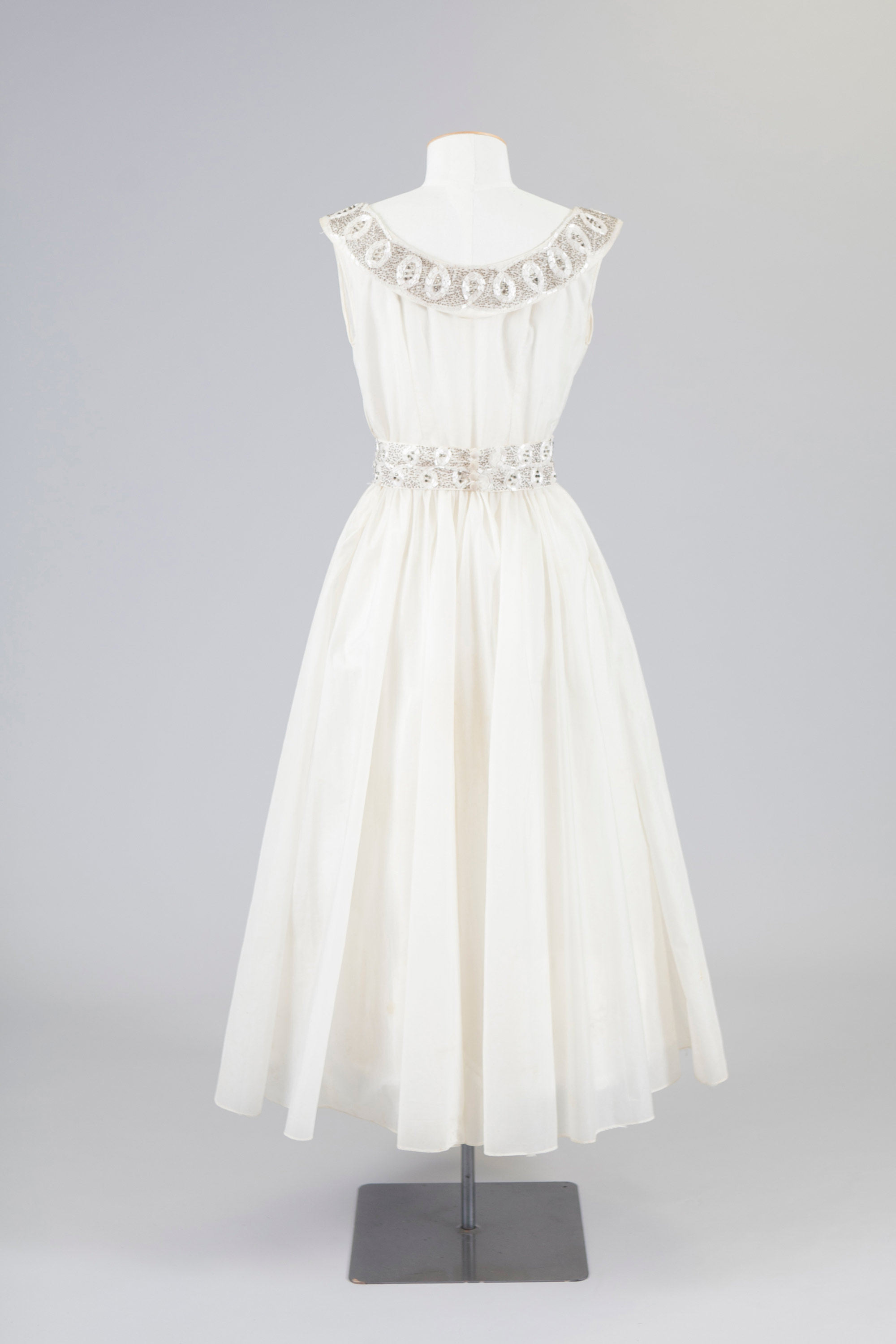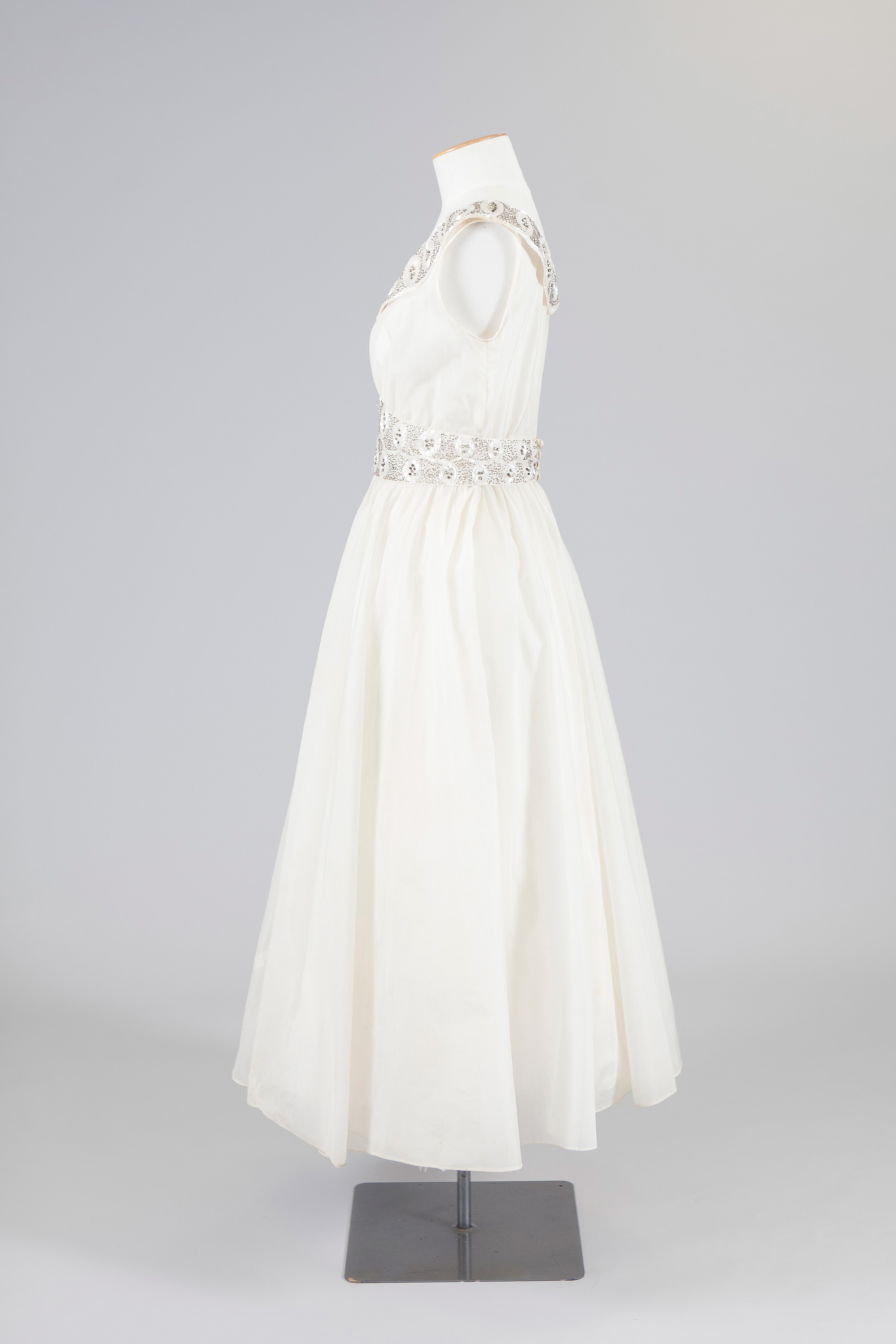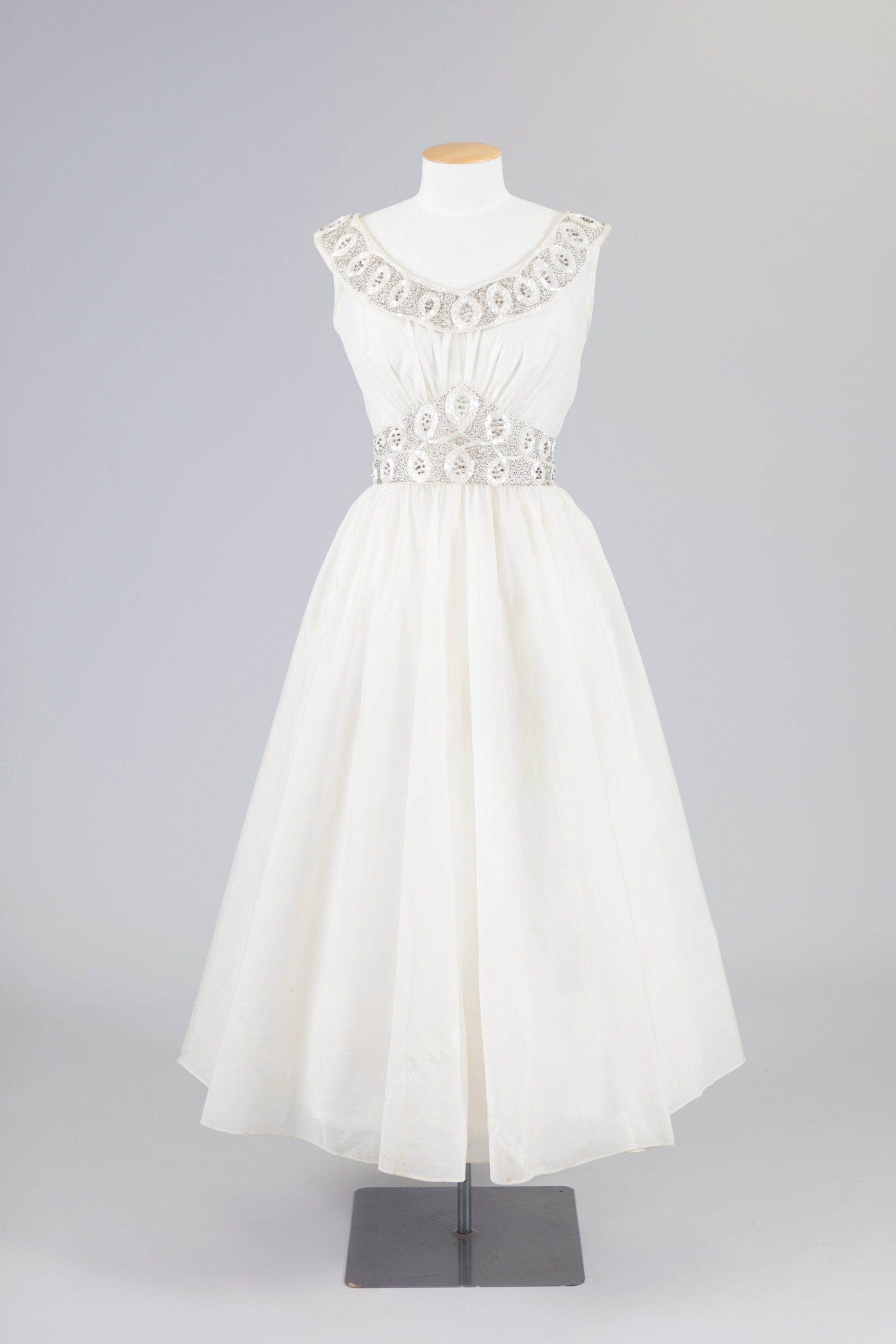 In an era when formal balls were part of the social calendar, the 1950s’ dress came into its own at night. The sheer volume of taffeta, silk organza, tulle or flocked nylon used in the skirt (calf-length or full length) gave it a balletic quality.