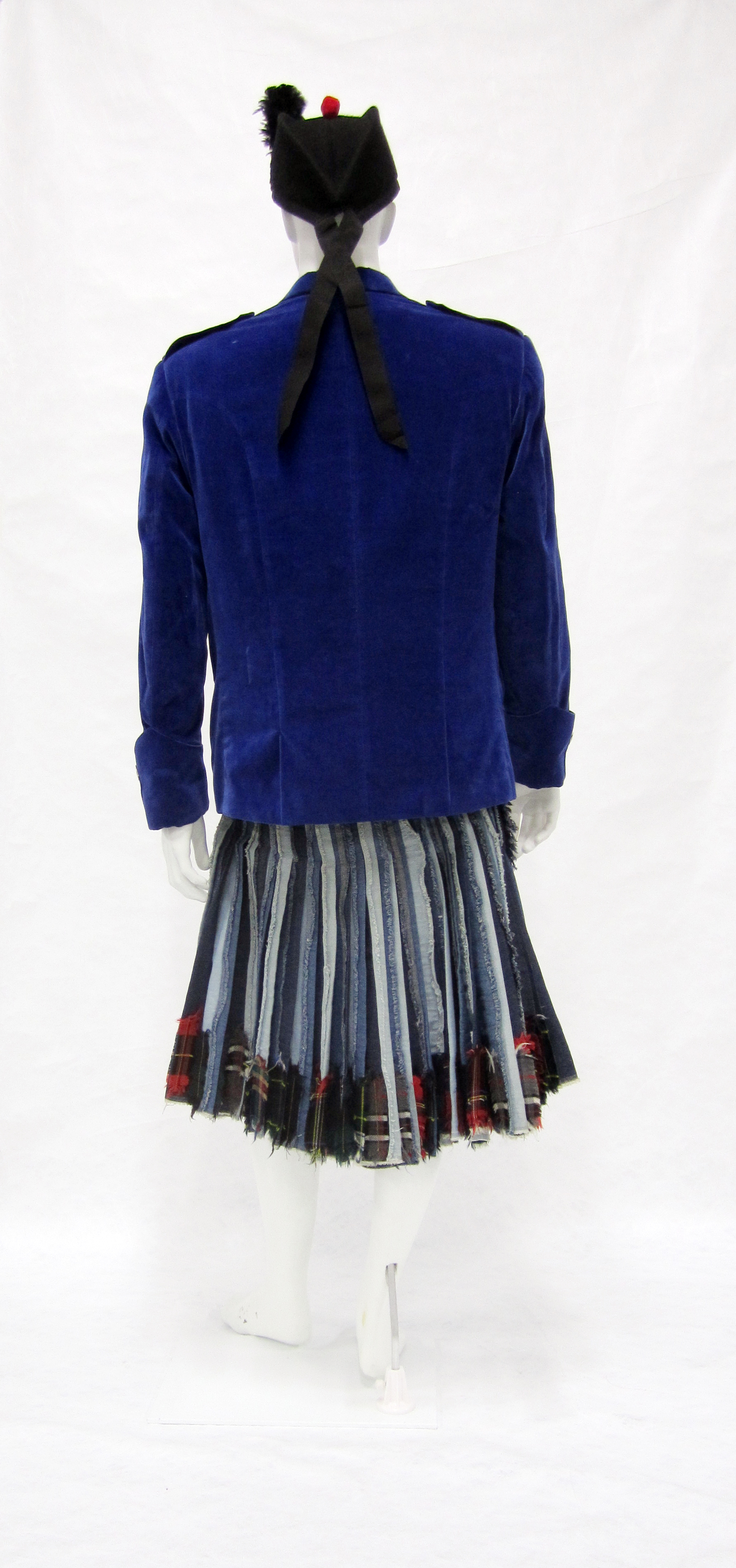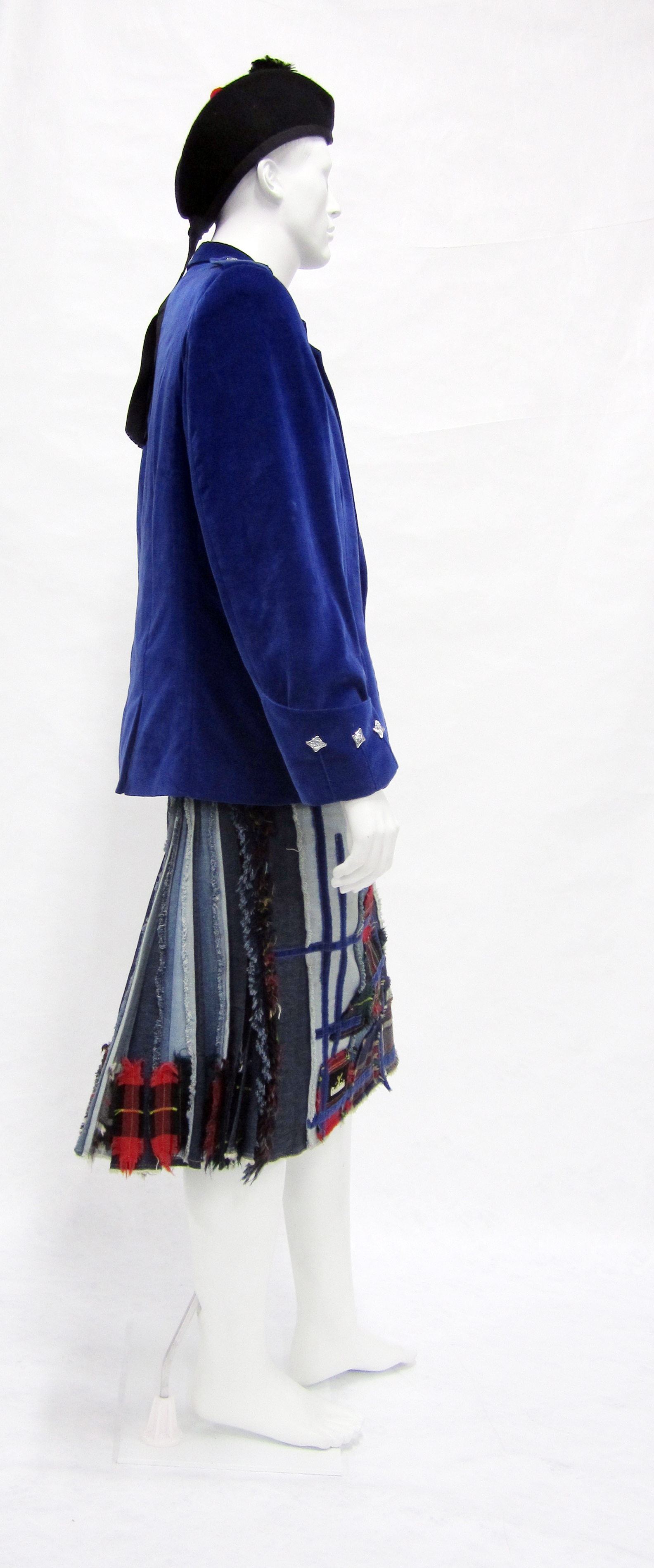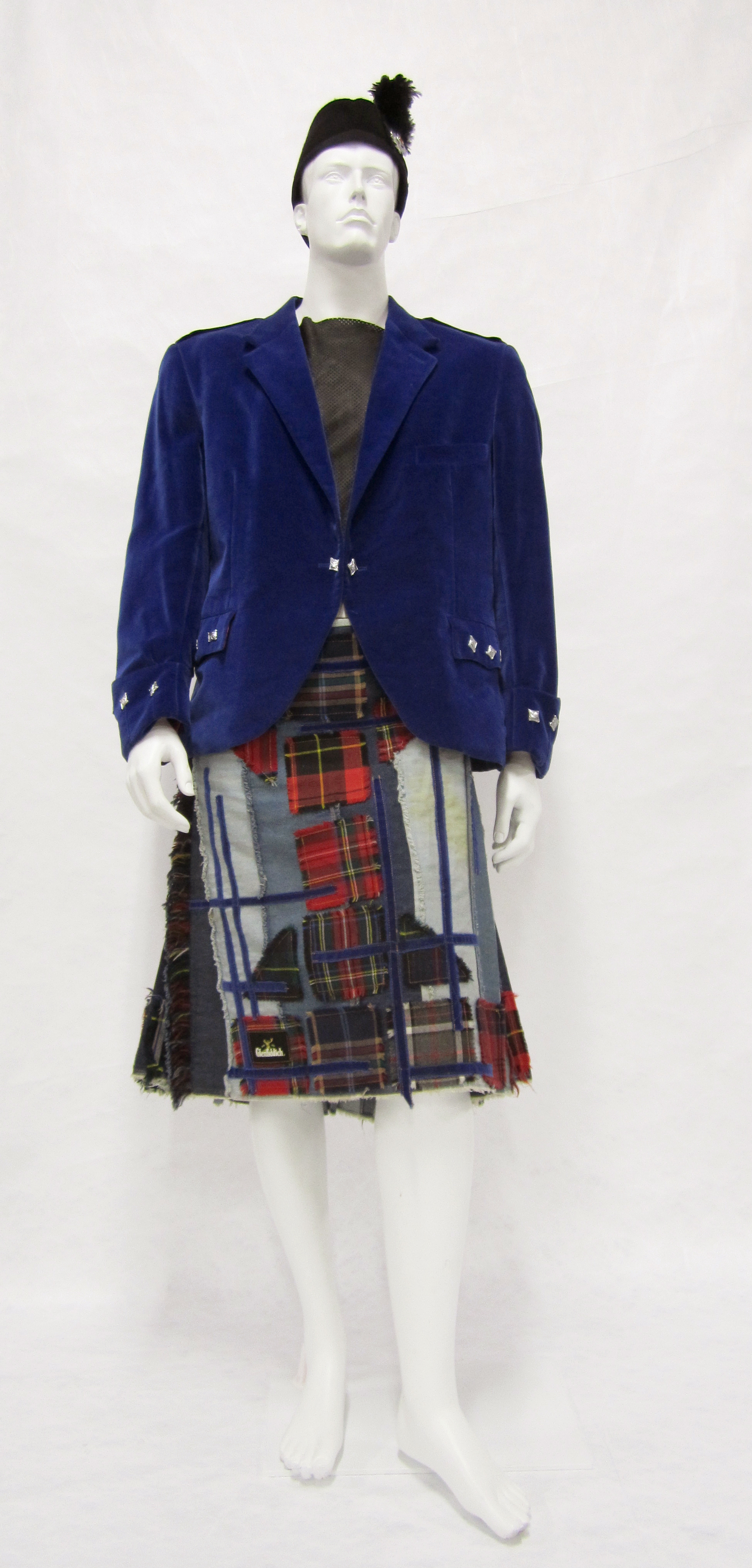 Grant Mahy trained as a kilt maker. Once he had mastered the traditional techniques he began incorporating unusual materials into his designs with great success. This kilt is fashioned from recycled denim, wool and velvet; following the conventions of kilt construction but challenging expectations. It is worn with a vintage black wool piper's hat (originally worn by his father), a slightly subverted velvet jacket and a buckled top made of perforated leather.