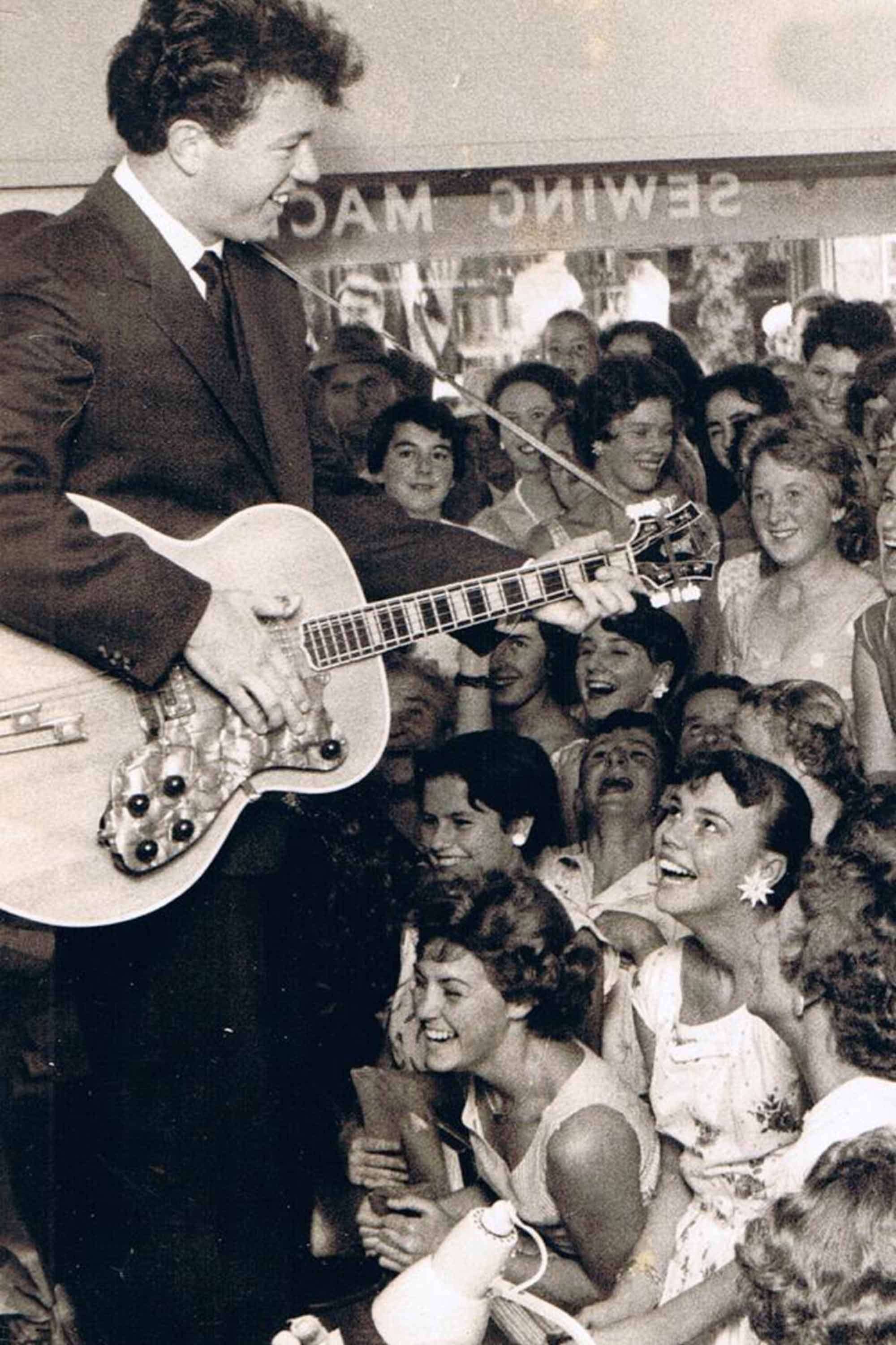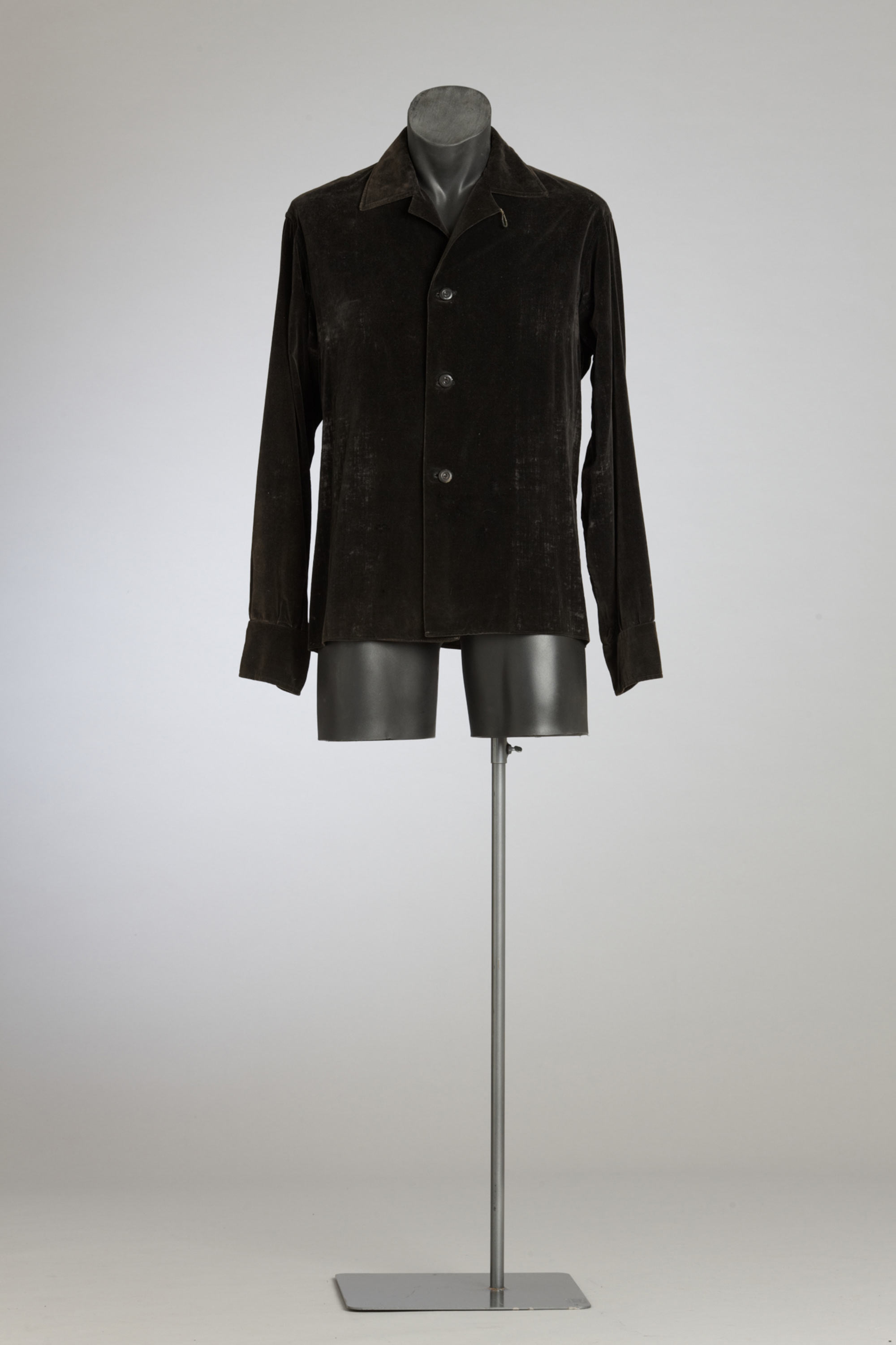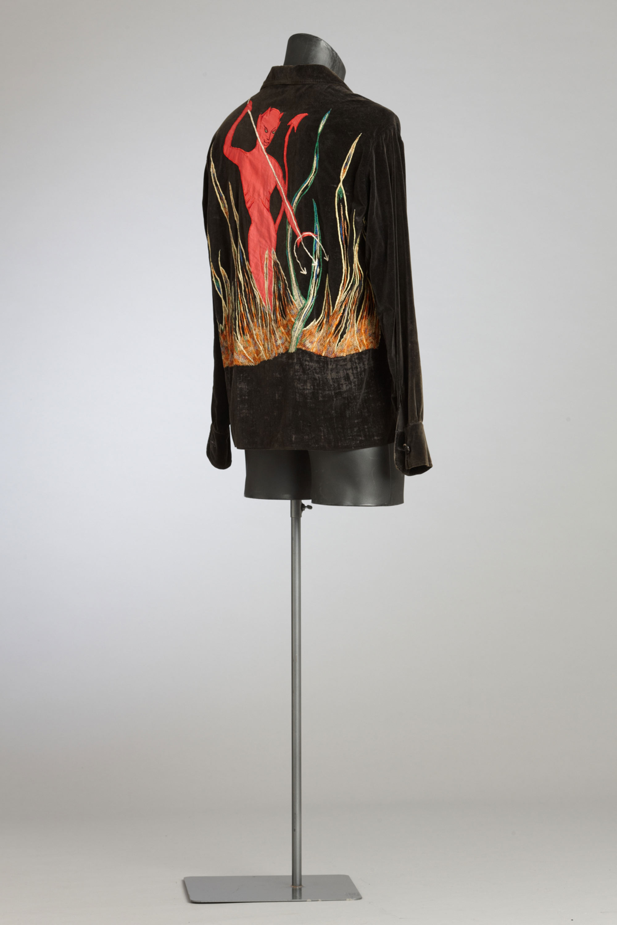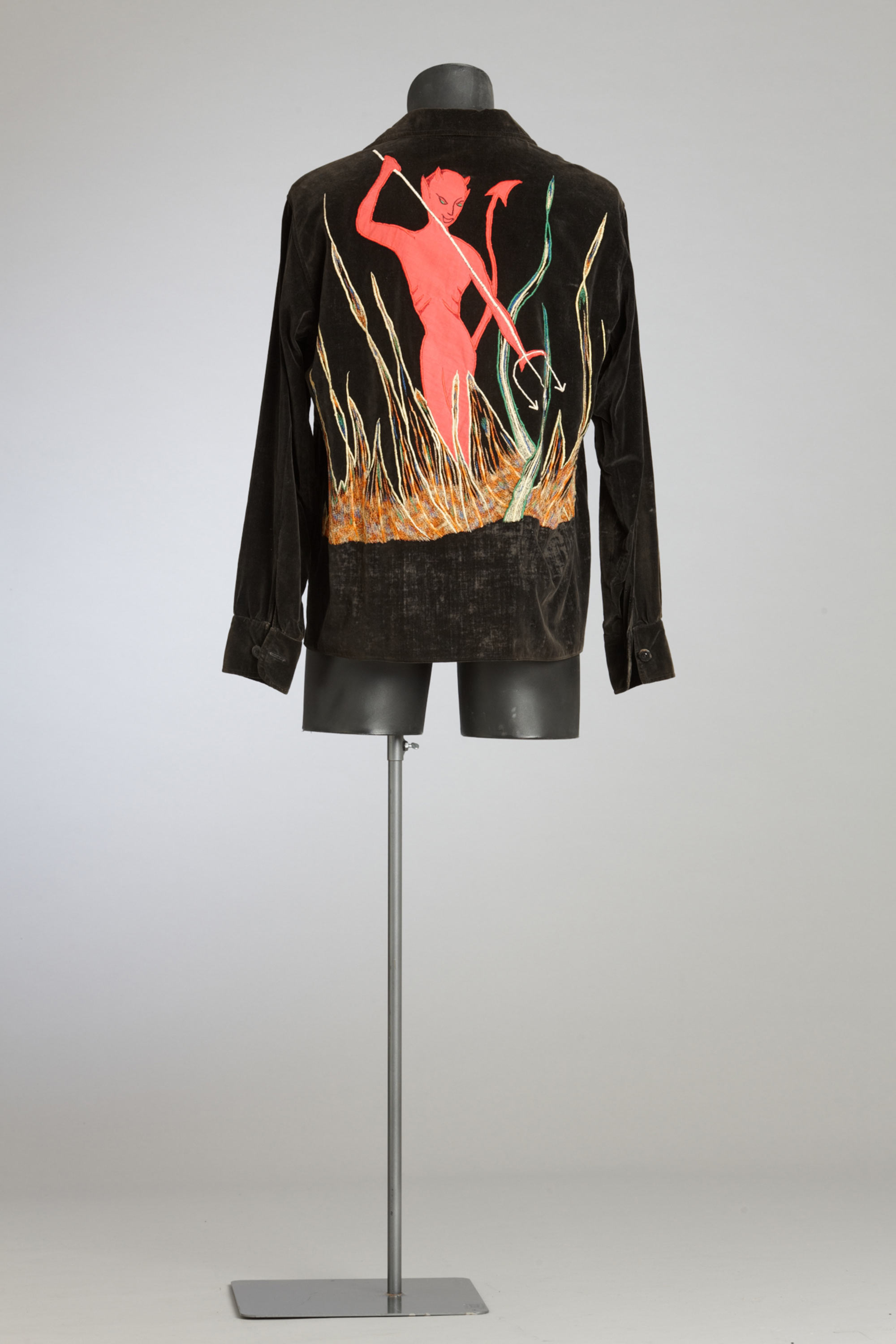 Whanganui boy Johnny Devlin was New Zealand’s first rock 'n' roll star, attracting legions of screaming fans at concerts around New Zealand and Australia. With the reputation of one of New Zealand's best drummers, Tony Hopkins was recruited to join Johnny's band the Devils before their first tour of the North Island. Johnny had recorded 'Lawdy Miss Clawdy' in rather poor quality in June 1958. His second recorded version with the Devils in February 1959 outsold this two to one, reaching total sales of more than 100,000 and making it the first gold record by a New Zealander. It was perhaps not surprising then that from late 1958 and into 1959, Johnny Devlin and the Devils’ concerts formed a series of near-riots. During the crush after one show, Devlin’s sleeves were ripped off the shirt he was wearing. The resulting news reports, 'Girls Fight Over Singer’s Shirt', encouraged further trophy-seekers. By contrast, Tony’s shirt, displayed here, was made, rather than destroyed, by a fan from Whanganui. She made five shirts, one for each member of the band including Devlin, and these accompanied the band around New Zealand, and to Australia, where they opened for the Everly Brothers in Sydney, Brisbane, Adelaide and Hobart. After many years away from New Zealand, playing with American musicians including Fabian, Tony returned to find his mother had been wearing this shirt – probably the only surviving one of the five – while gardening. Read more about wearing the colour black in the New Zealand Fashion Museum publication Black: The history of black in fashion, society and culture in New Zealand.