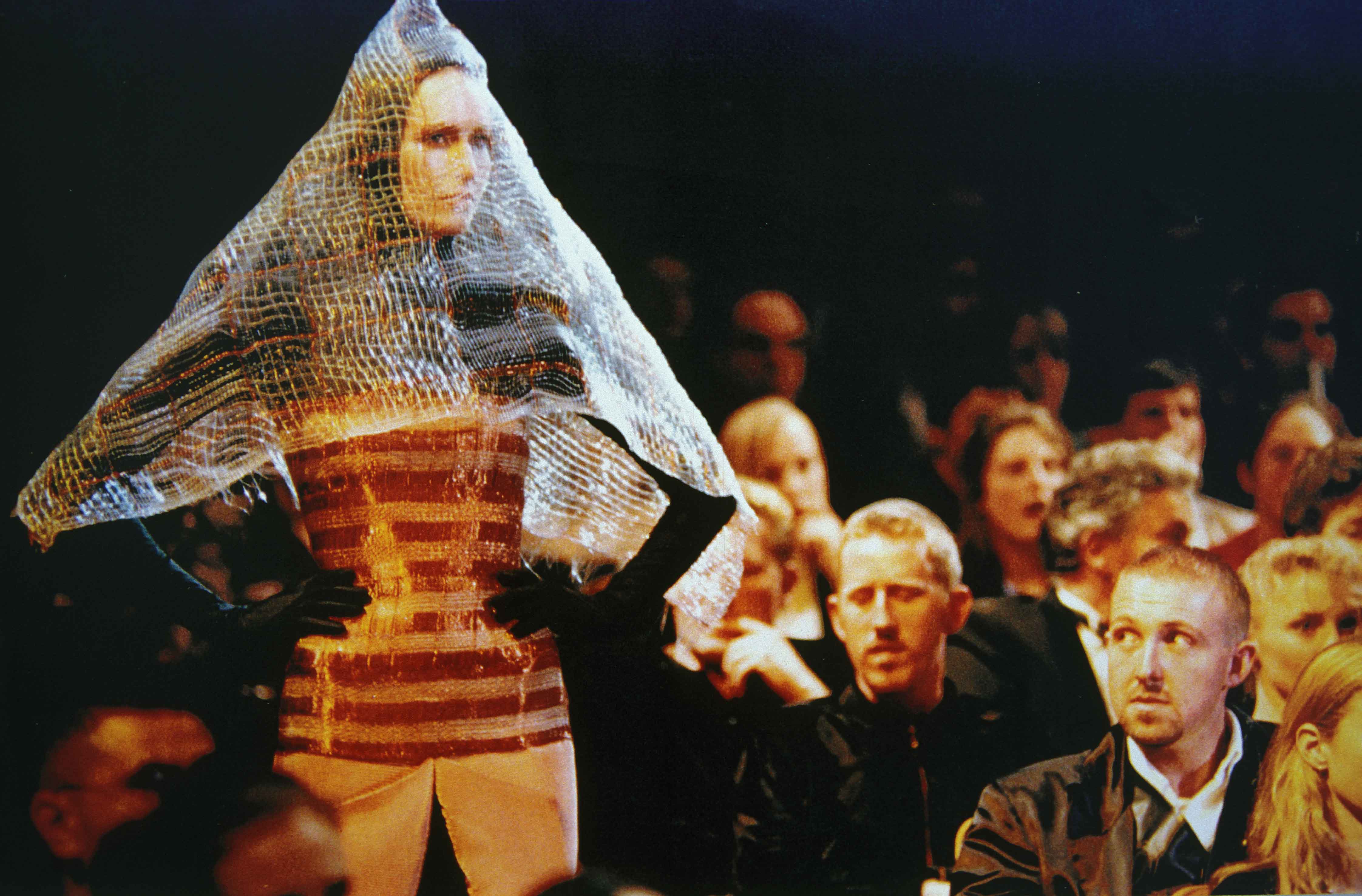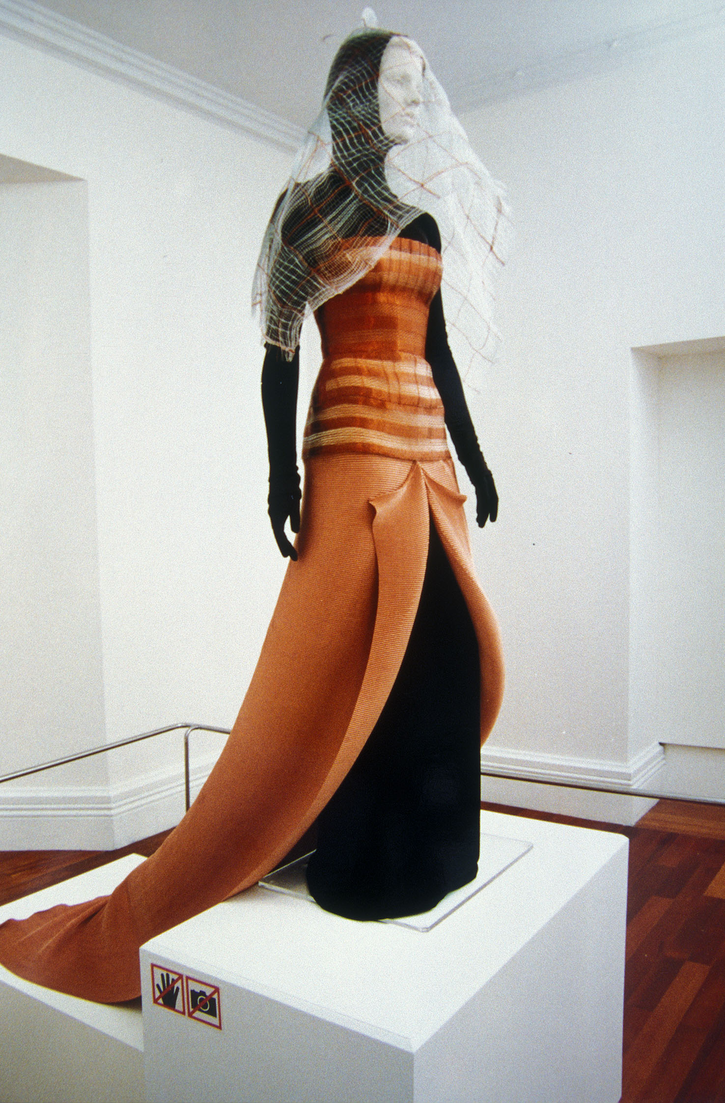Fraser Crowe's 'Dual Outlook' was conceived as a fashion outfit for the year 2005. It is a set of five garments to contain or house the viewer in a 'space' away from the demands of hypothetical ever increasing technological pressures in a future. Combining advances in textile technology at the time and traditional weaving, Dual Outlook consists of five elements. The undergarment, a Lycra sheath, is topped by a 'body shield' in a twill weave of nylon and copper wire. The 'fly sheet' train is made of pleated copper coated polyester and the pyramid shaped visor is woven in a plaid pattern. Black nylon gloves complete the outfit. Dual Outlook won the Supreme Award at the 1997 Smokefree Fashion Design Awards (previously Benson & Hedges Fashion Design Awards). It is now part of the collection at Te Papa Museum.