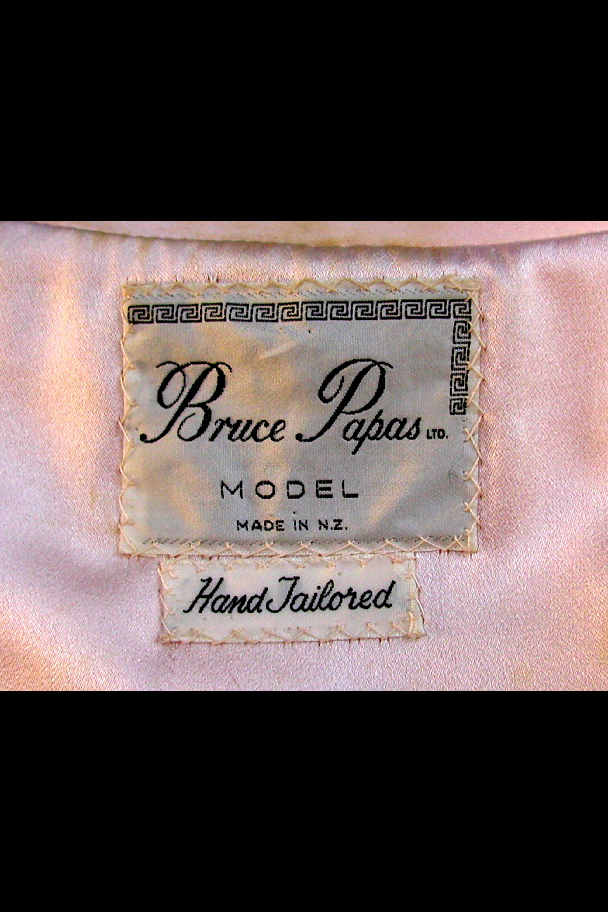 This Bruce Papas model coat is made from pink silk that has been embroidered in gold, beige and pink thread with leaf motif.