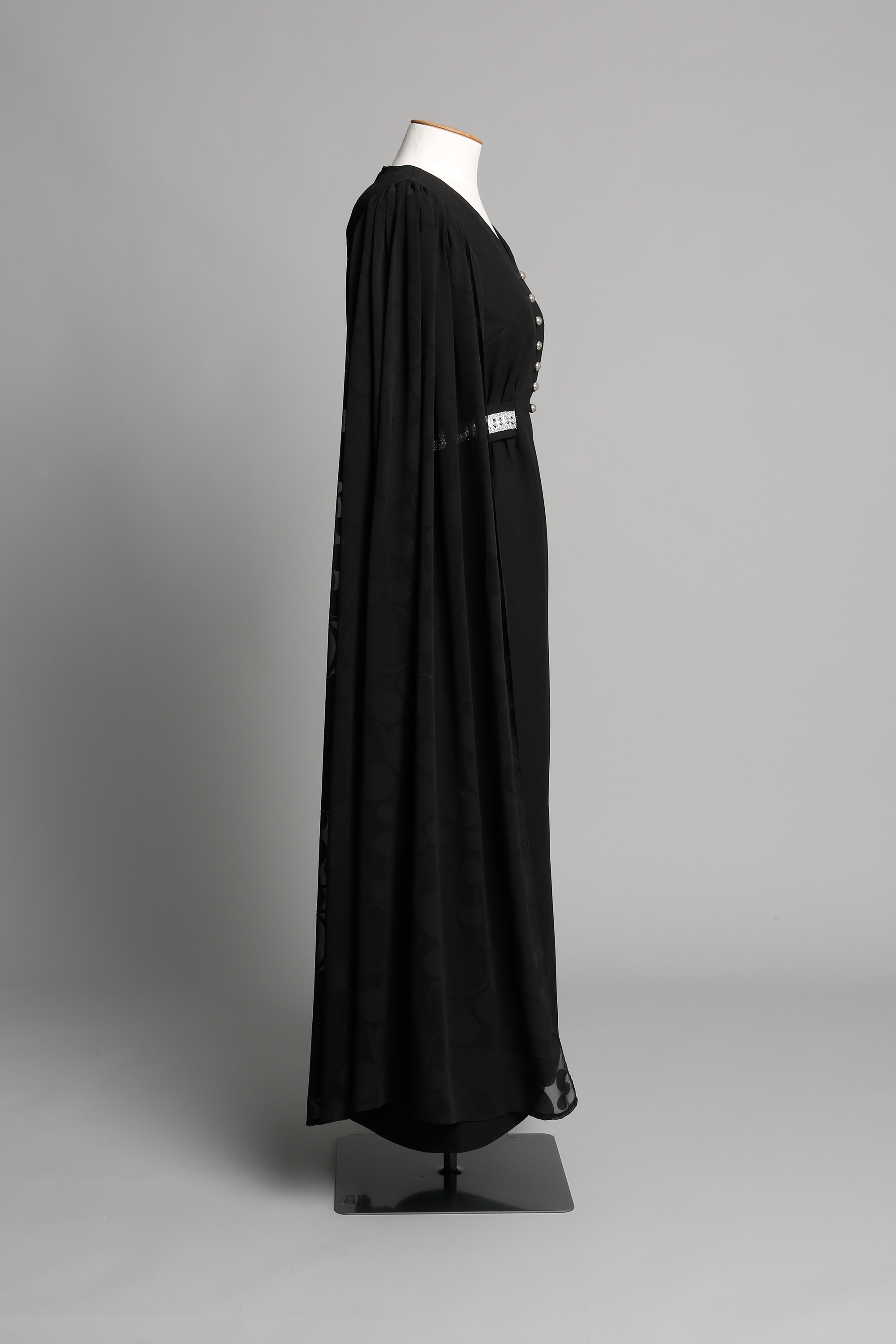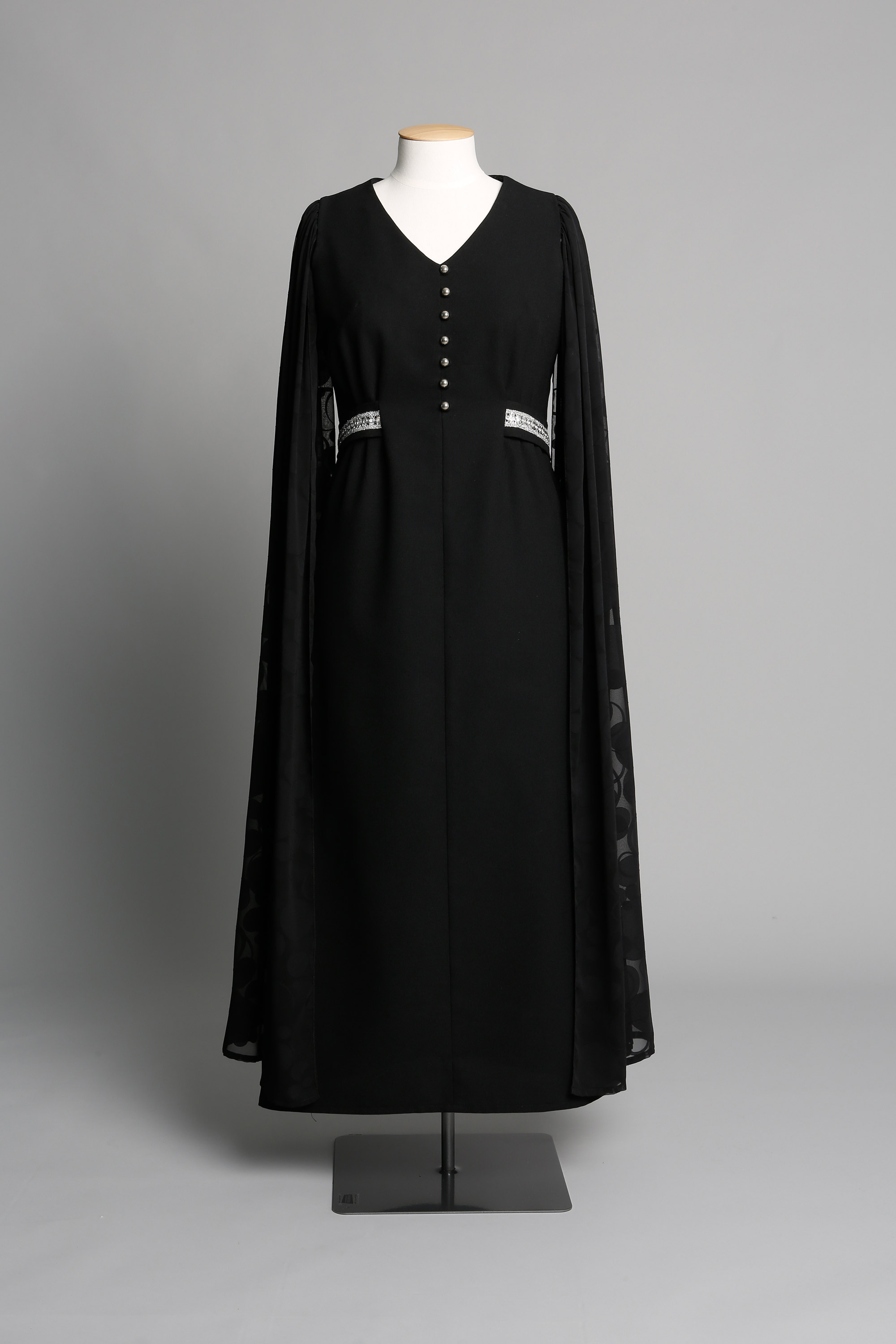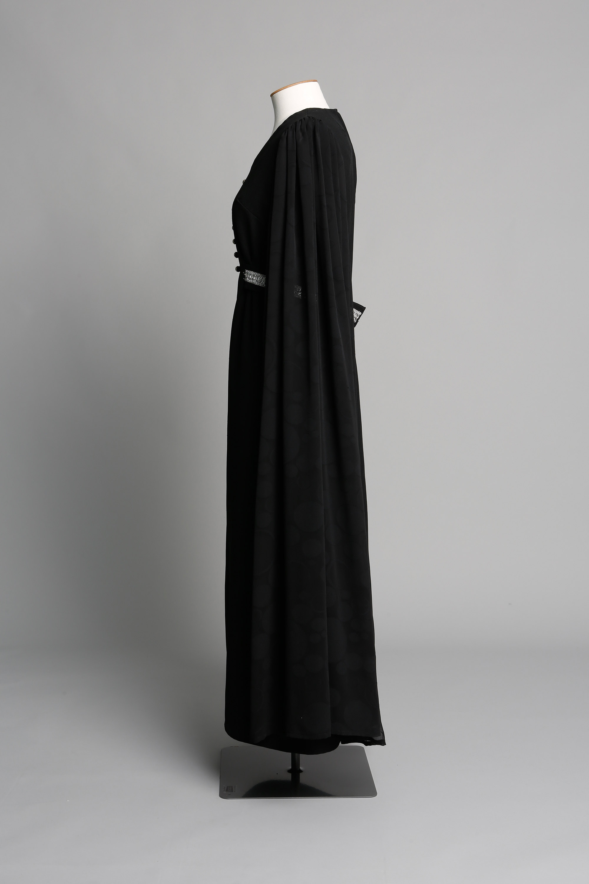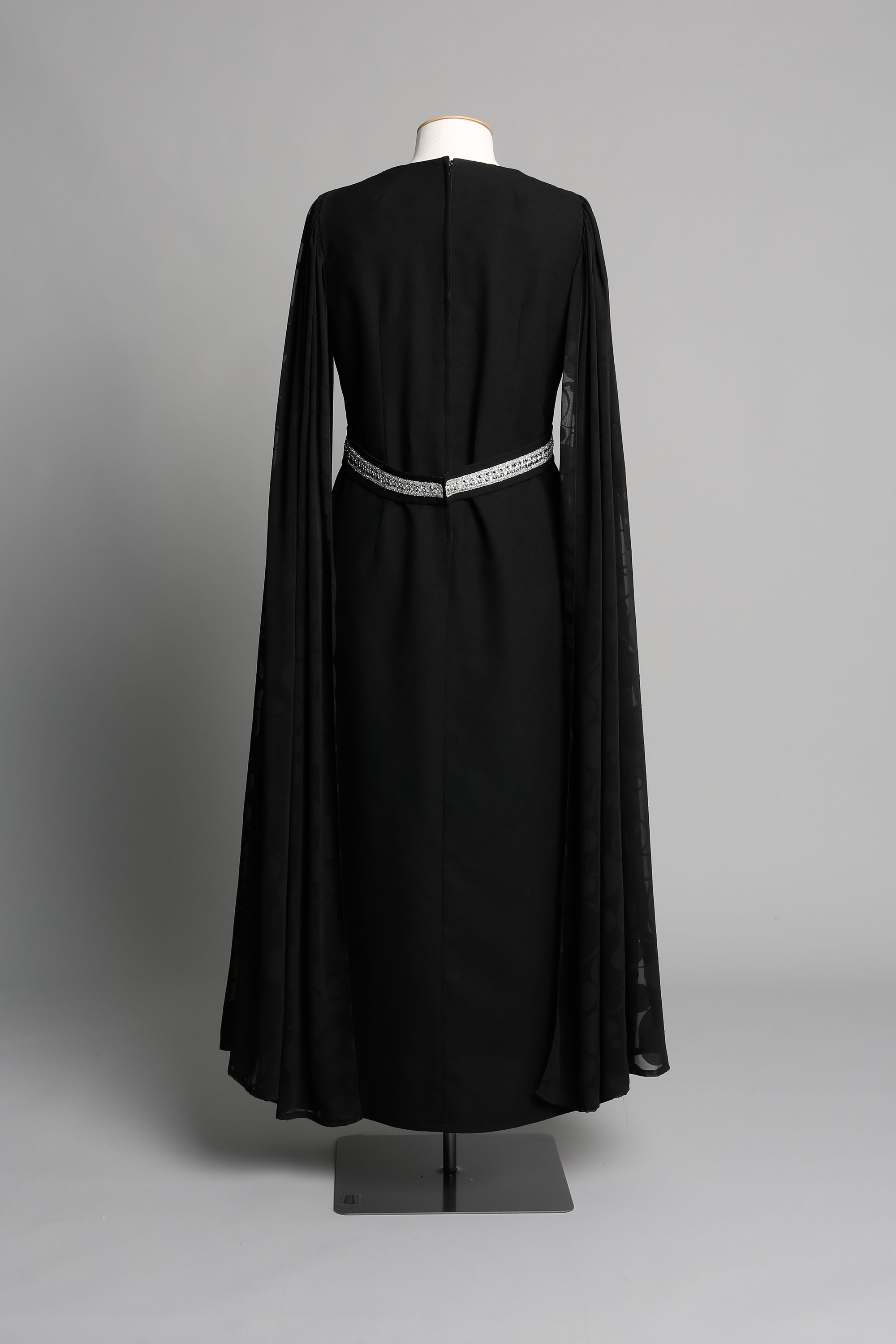 The dress features silver braid on the belt and trailing floor length sleeves in chiffon with a circle motif.